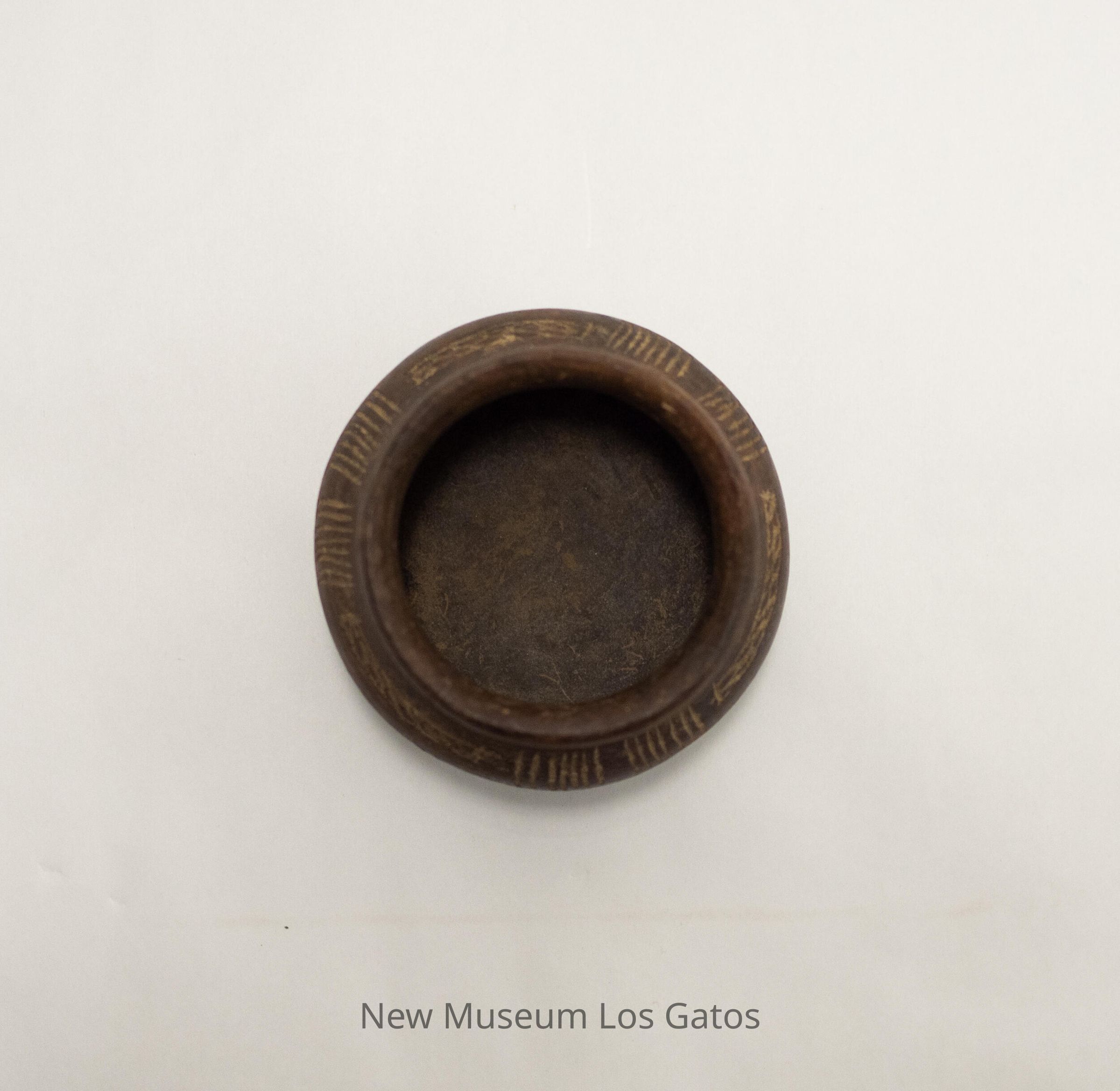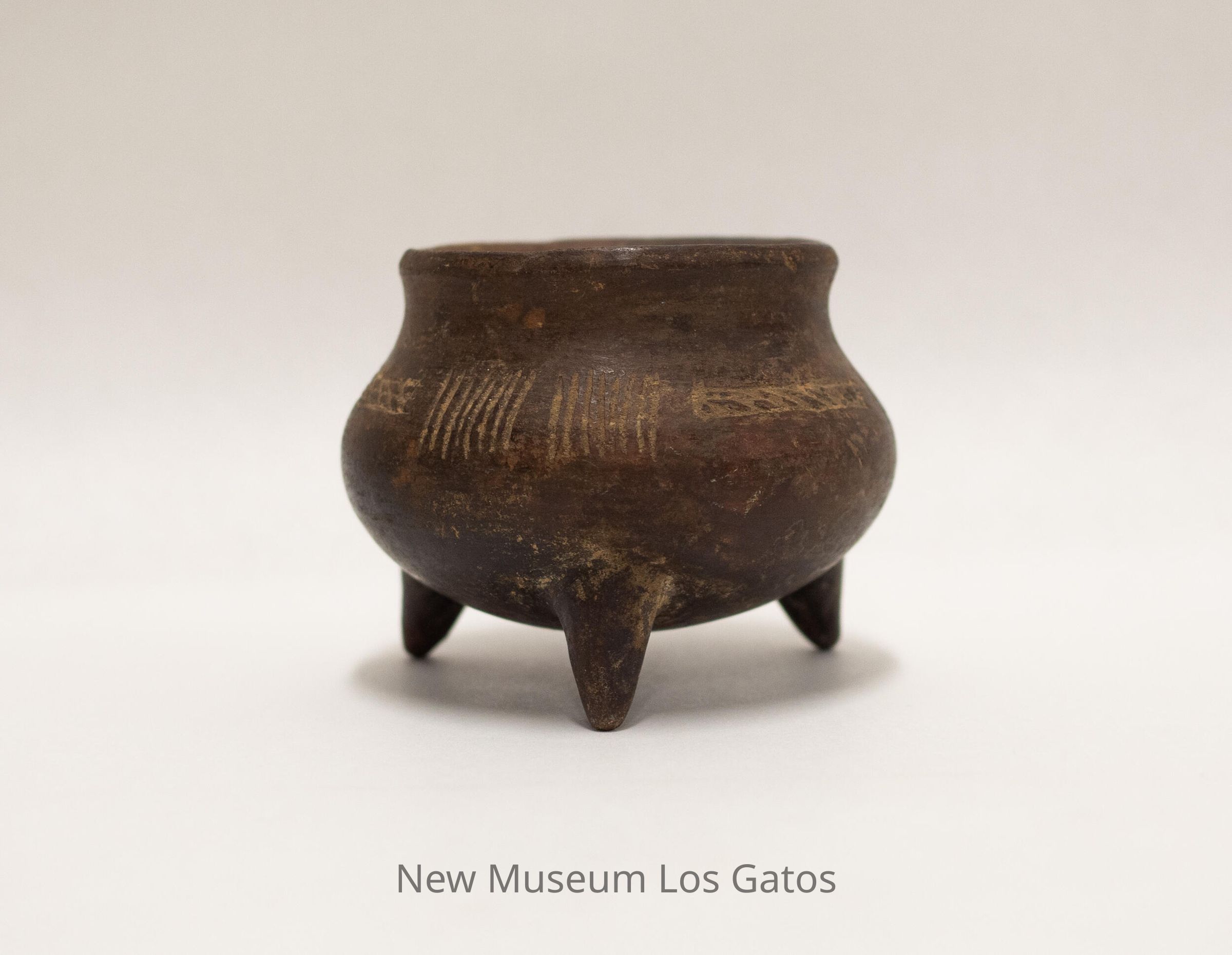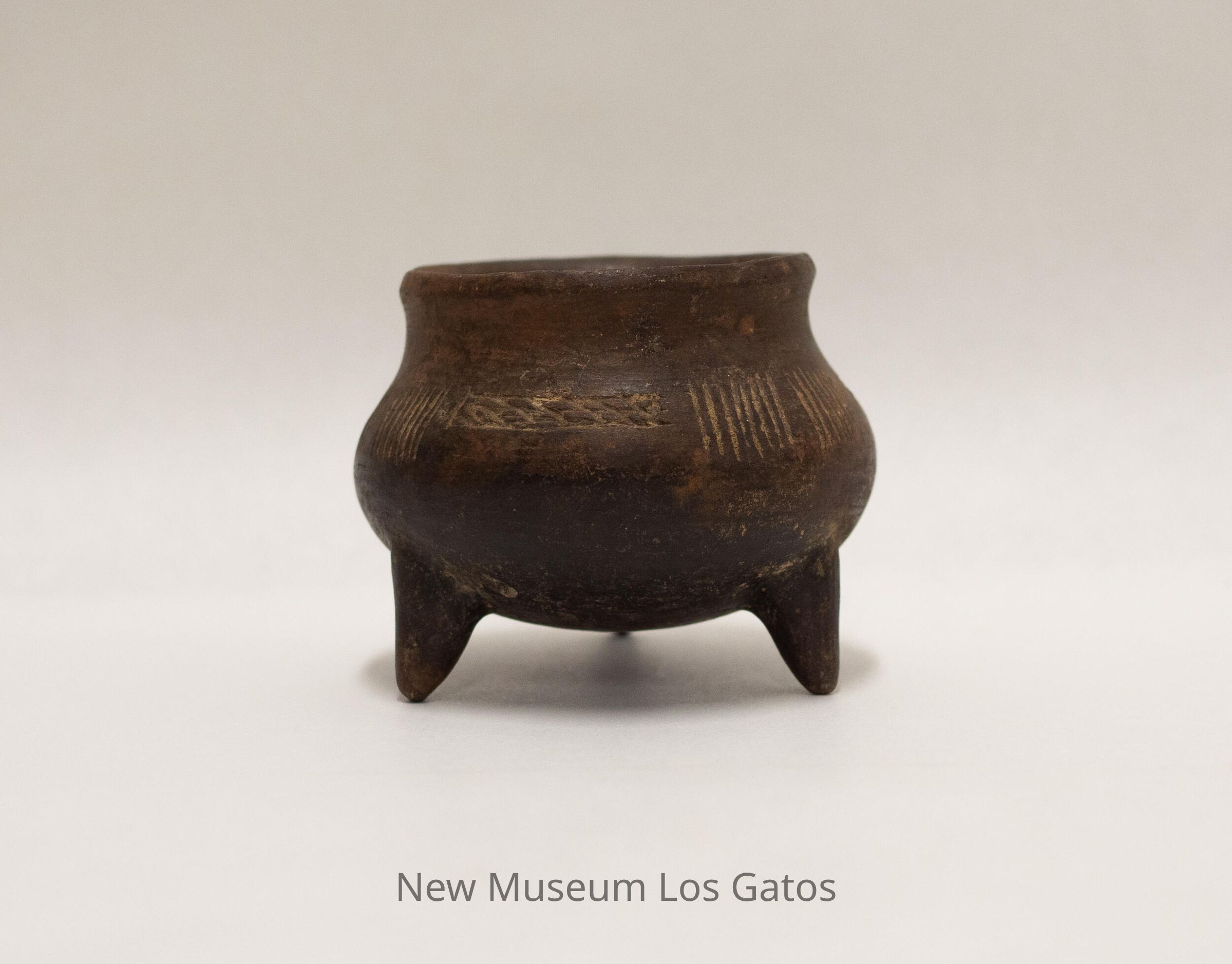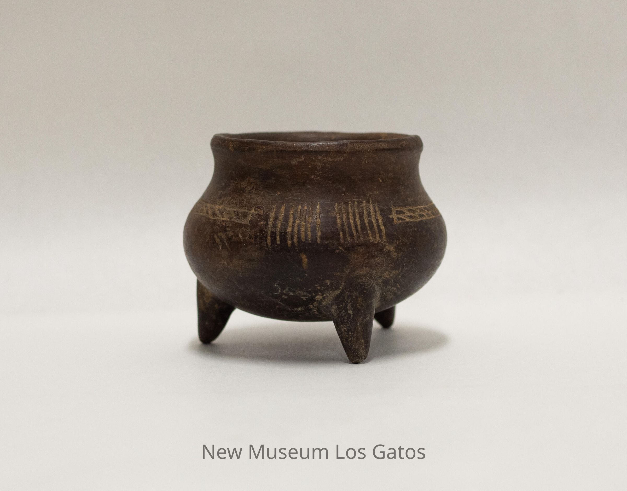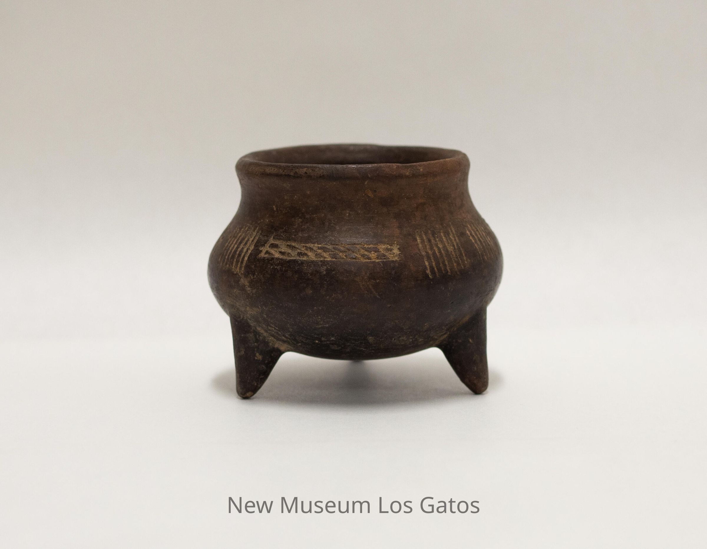 A small, brown clay cooking pot with three legs. There is a decorative pattern around the pot, consisting of two sets of 7 vertical lines separated by a two-row grid pattern.Collection