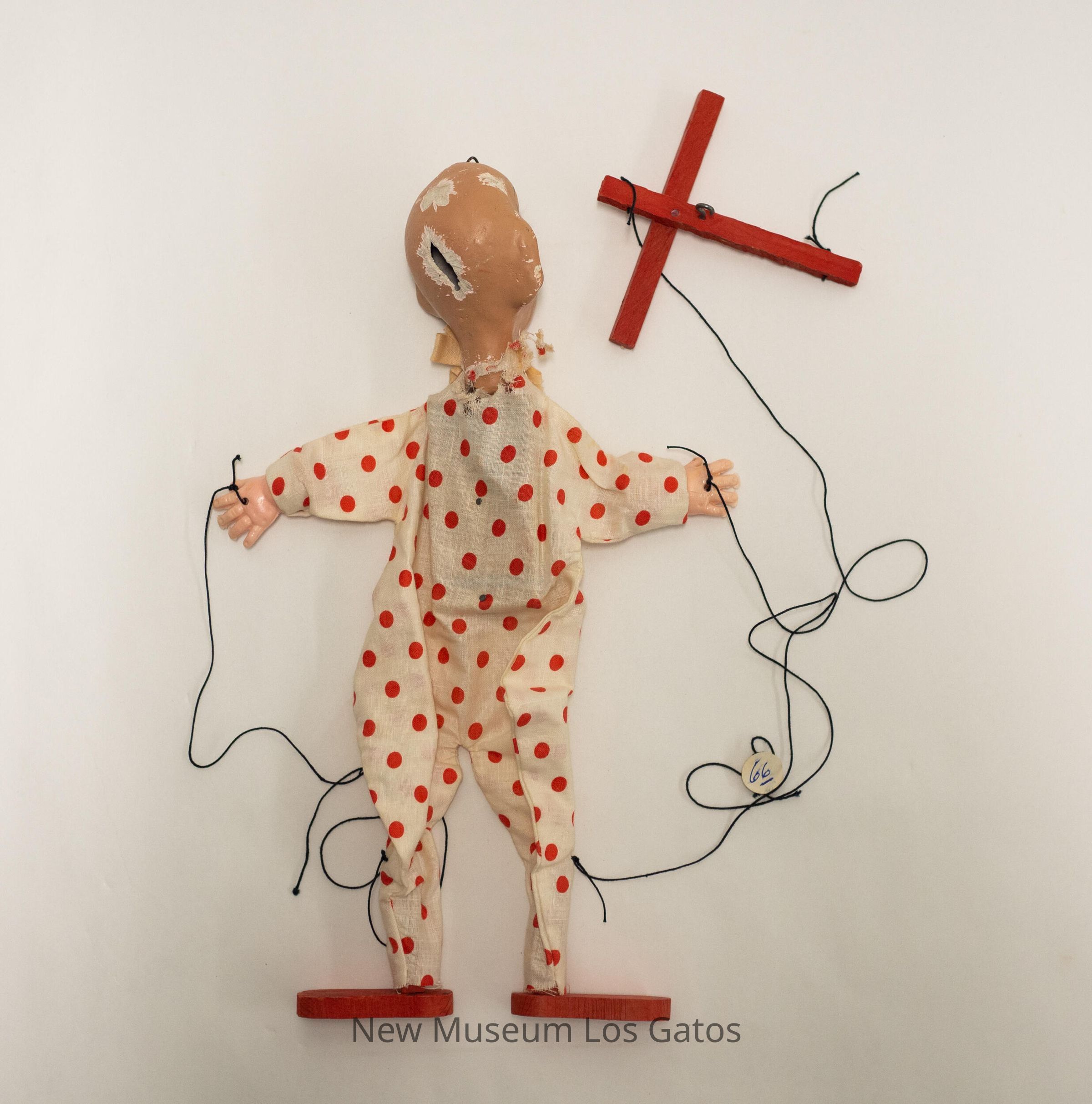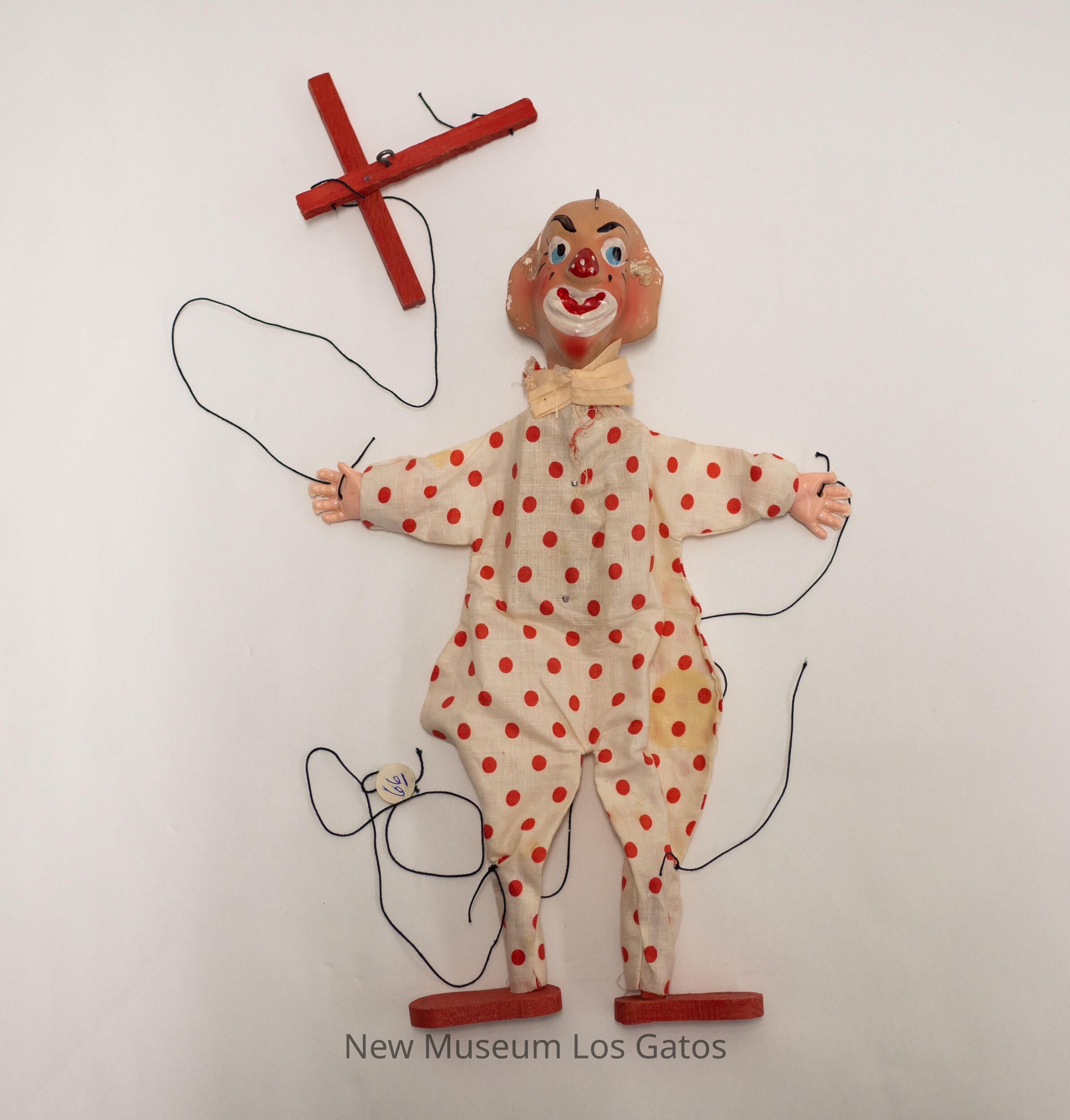 A large, clown marionette. The marionette is wearing red wooden shoes, and a head-to-toe outfit of white fabric and red polka dots with a pink bow tied around its neck. The marionette's face is painted on, and has blue eyes, a red nose with white dots, and a white mouth with red lips. The marionette's limbs are attached via black string to a red wooden cross. There is a sticker with the number "66" attached to one of the strings.Collection