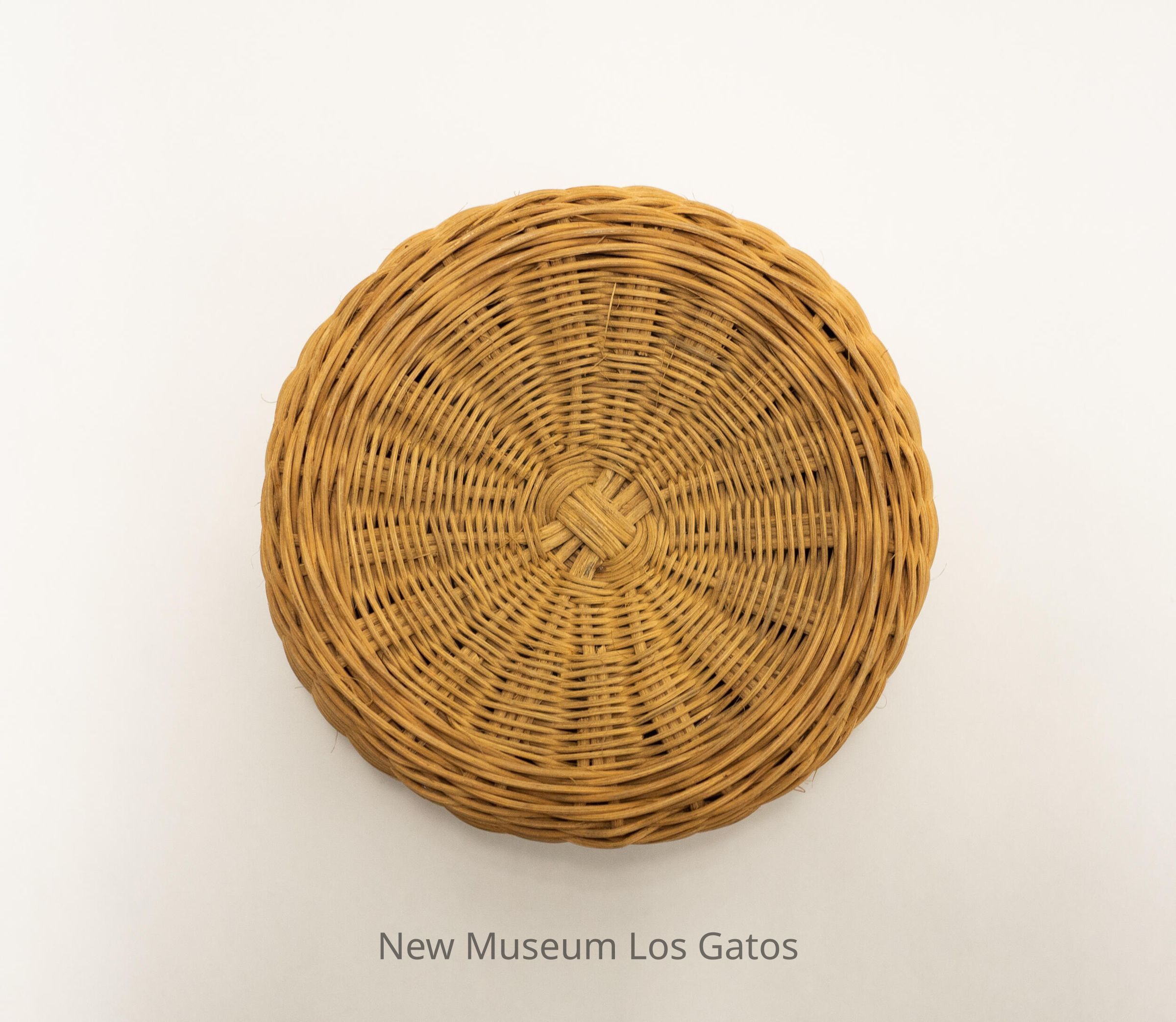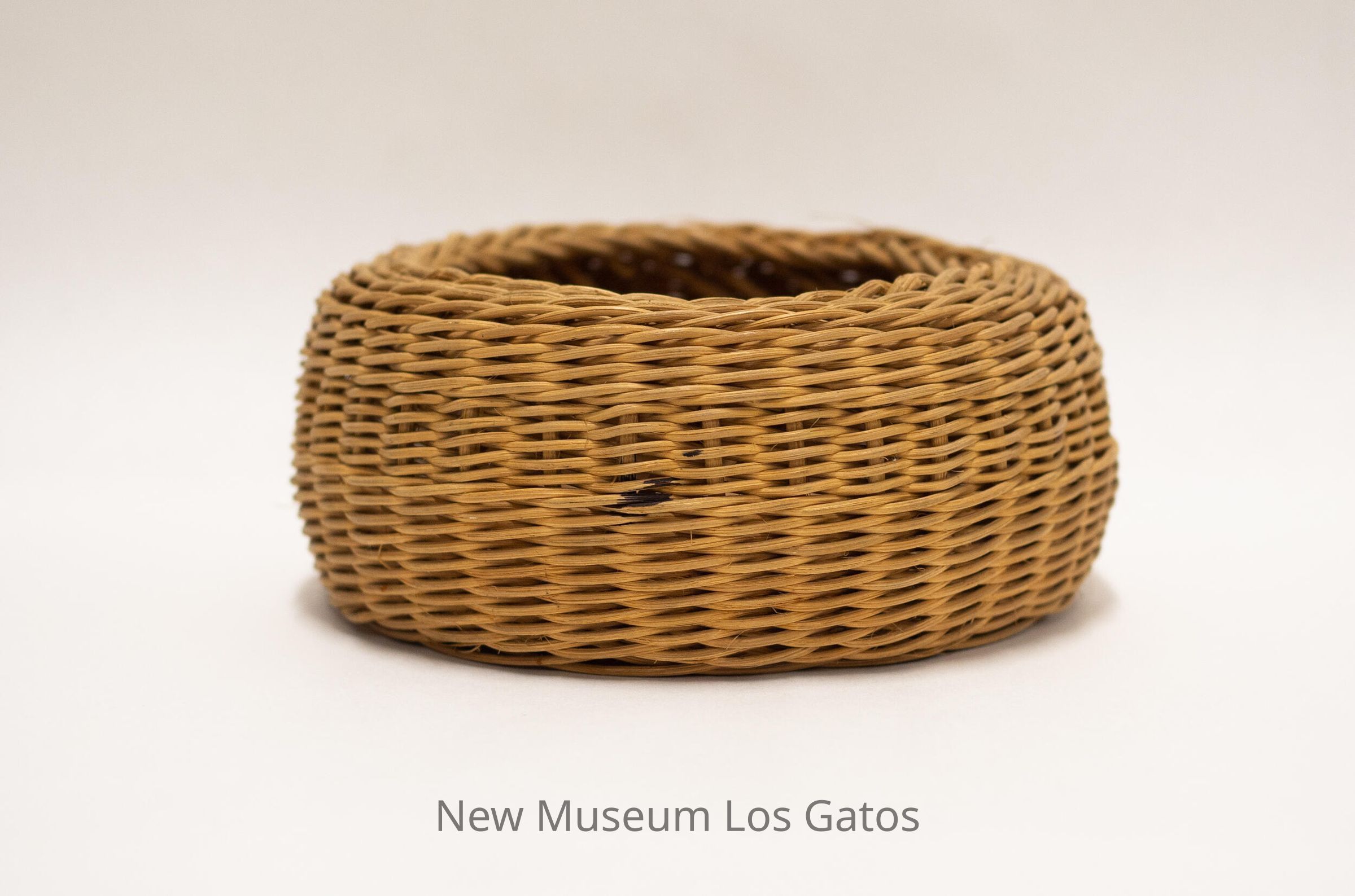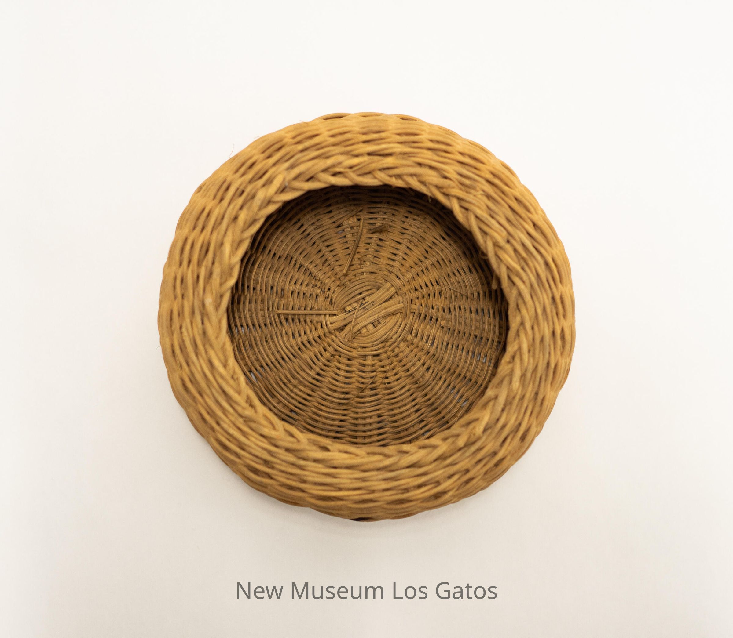 A small, brown woven basket. The bottom of the basket is slightly domed inward, and there is a slightly different weaving pattern that forms a band around the middle of the basket walls.Collection