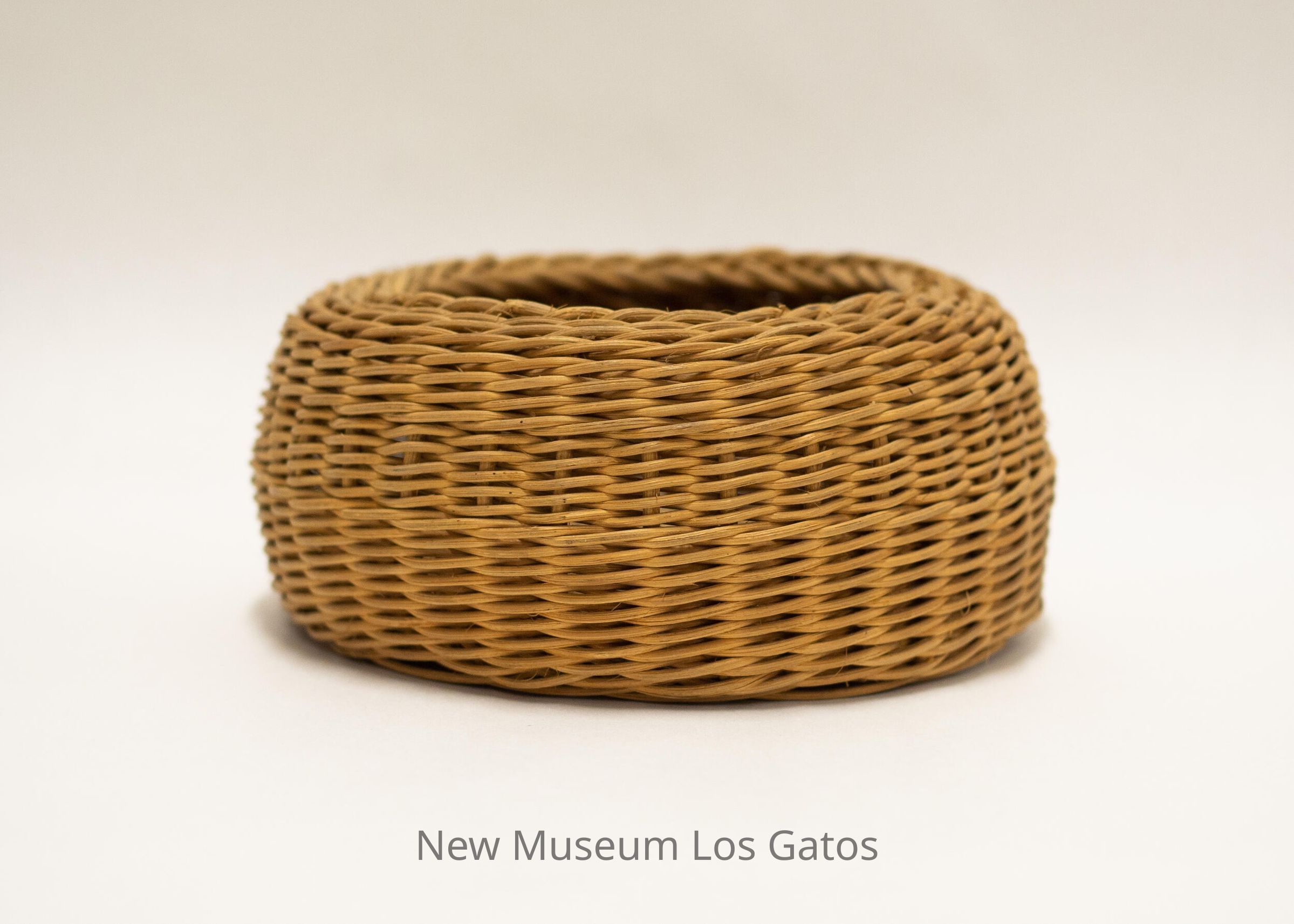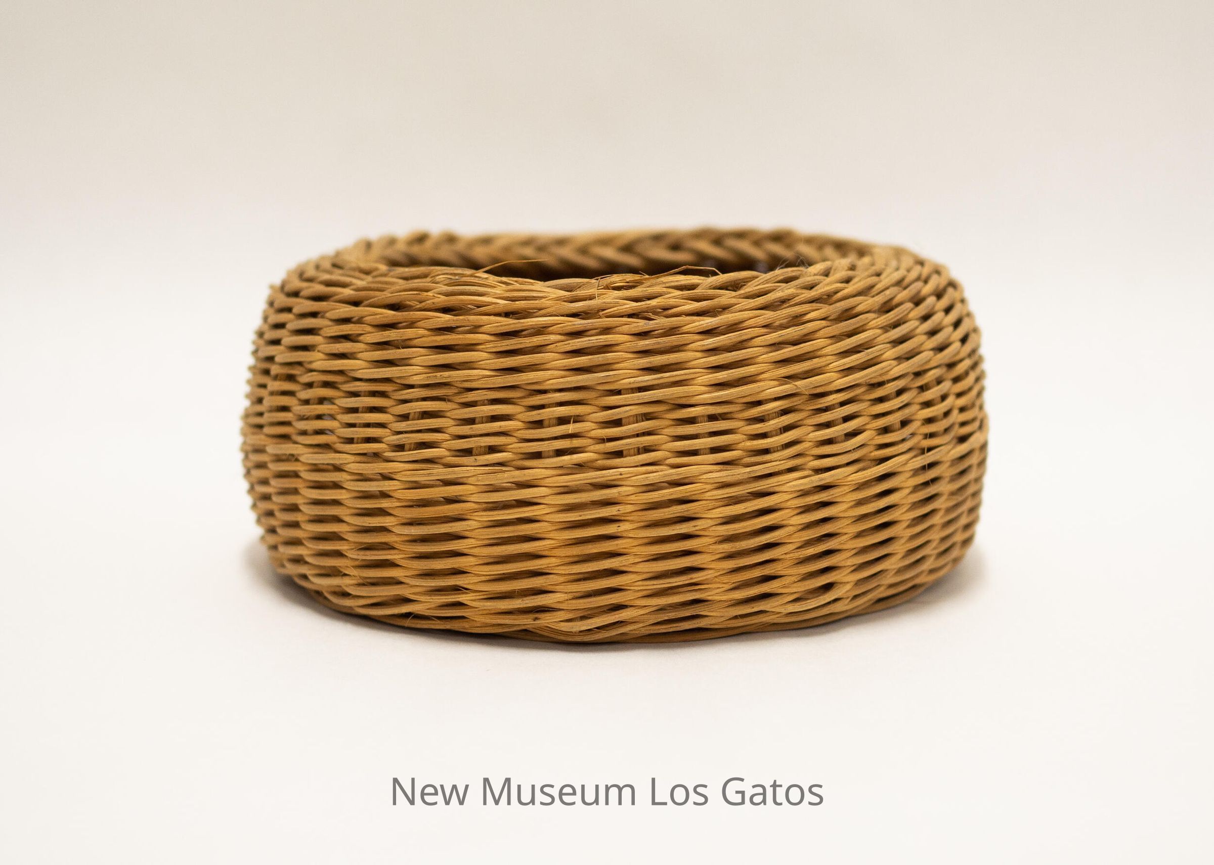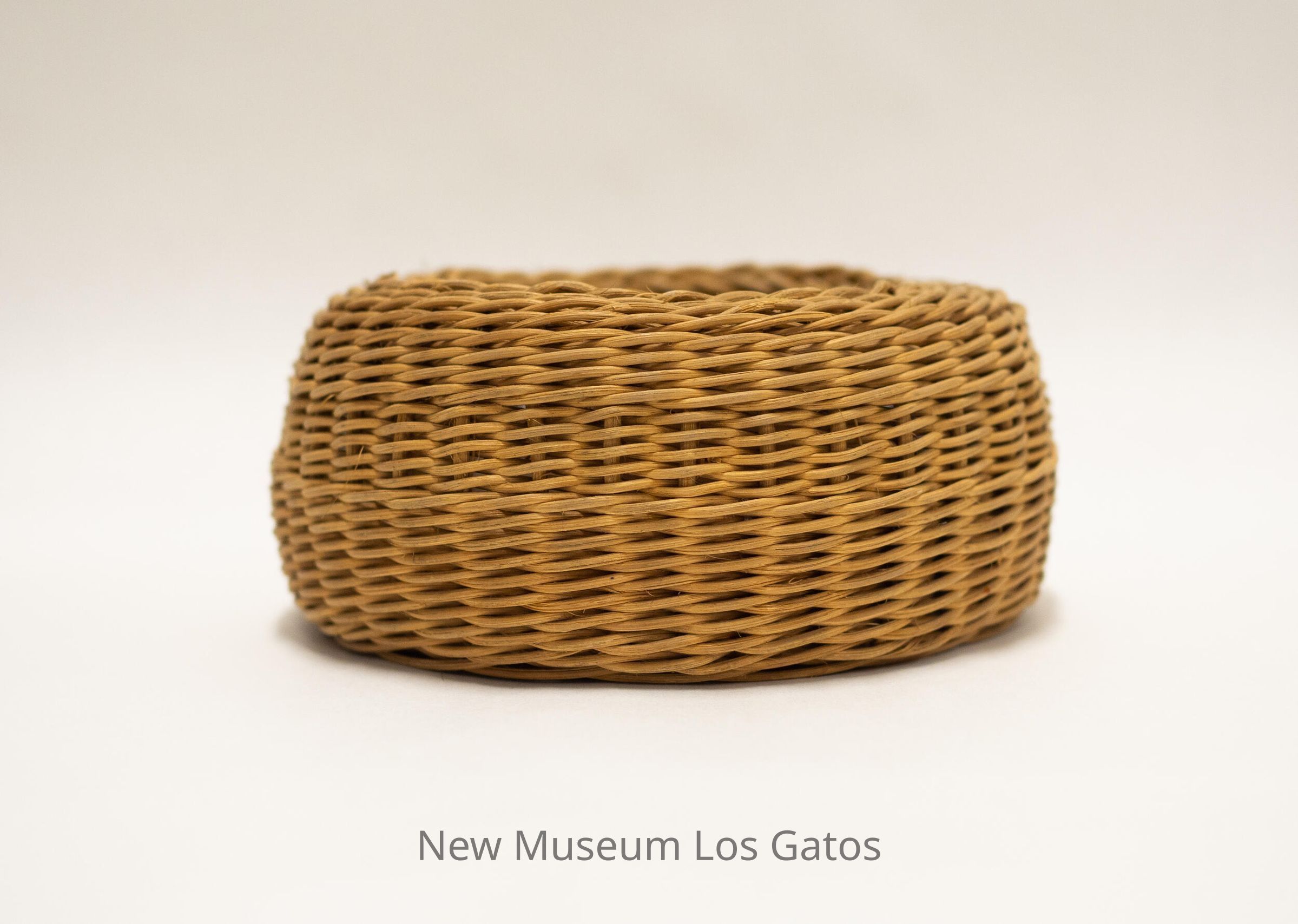 A small, brown woven basket. The bottom of the basket is slightly domed inward, and there is a slightly different weaving pattern that forms a band around the middle of the basket walls.Collection