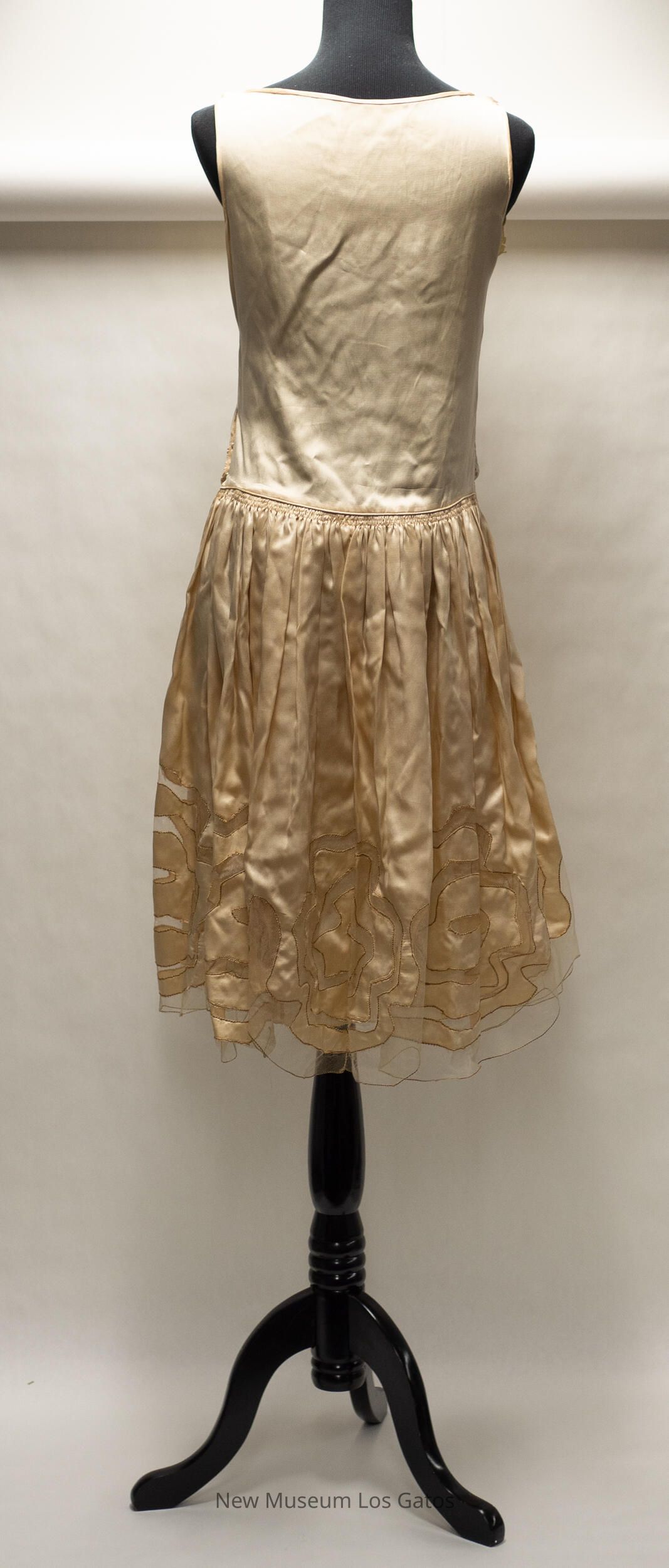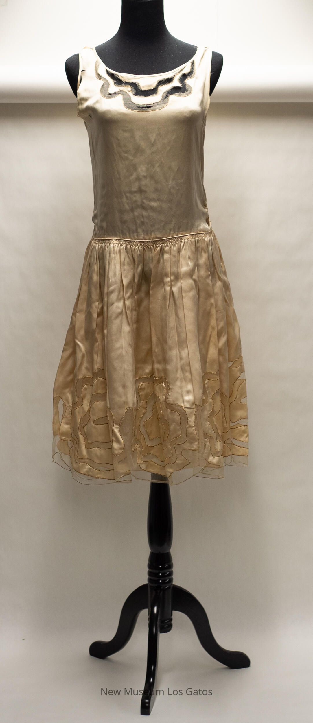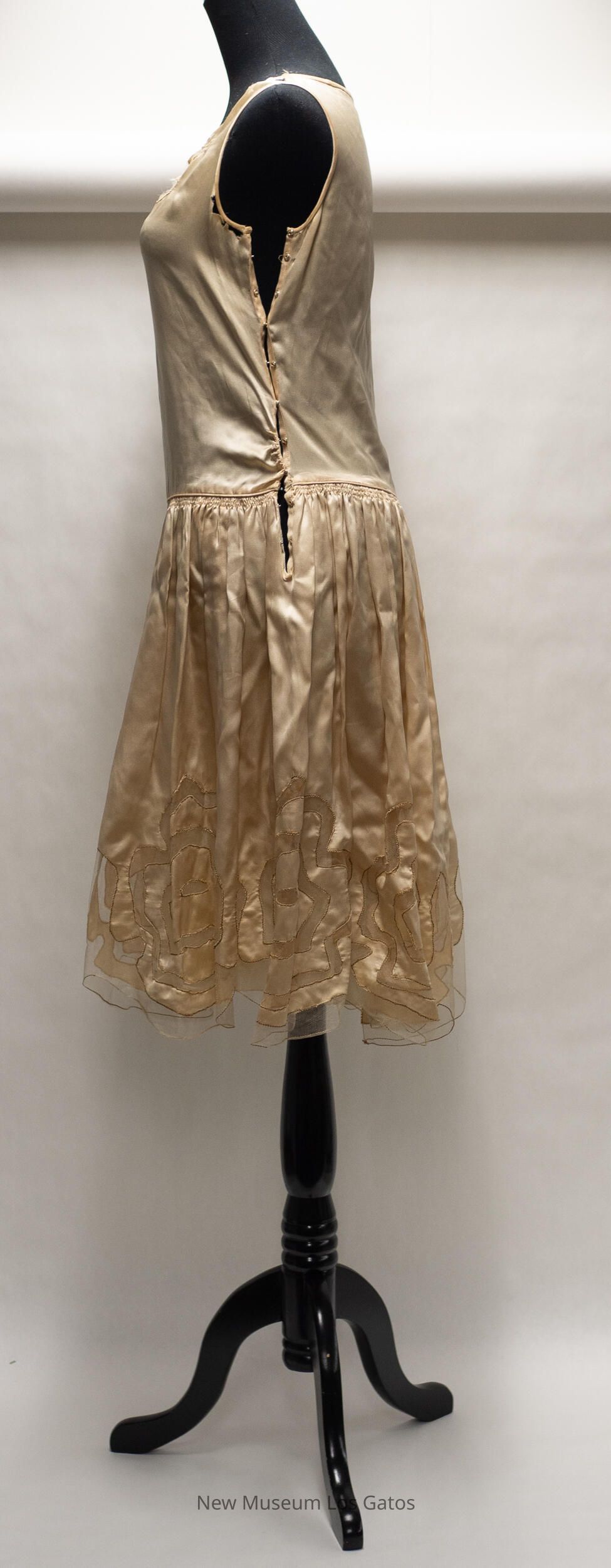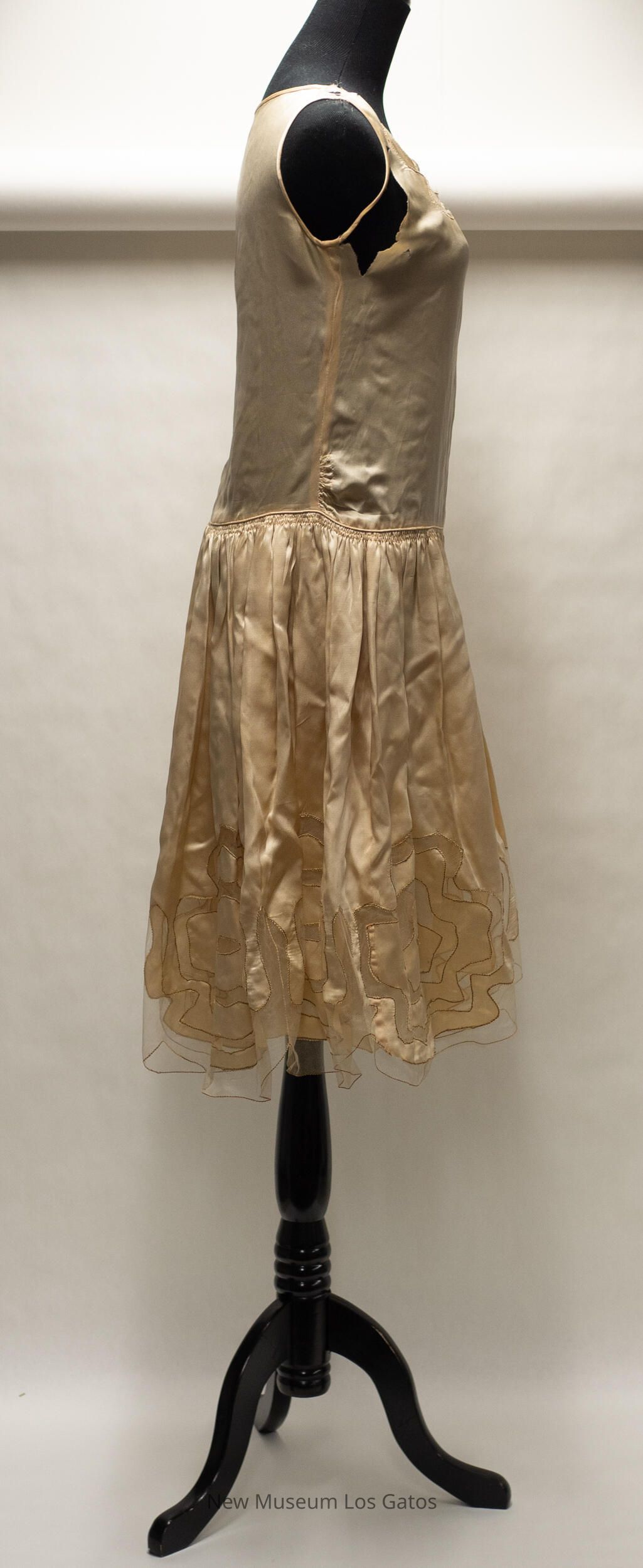 A short, beige silk sleeveless cocktail dress. There is decorative netting inserts along the bottom of the skirt, in a curvilinear pattern; there are also two bands of netting inset along the neckline. The dress opens along the left side, and closes with silver snaps.