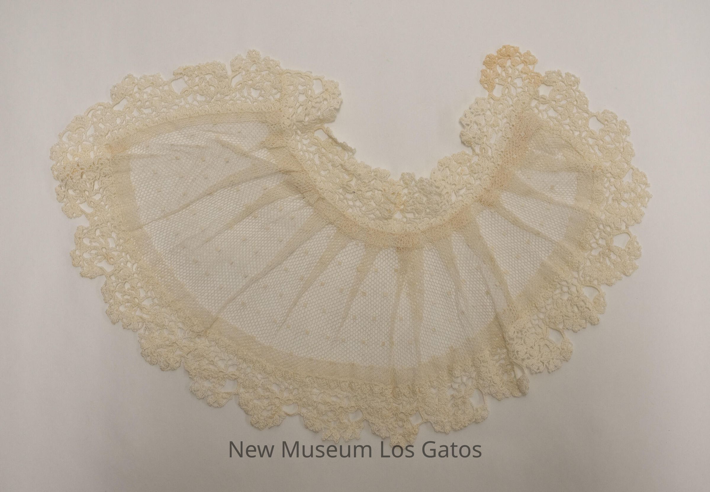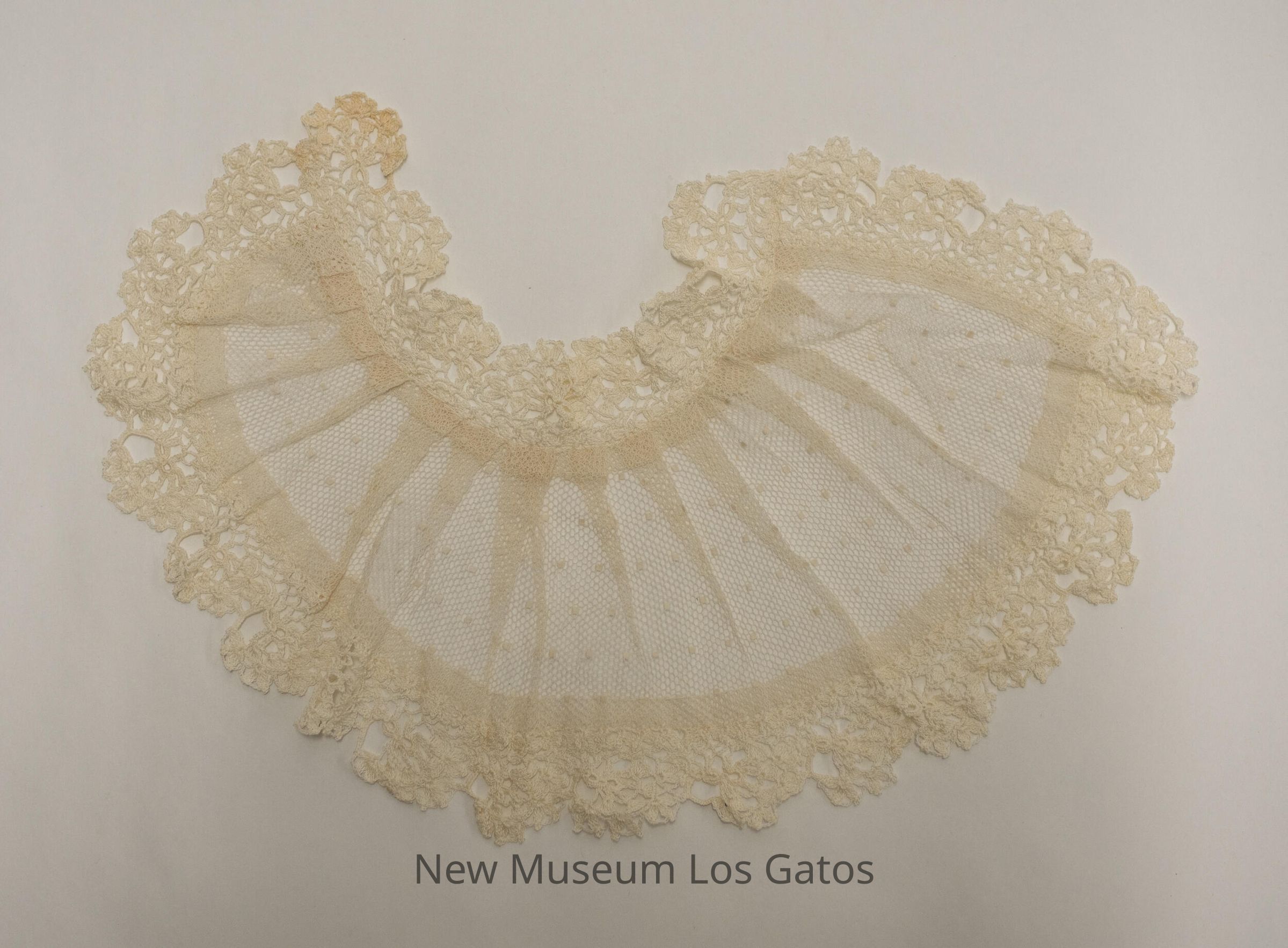 A small, white collar made out of netting, with crocheted trim around the edges. The netting has a dotted pattern, as well as decorative folds/ruching.Collection