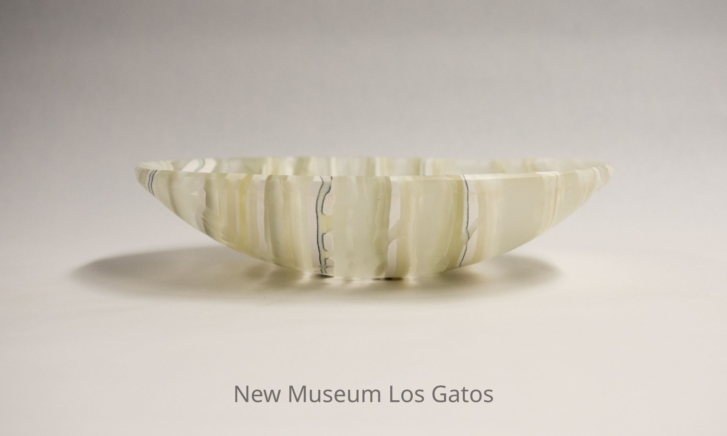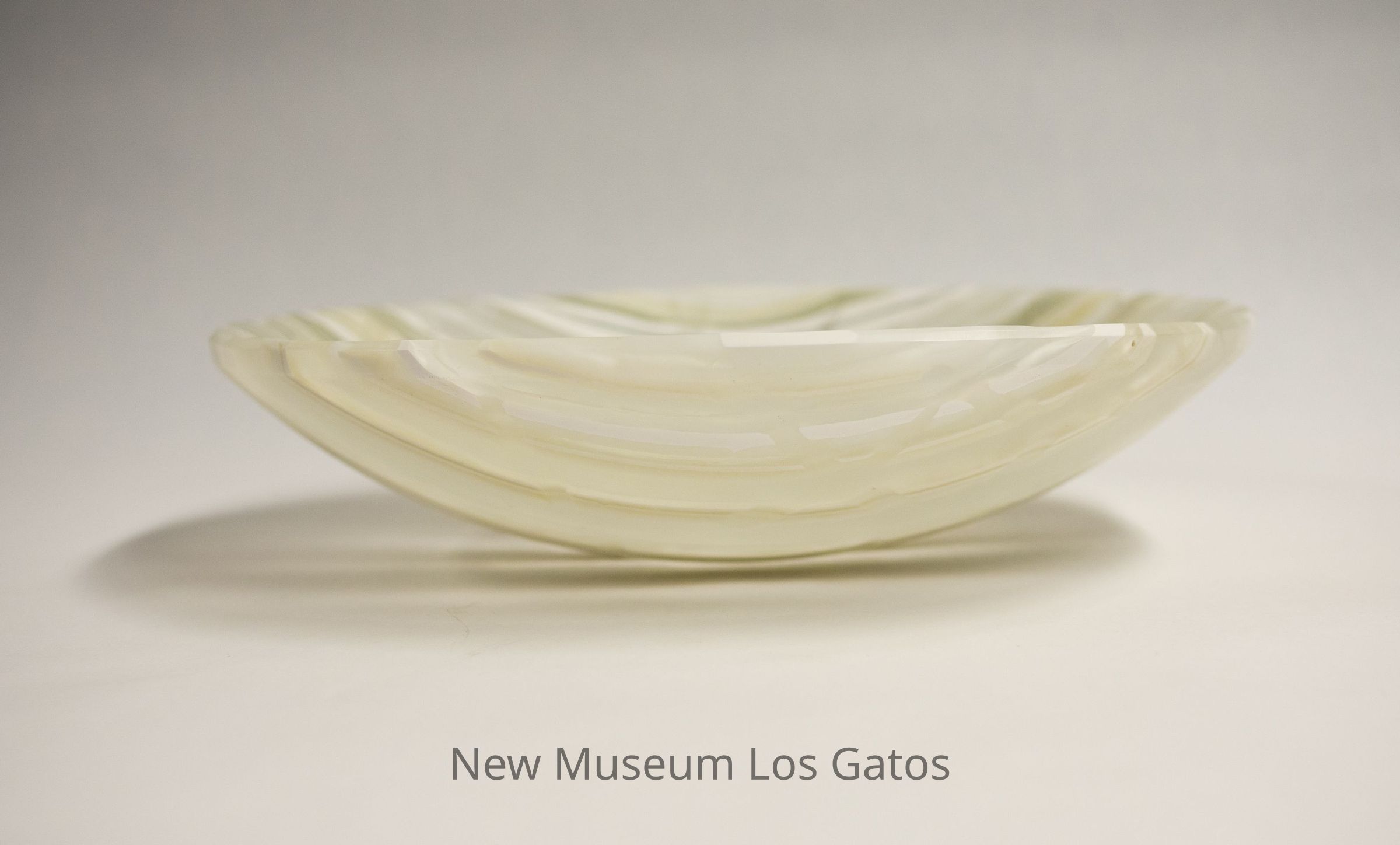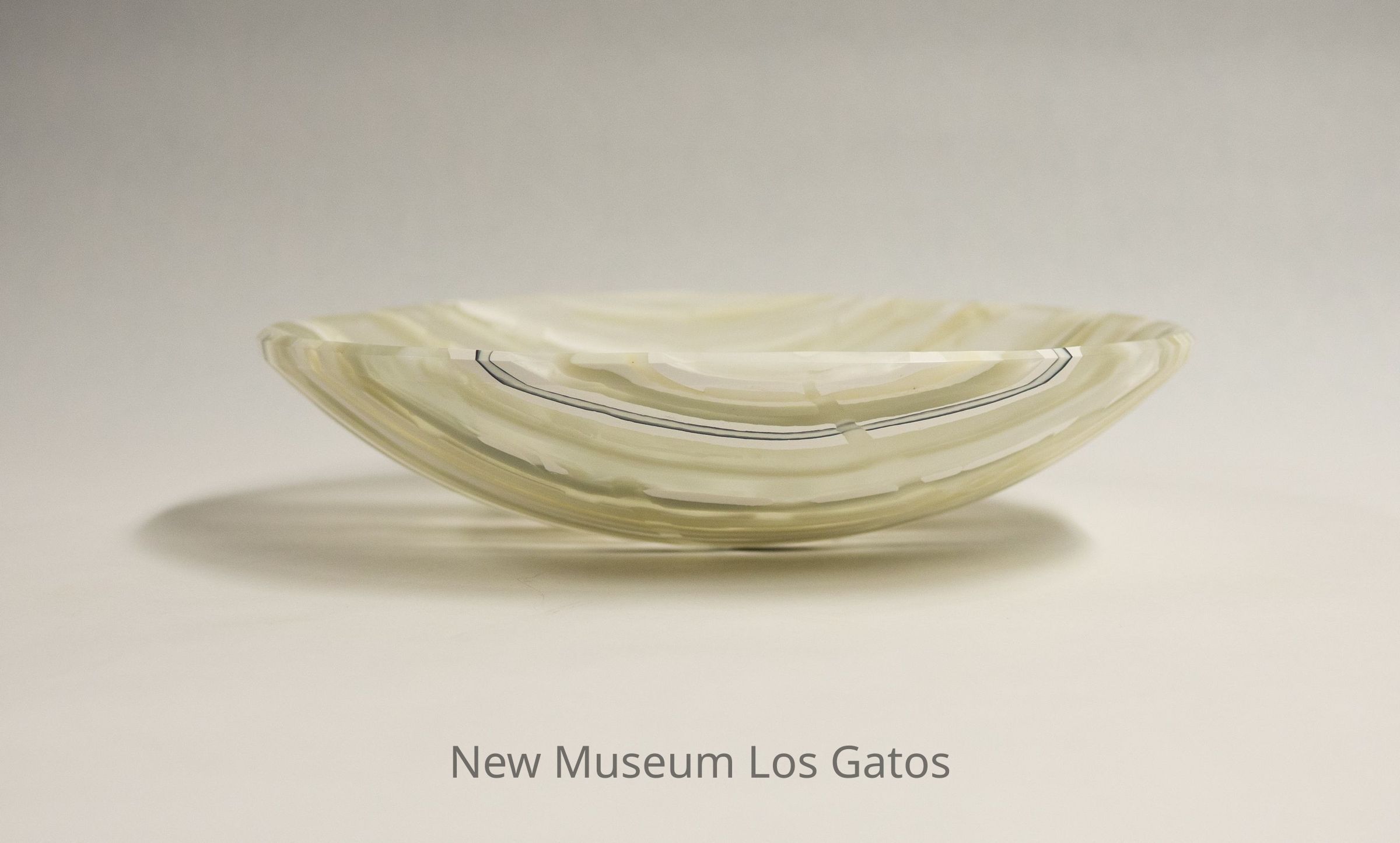 A clear, glass, bowl-shaped sculpture, created with kilnforming and coldworking. The sculpture features white, black, and green-ish stripes throughout.Type of Sculpture