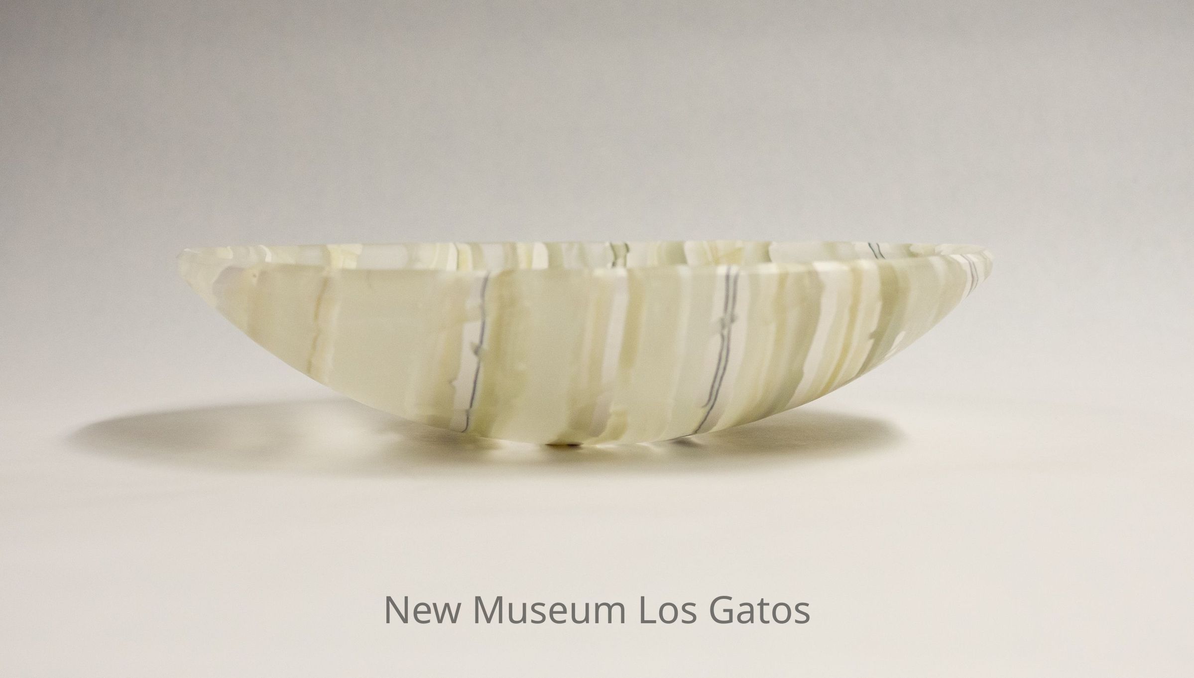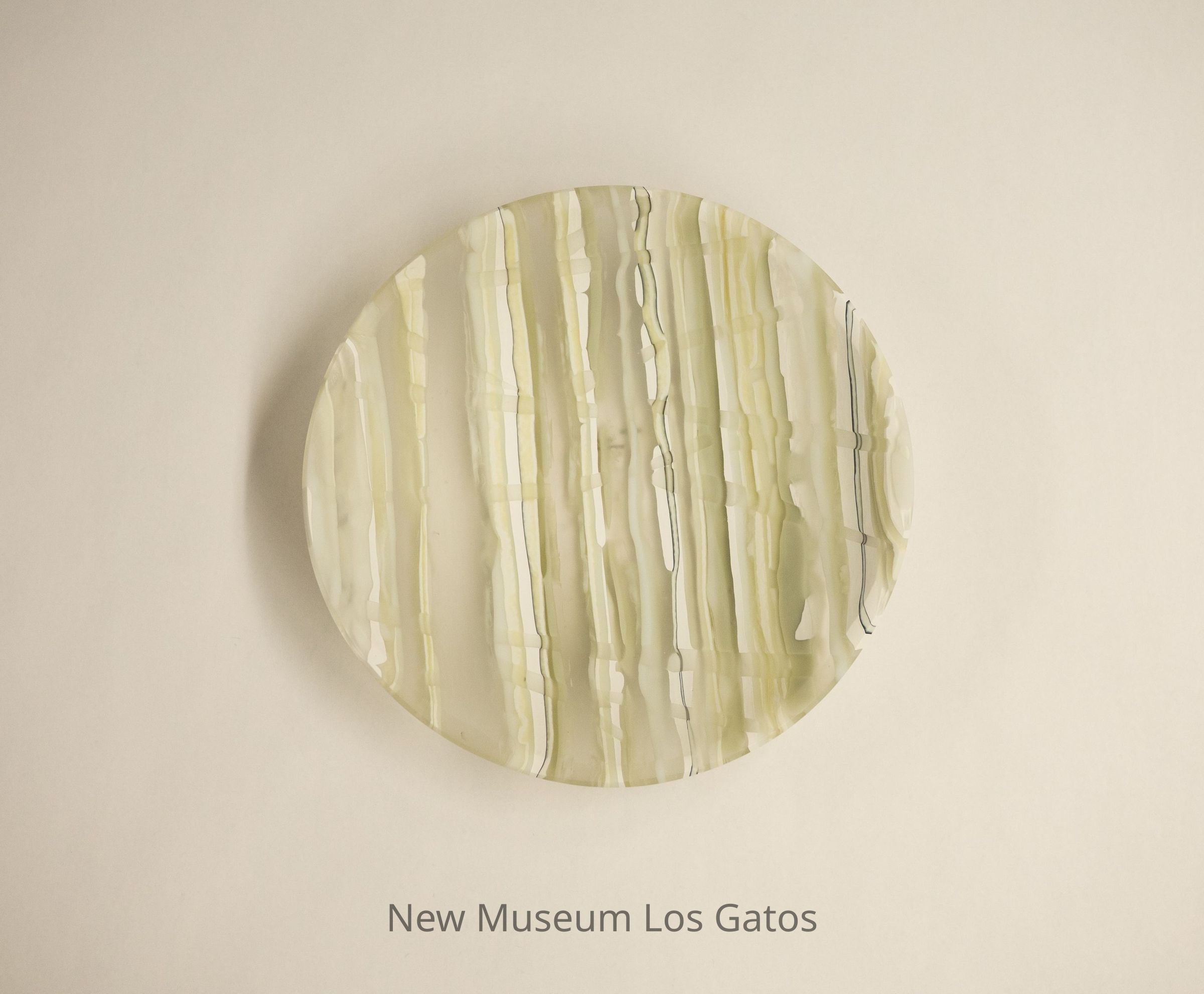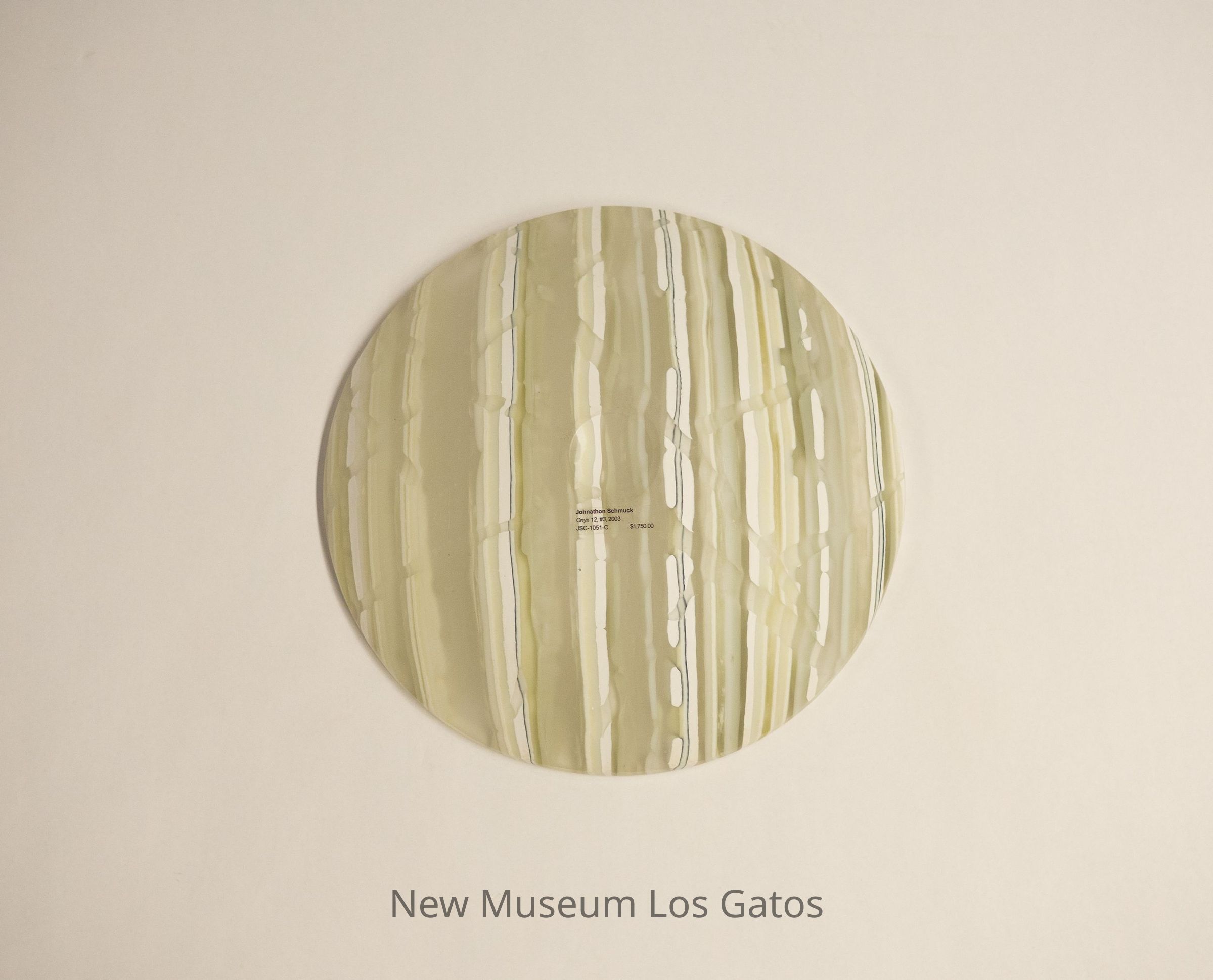 A clear, glass, bowl-shaped sculpture, created with kilnforming and coldworking. The sculpture features white, black, and green-ish stripes throughout.Type of Sculpture