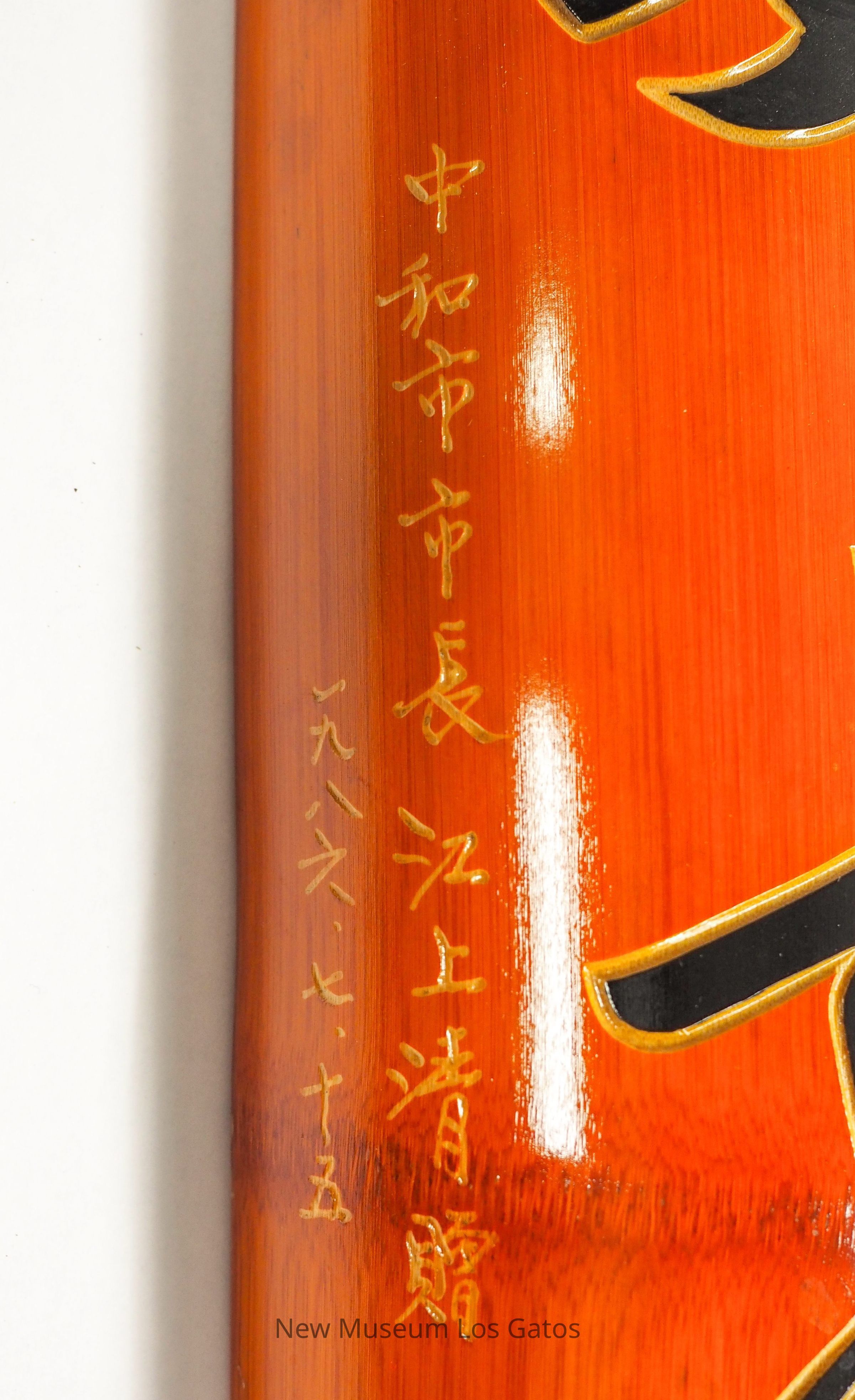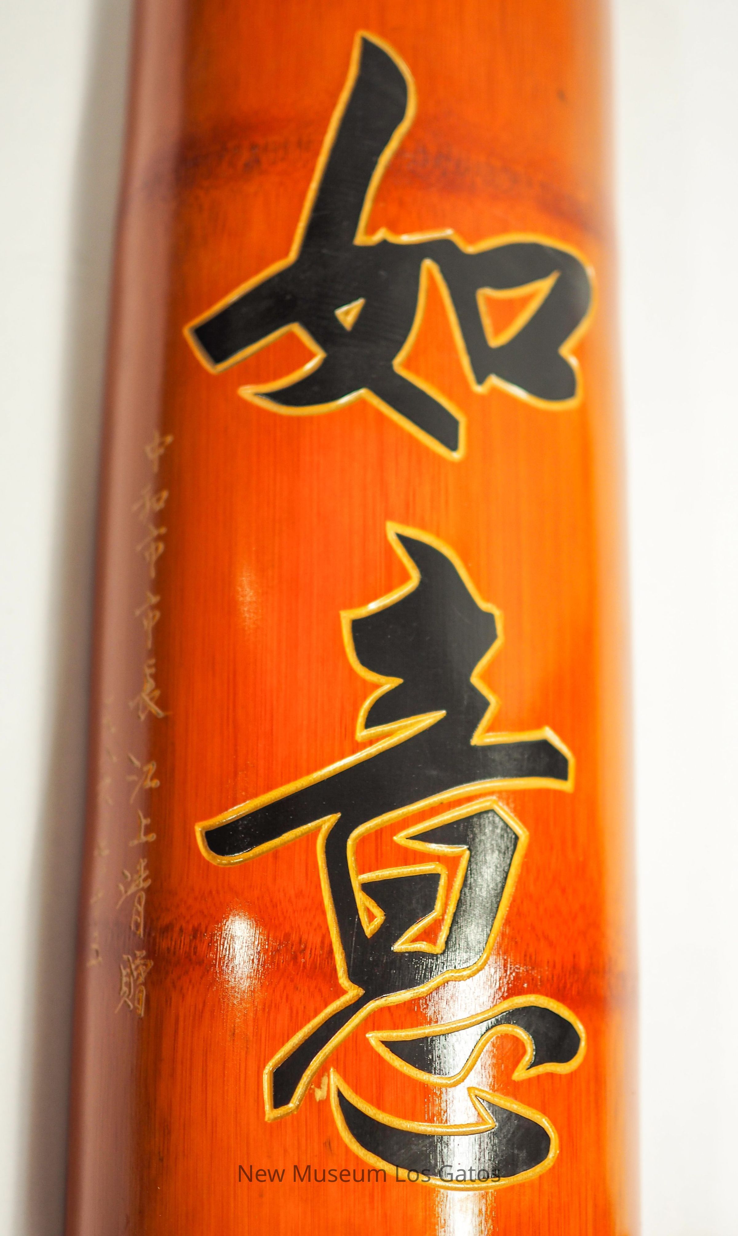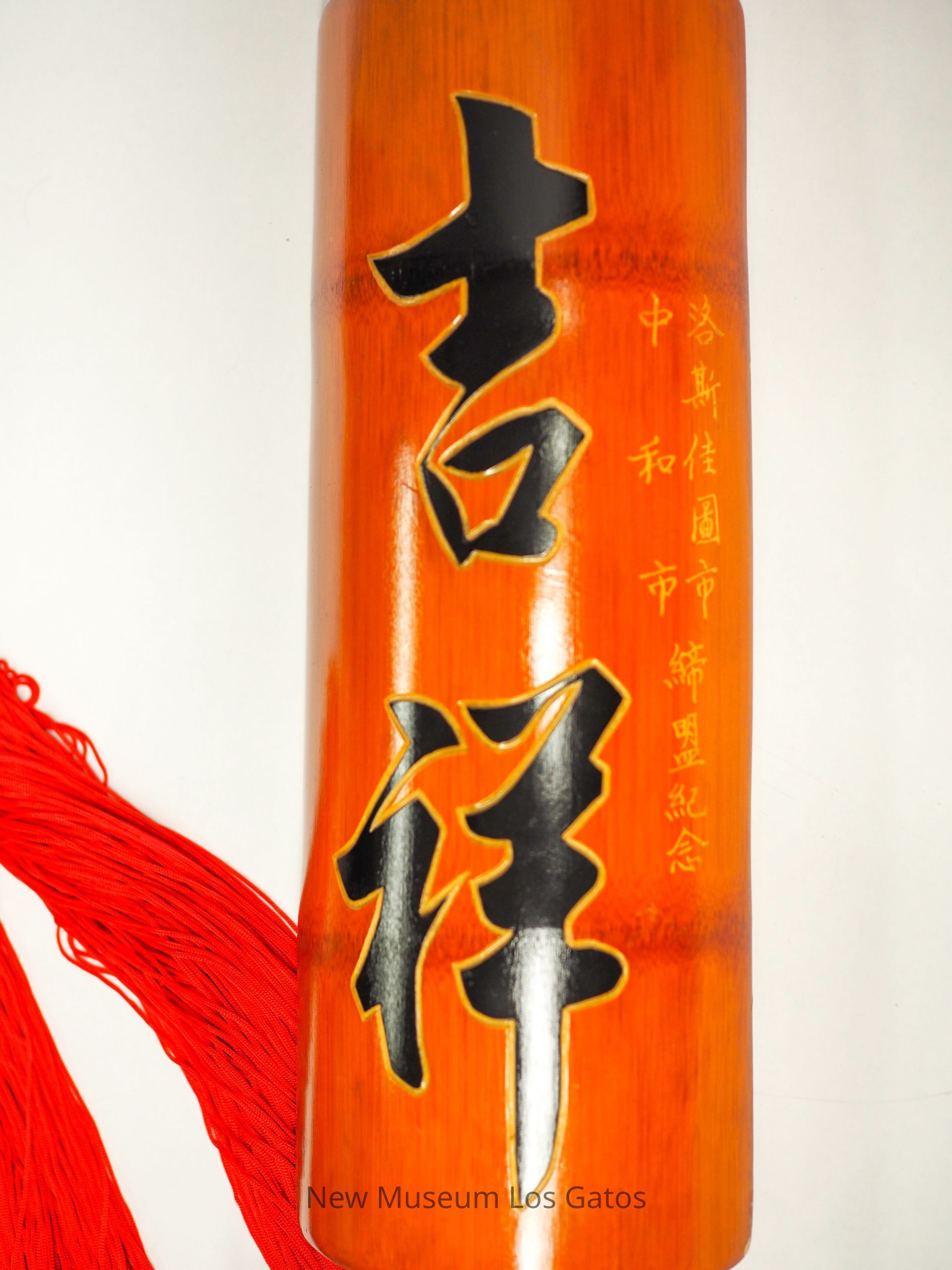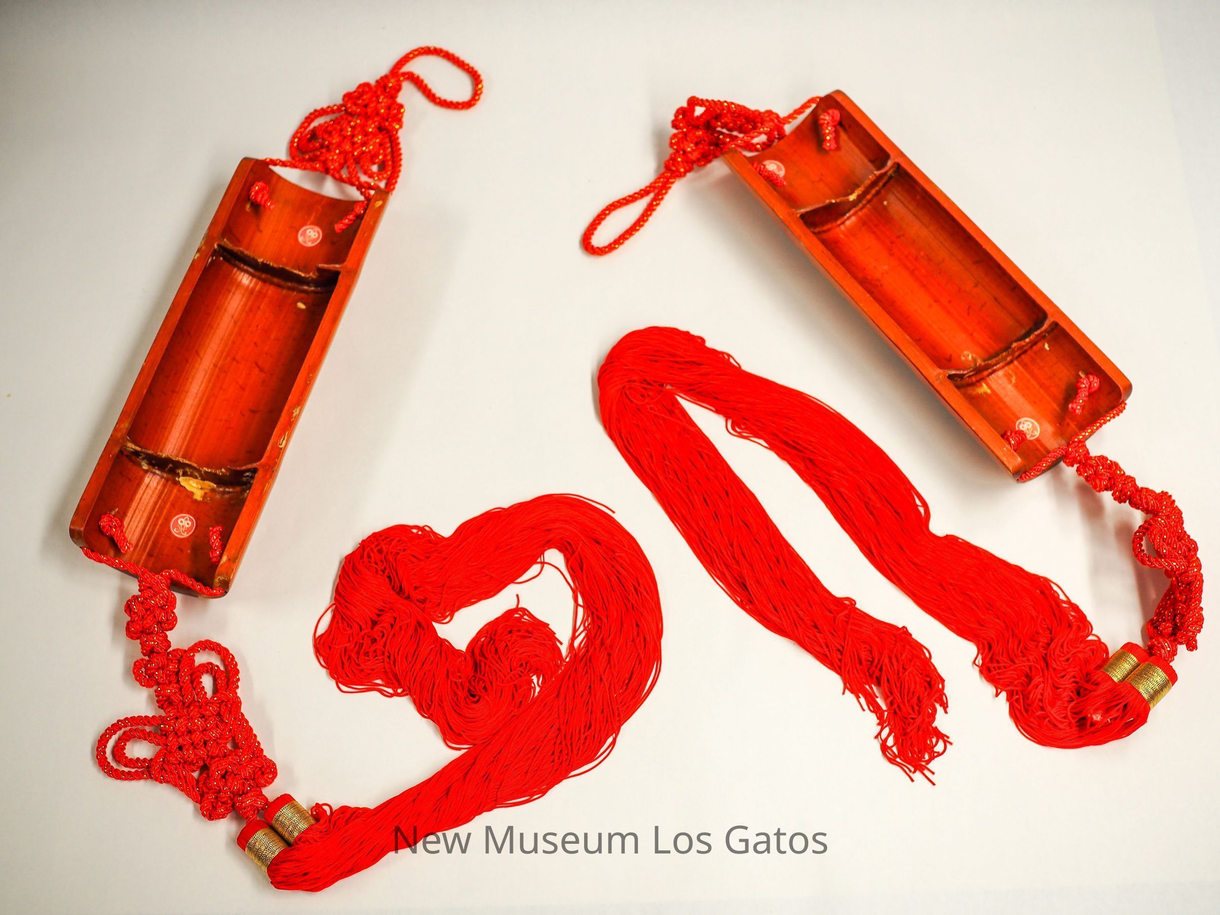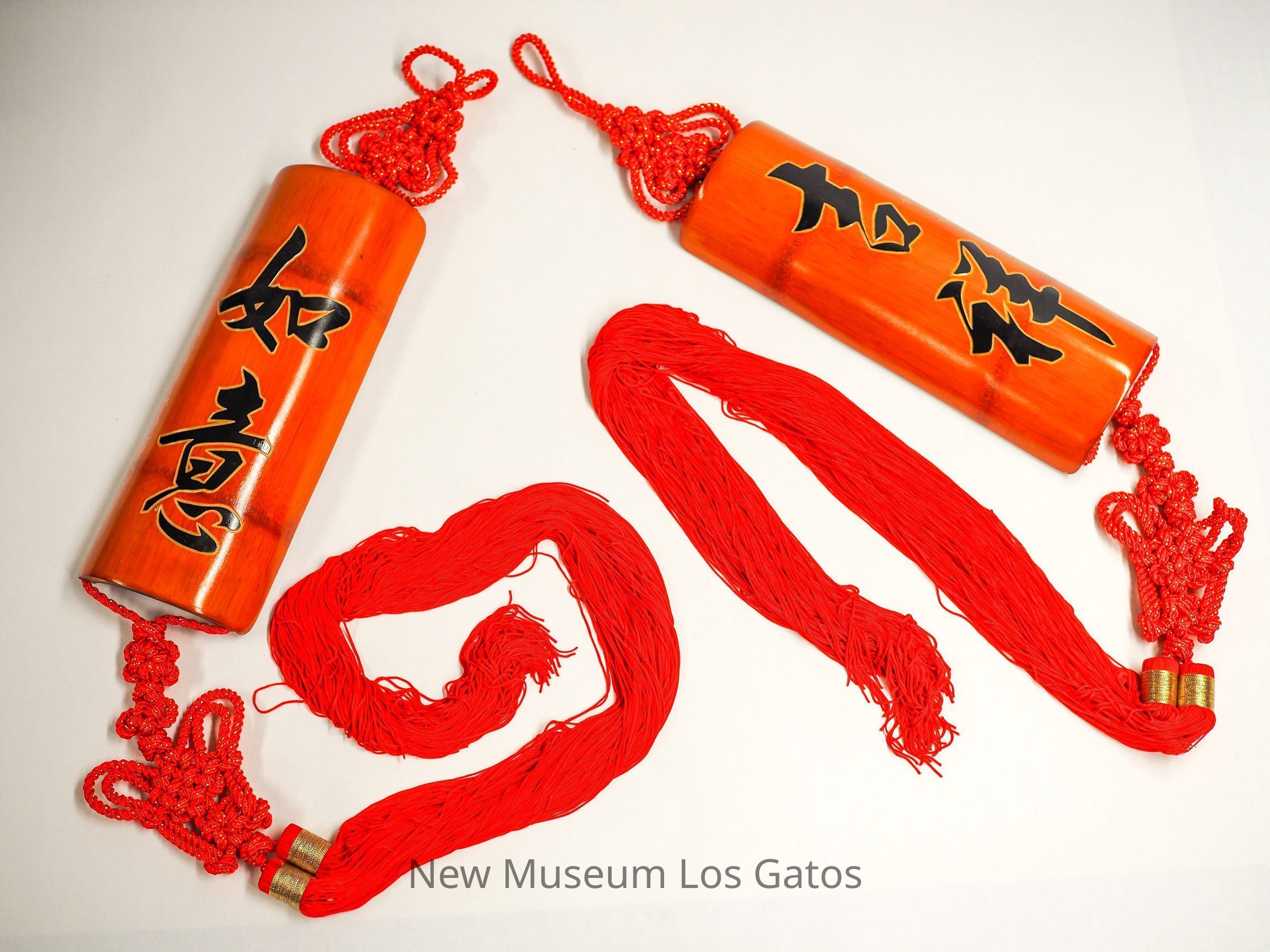 Two commemorative hanging signs with black and gold text and large red tassels.Collection