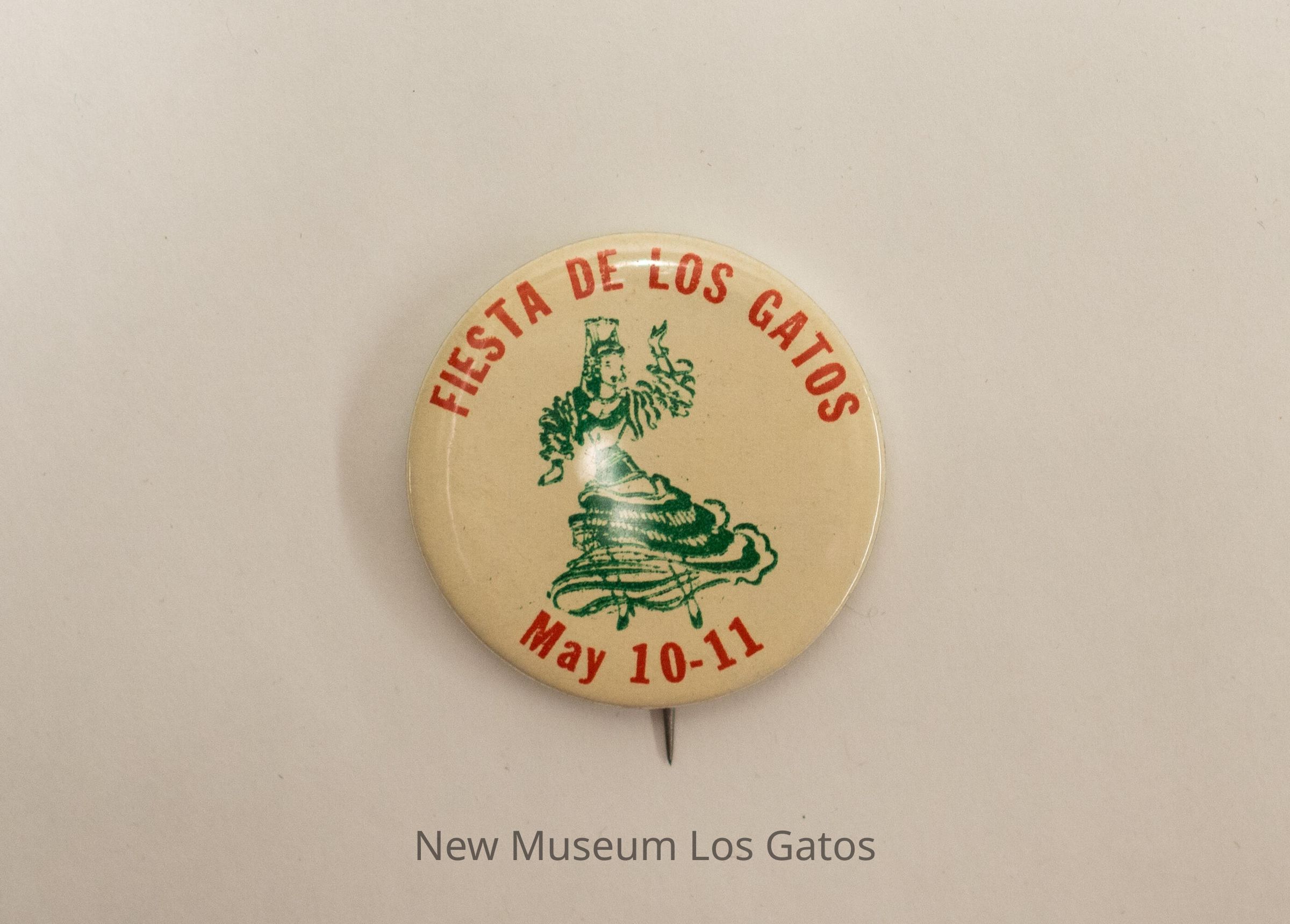 A circular commemorative pin button. The button is white, with a green illustration of a dancing woman in the center, and a red inscription above and below her.Collection