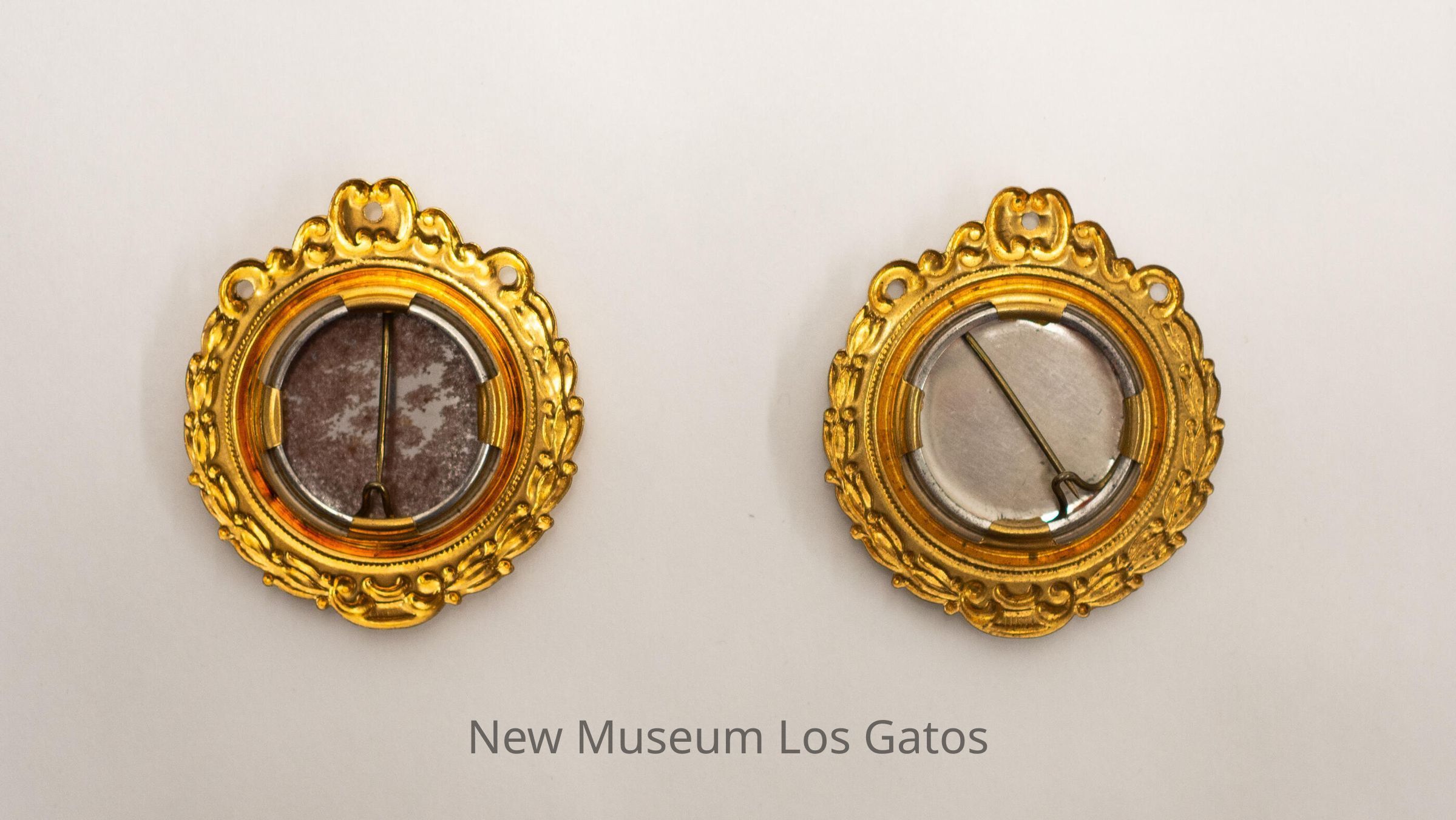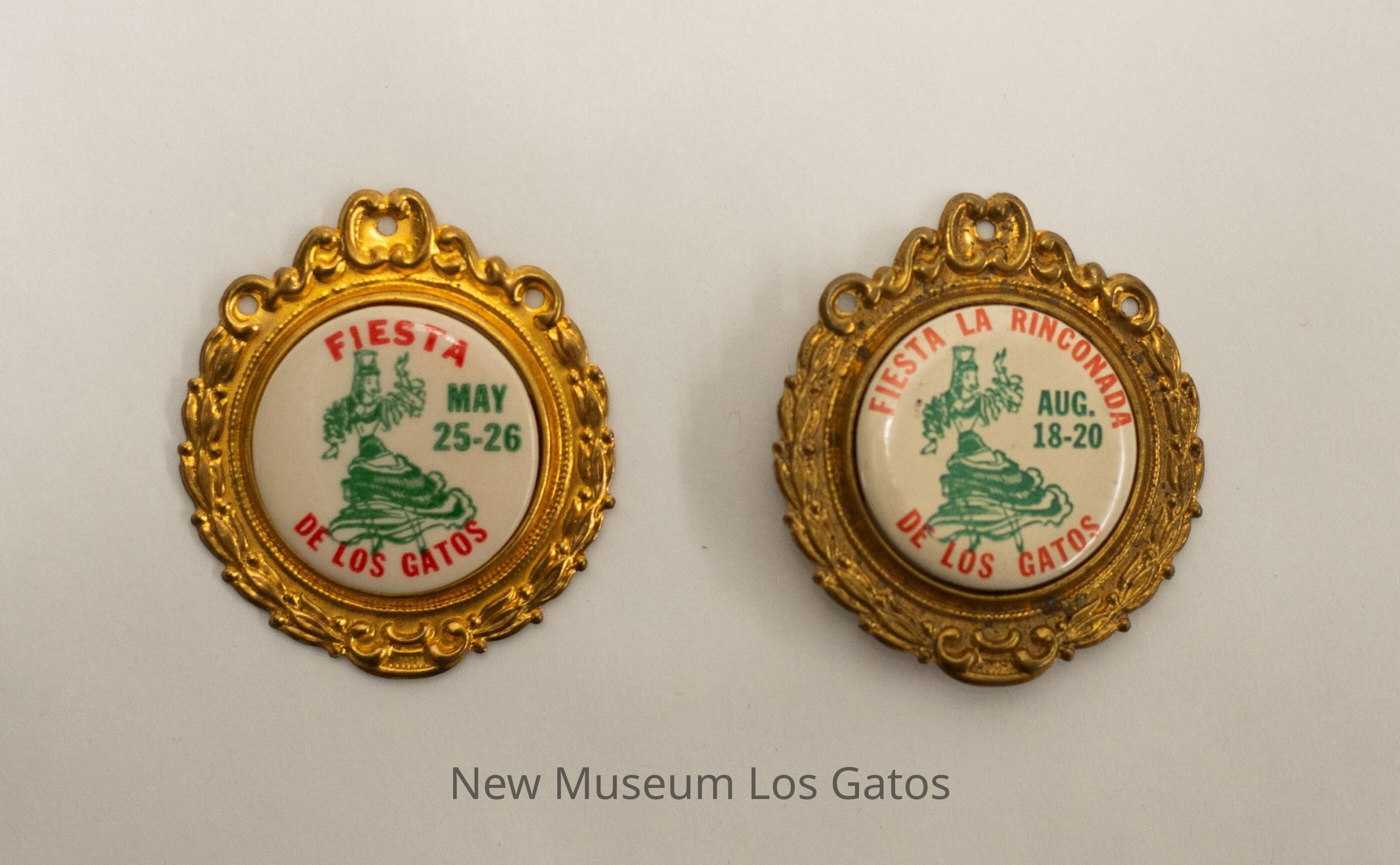 Two circular commemorative pin buttons, with elaborate decorative golden borders around the buttons. The buttons themselves are white, with a green illustration of a dancing woman in the center, a red inscription above and below her, and a green inscription to the right of her.Collection