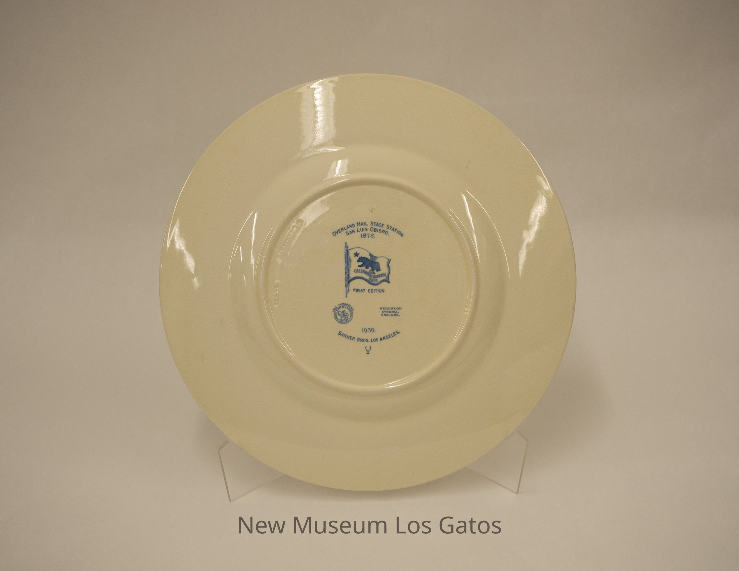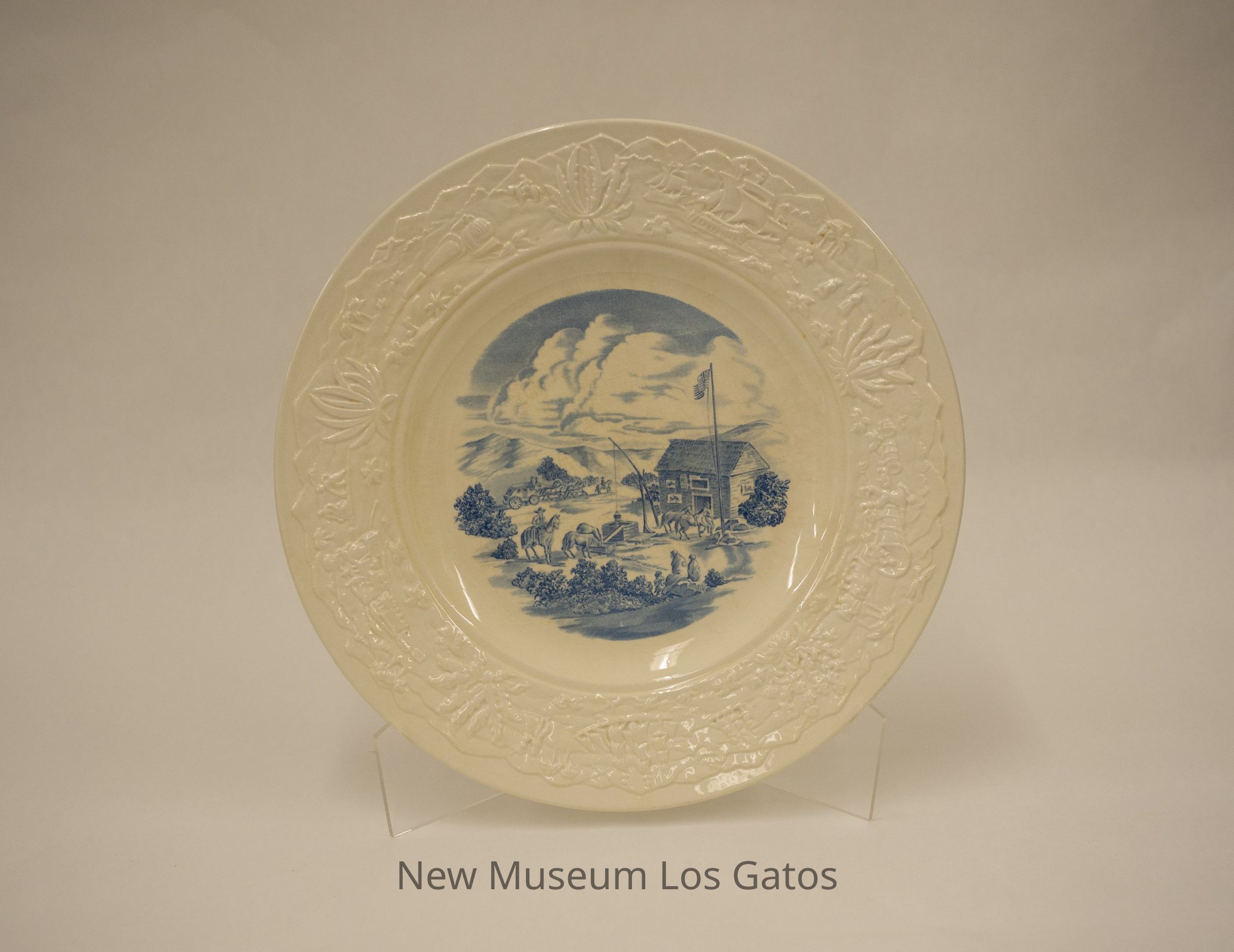 A decorative, commemorative plate depicting the overland mail stage station in San Luis Obispo in 1875. The center of the plate depicts a scene with a wooden structure off to the right with a flag on a flagpole next to it, a stagecoach being pulled by horses in the background, and people and horses gathering near a well in the center. Around the rim of the plate are various embossed depictions of California history, including a ship, cacti, missionaries, covered wagons, and trains.Collection