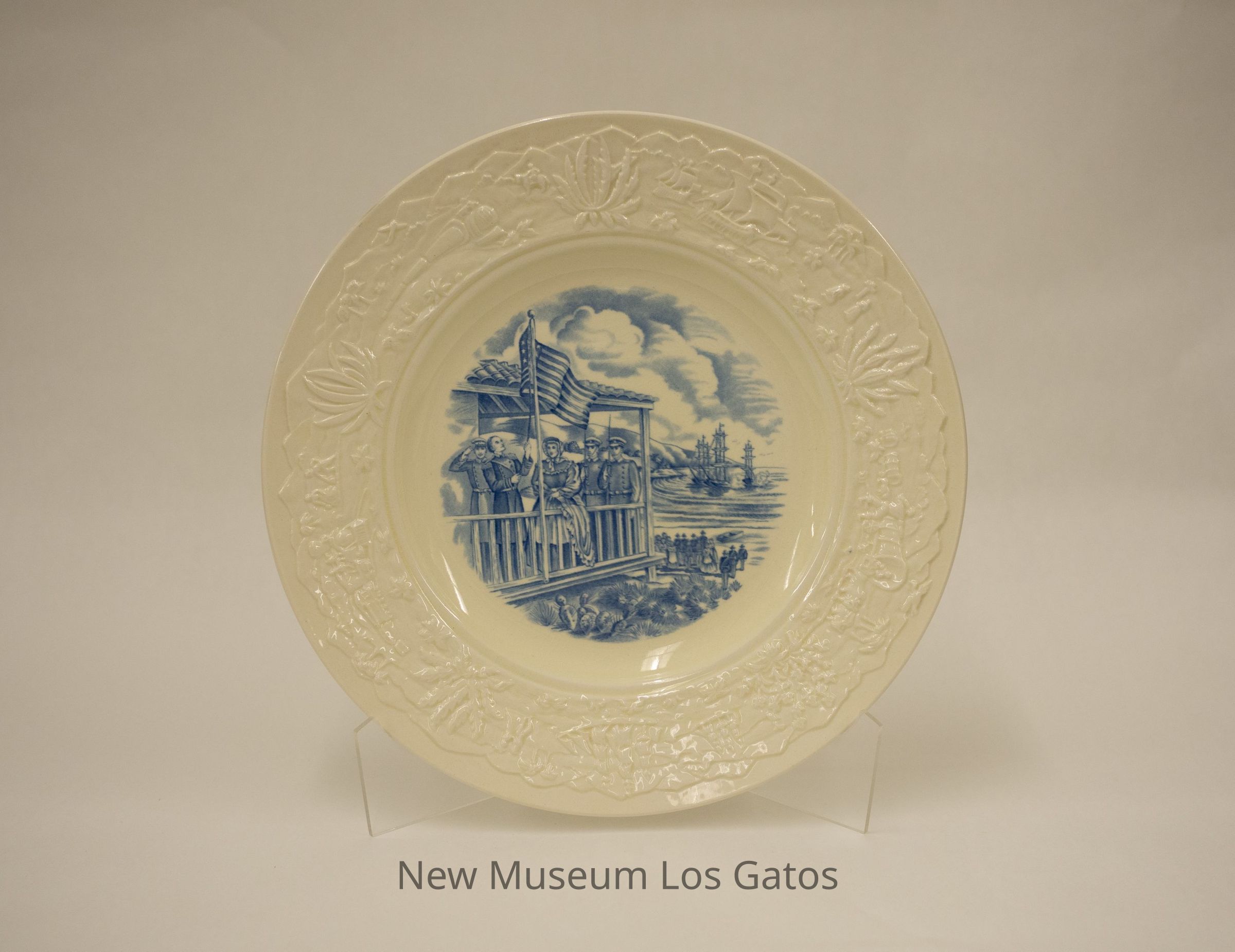 A decorative, commemorative plate depicting Commodore Sloat raising the flag at Monterey in 1846. The center of the plate depicts a scene with a four soldiers and one woman standing on the porch of a building; one man is raising the American flag onto a flag pole. There are people standing on the beach and three ships in the ocean in the background. Around the rim of the plate are various embossed depictions of California history, including a ship, cacti, missionaries, covered wagons, and trains.Collection