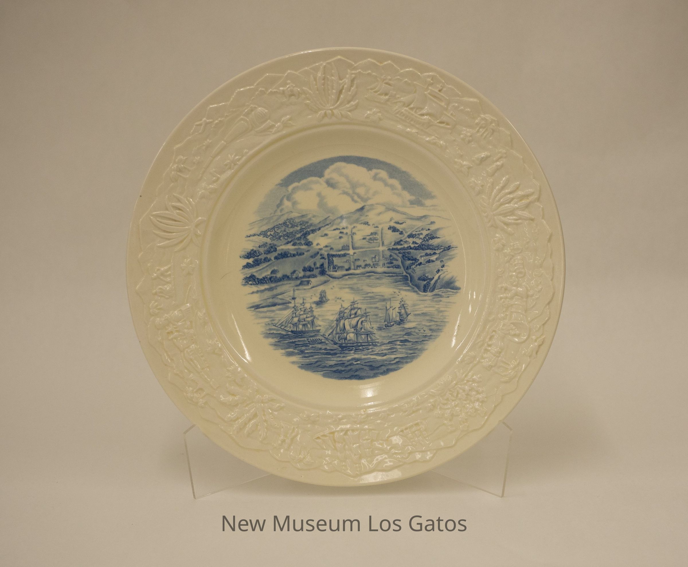 A decorative, commemorative plate depicting San Francisco in 1846. The center of the plate depicts a scene with four ships in the ocean in the foreground, and hills with trees and a few roads and buildings in the background. Around the rim of the plate are various embossed depictions of California history, including a ship, cacti, missionaries, covered wagons, and trains.Collection