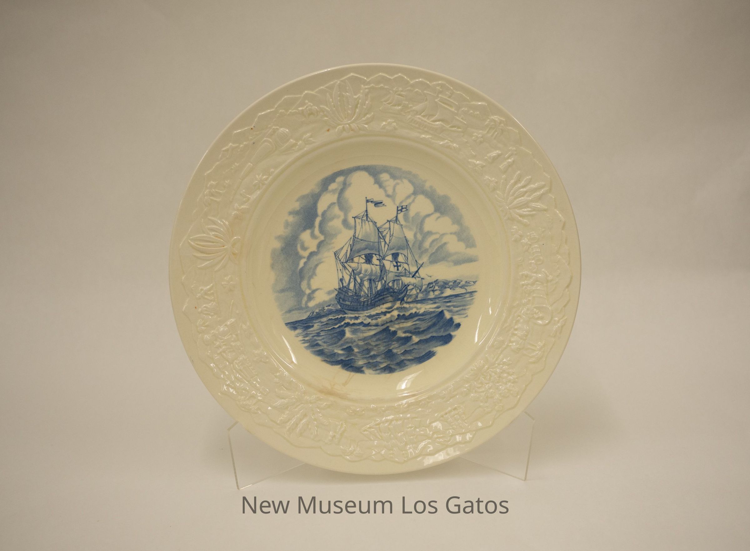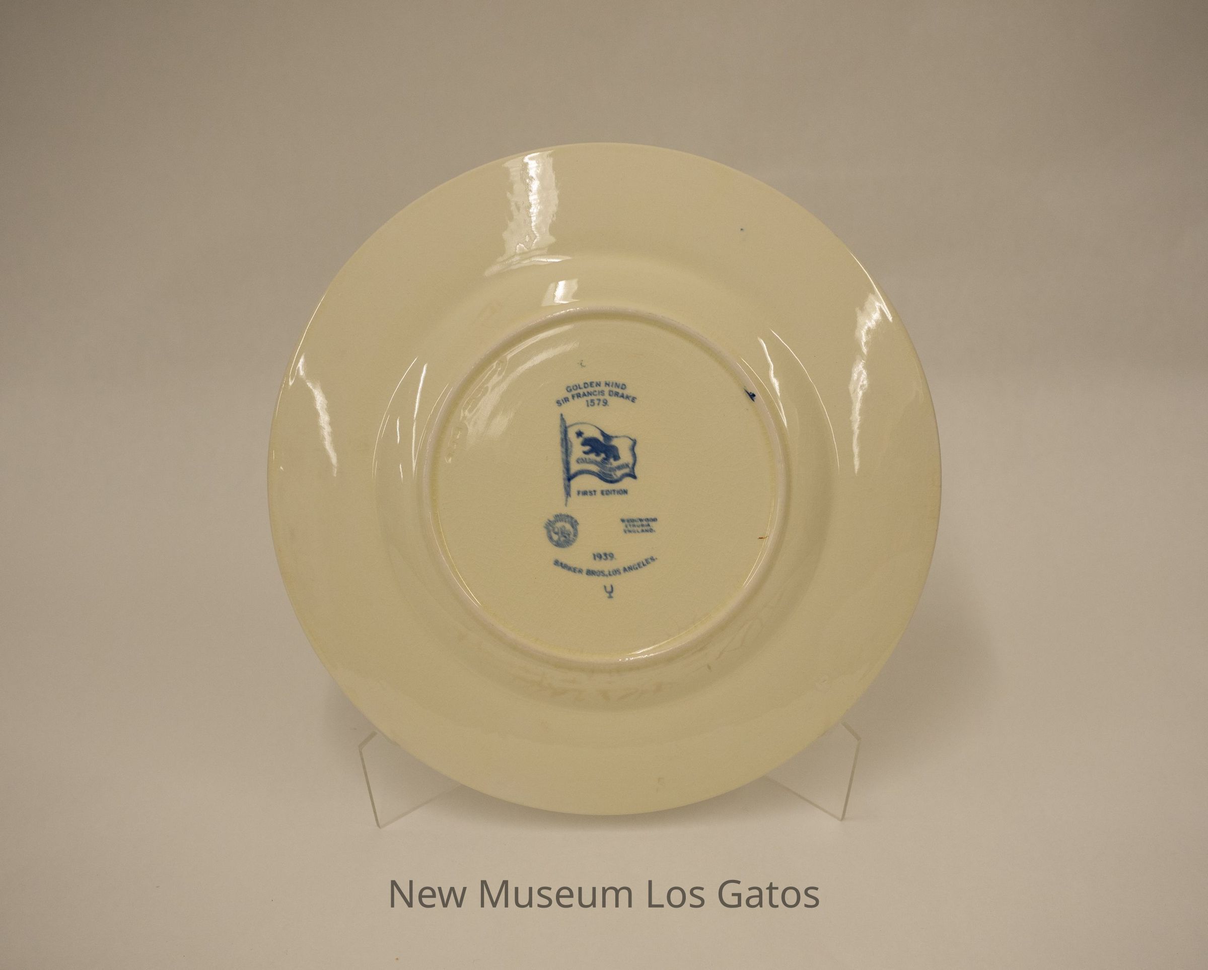 A decorative, commemorative plate depicting the Golden Hind of Sir Francis Drake in 1579. The center of the plate depicts a scene a ship in the center, sailing on an ocean with choppy waves and land in the far background. Around the rim of the plate are various embossed depictions of California history, including a ship, cacti, missionaries, covered wagons, and trains.Collection