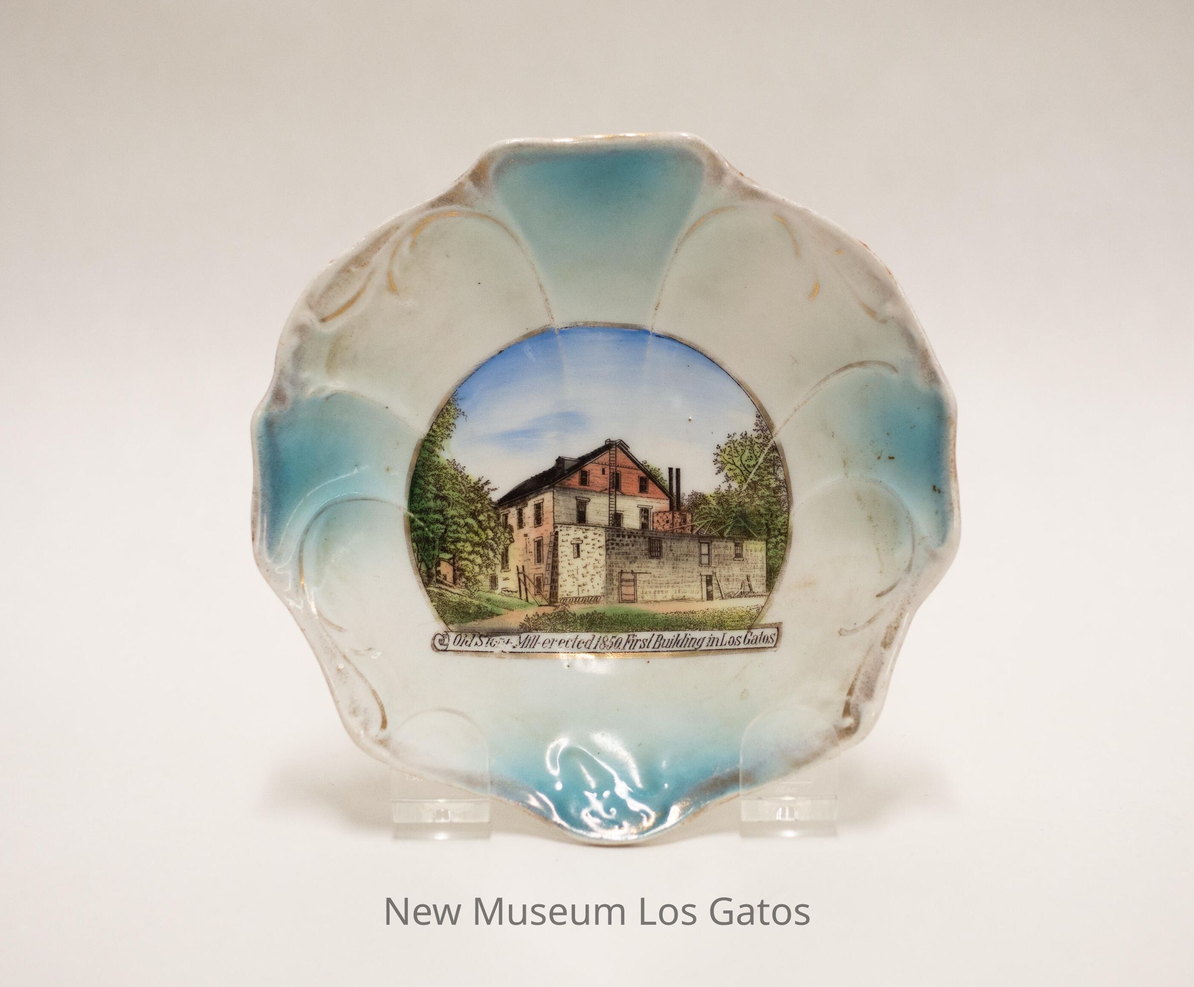 A small white and blue commemorative plate, with a colorful illustration in the center. The blue color is in four spots around the rim of the plate. There is also raised decorative ridges along the rim of the plate, with gold paint highlighting the ridges. The illustration depicts Forbes Mill, with an inscribed banner underneath.Collection