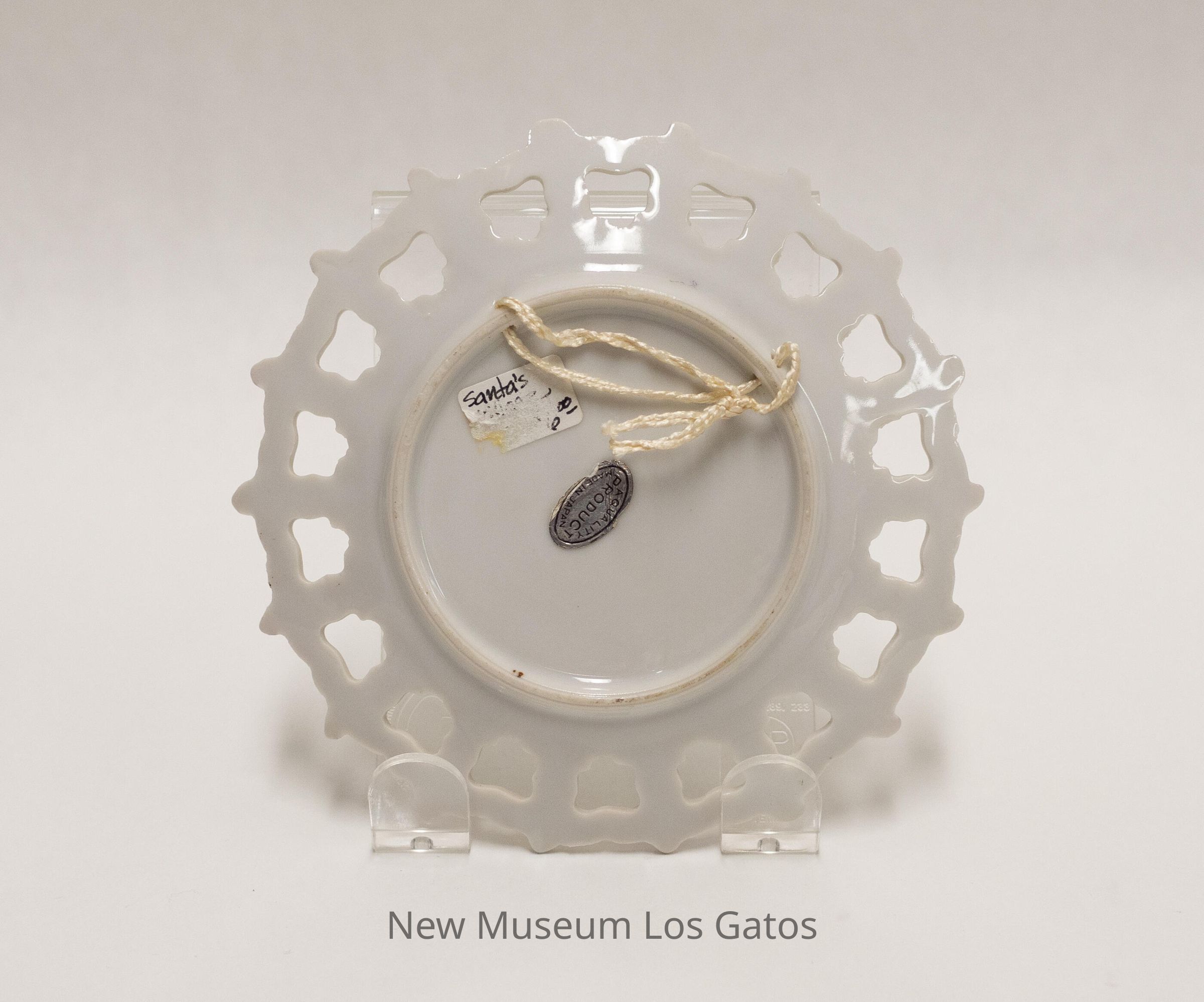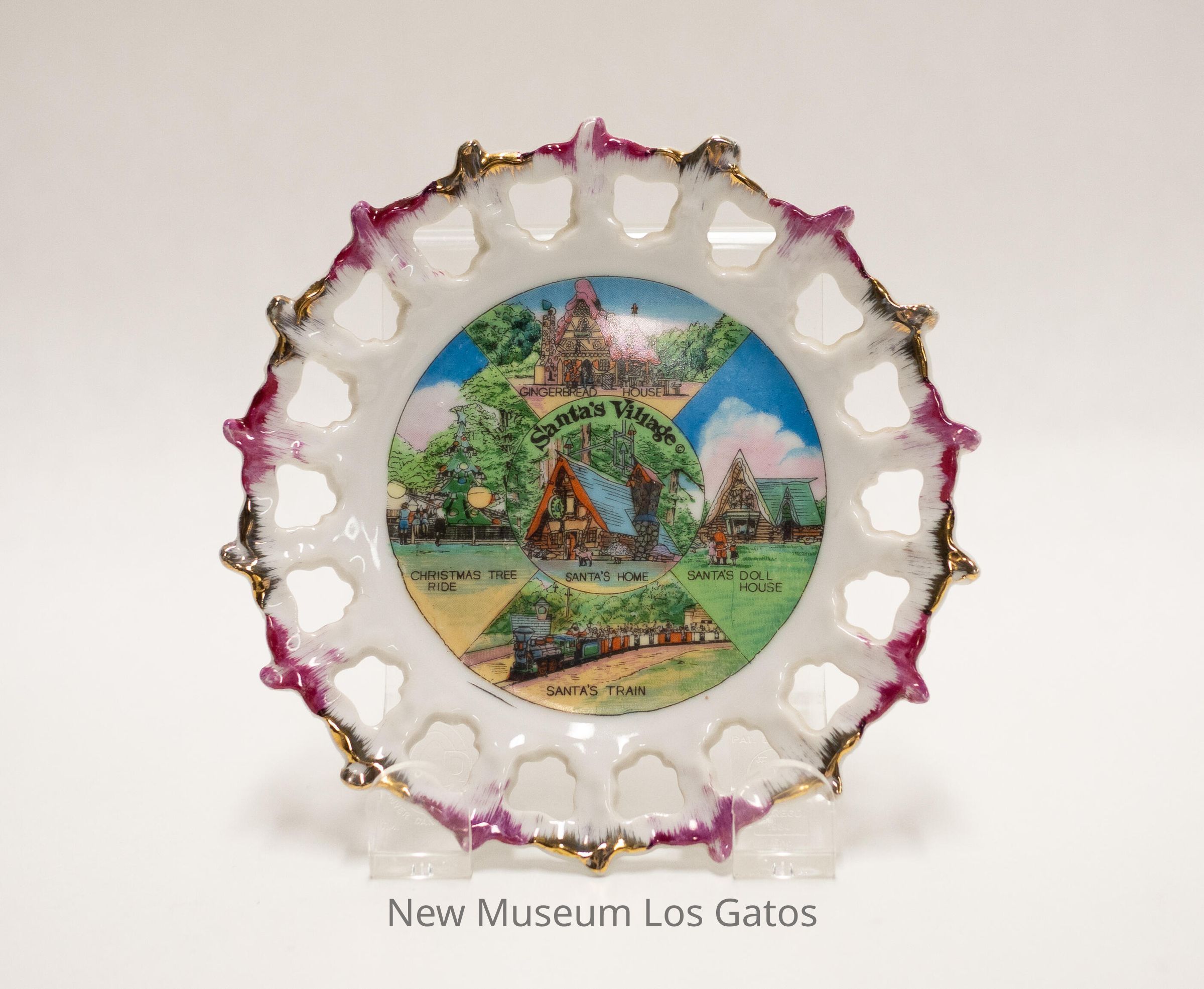 A small white commemorative plate, with a colorful illustration in the center. The illustration features scenes from Santa's Village, including Santa's Home, Santa's Train, Christmas Tree Ride, Gingerbread House, and Santa's Dollhouse. There are decorative holes around the edge of the plate, with alternating maroon and gold paint.Collection