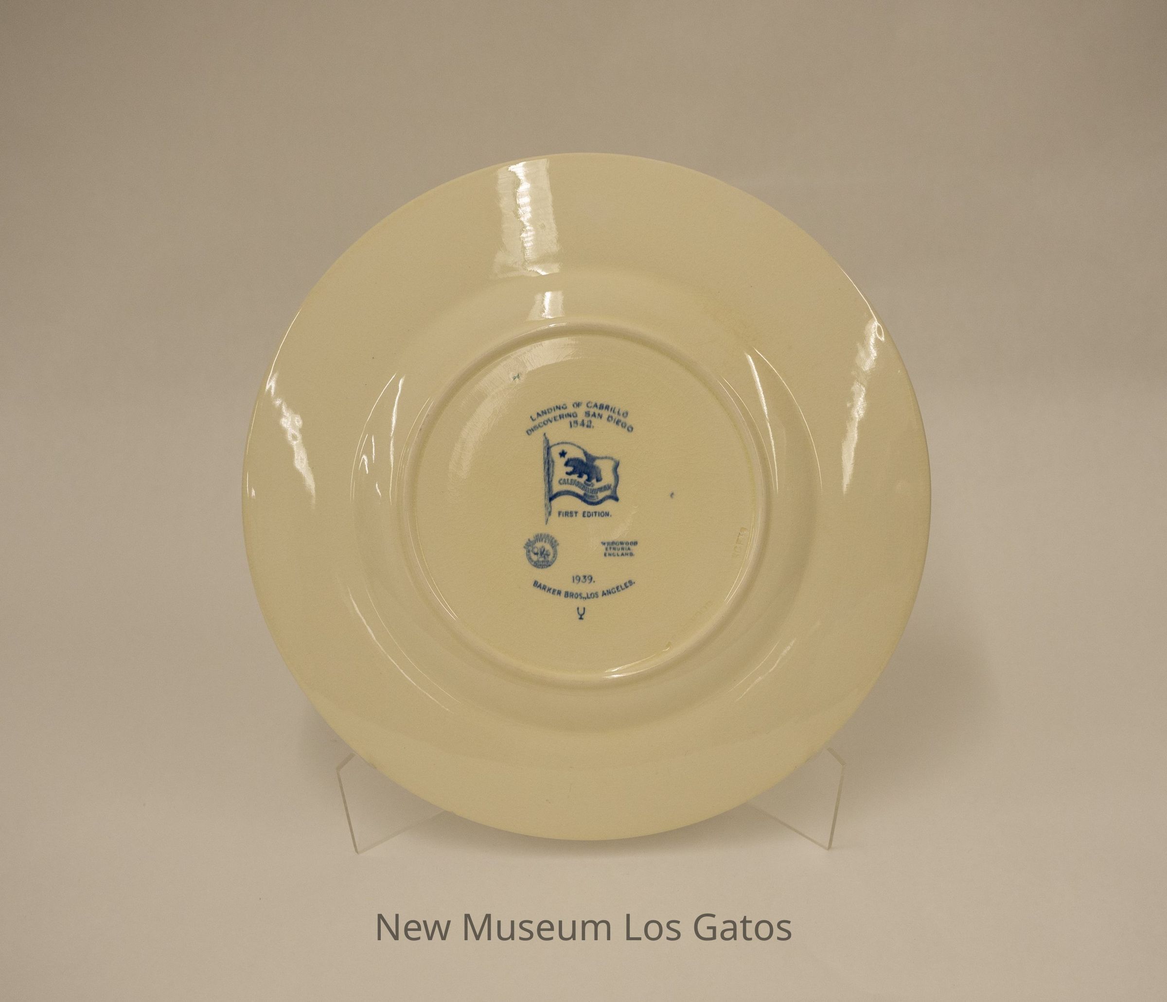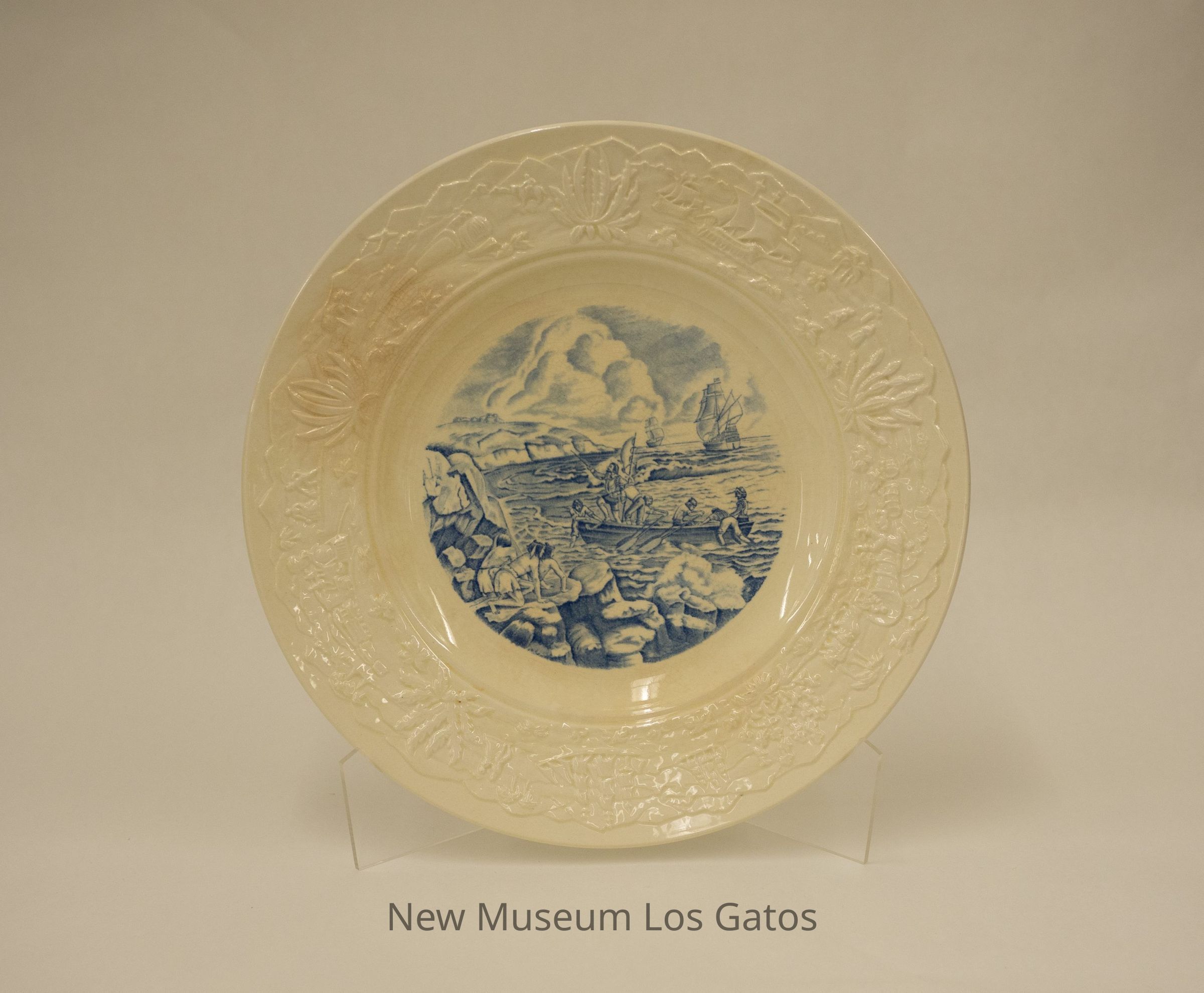 A decorative, commemorative plate depicting Cabrillo landing in San Diego in 1542. The center of the plate depicts a scene with a man in armor being rowed ashore in a small boat. There are two ships out at sea in the background, and three native people on the land in the foreground. Around the rim of the plate are various embossed depictions of California history, including a ship, cacti, missionaries, covered wagons, and trains.Collection