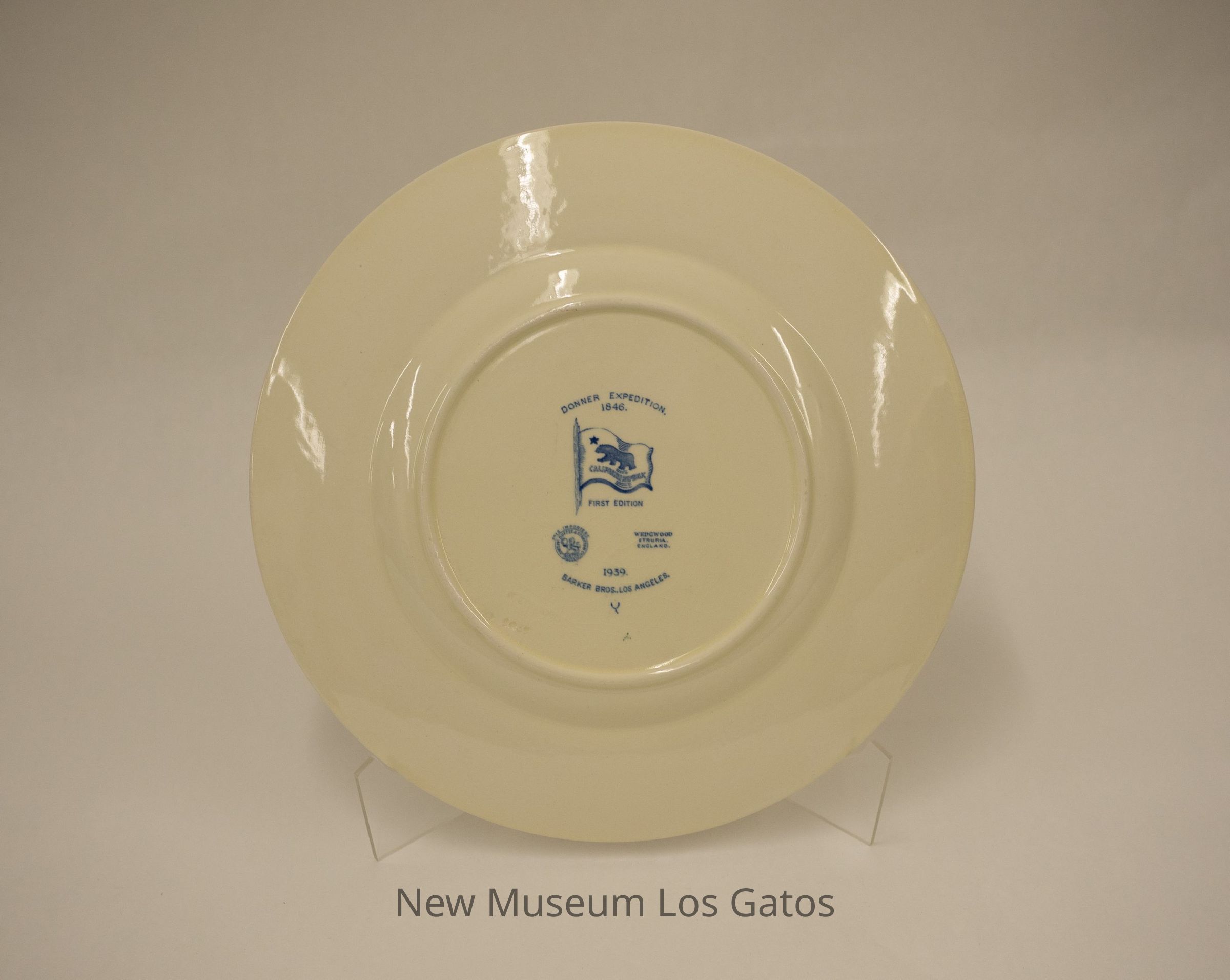 A decorative, commemorative plate depicting the Donner Expedition in 1846. The center of the plate depicts a scene with a covered wagon in the center, and many other covered wagons, horses, and people in the background. In the foreground, an Indigenous person is pointing two people on horses towards the right. Around the rim of the plate are various embossed depictions of California history, including a ship, cacti, missionaries, covered wagons, and trains.Collection
