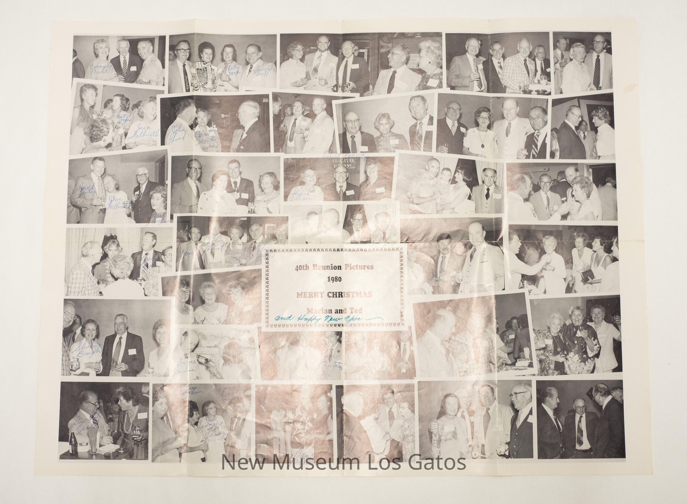 A large poster with numerous black and white photographs commemorating the 40th reunion of the Class of 1939 (most likely). There are signatures near many of the people in the photos.Collection