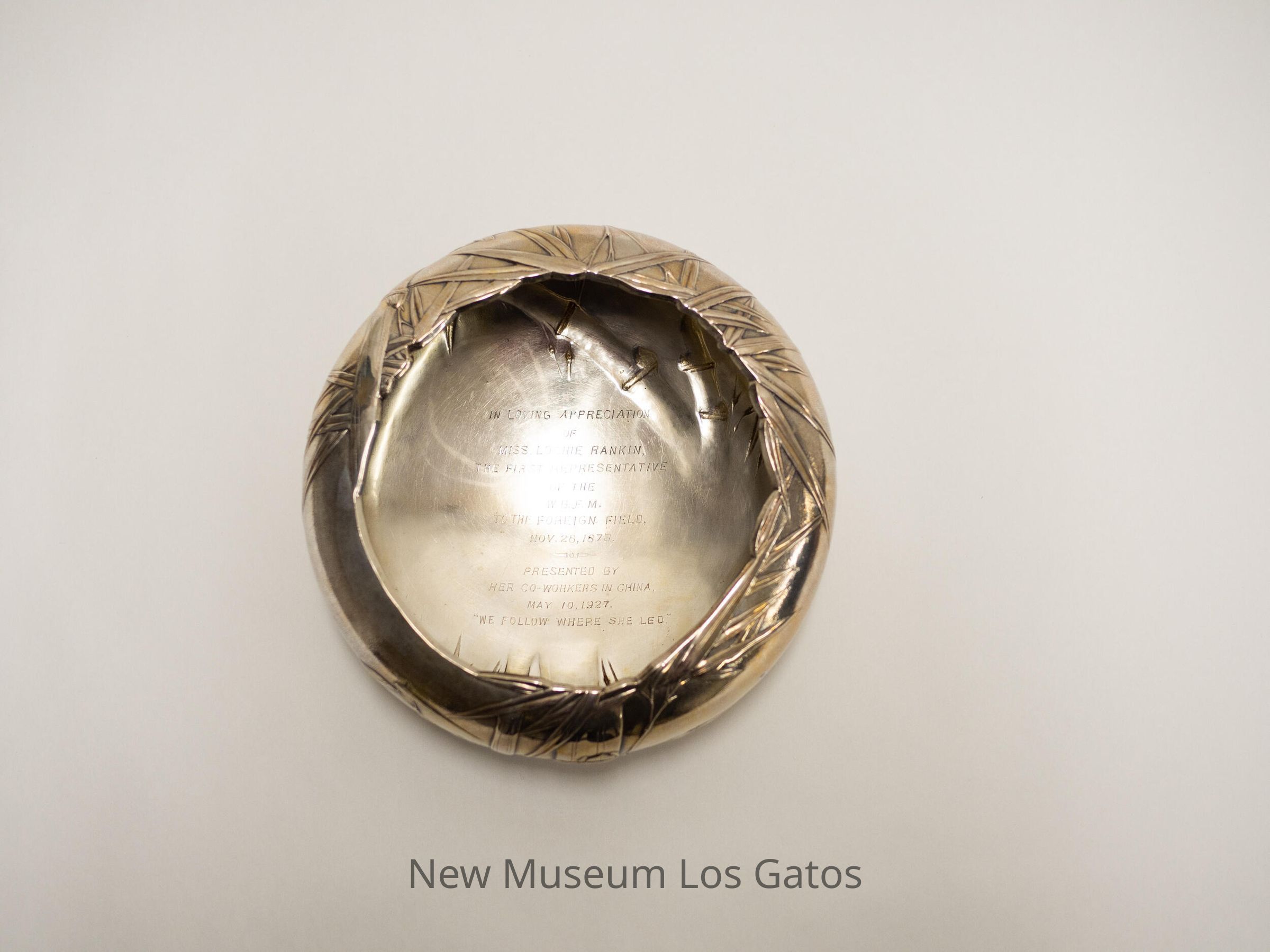 SILVER Date: ca. 1900 / This silver was made by Luen Wo, one of the leading silversmiths in Shanghai in the late 19th and 20th centuries. All of the pieces in the are stamped with Luen Wo's makers mark. Wo operated from various premises in Nanking Road (Nanjing Road) in Shanghai in the late nineteenth century and early part of the twentieth century. His firm was prolific and also traded other items such as diamonds, jewelry, and embroideries. / This silver once belonged to one-time Los Gatos resident Lochie Rankin, the first unmarried woman missionary to China. Rankin was born in Murfreesboro, Tennessee on January 20, 1851 before moving to Milan, Tennessee with her parents and sister in. In 1876, at age 25, she volunteered to teach at The Indian Mission Schools in Oklahoma before joining the Woman's Foreign Missionary Society of the United Episcopal Methodist Church South (UEMCS) in 1878. She moved to China and was trained by the wife of a missionary at the Clopton Boarding School in Shanghai. Upon completing her training in 1879 Rankin's sister Dorie joined her in China and they moved to Nanxiang to open a girl's school. After her sister's death in 1885, Rankin moved to Huchow, China in 1909 to open a boy's school before retiring to Tennessee in 1926. She died and was buried in Nashville on September 14, 1929.
