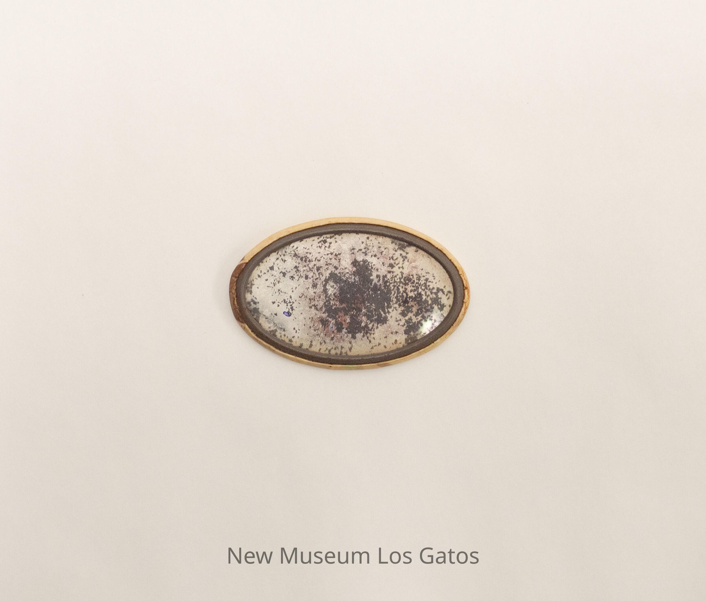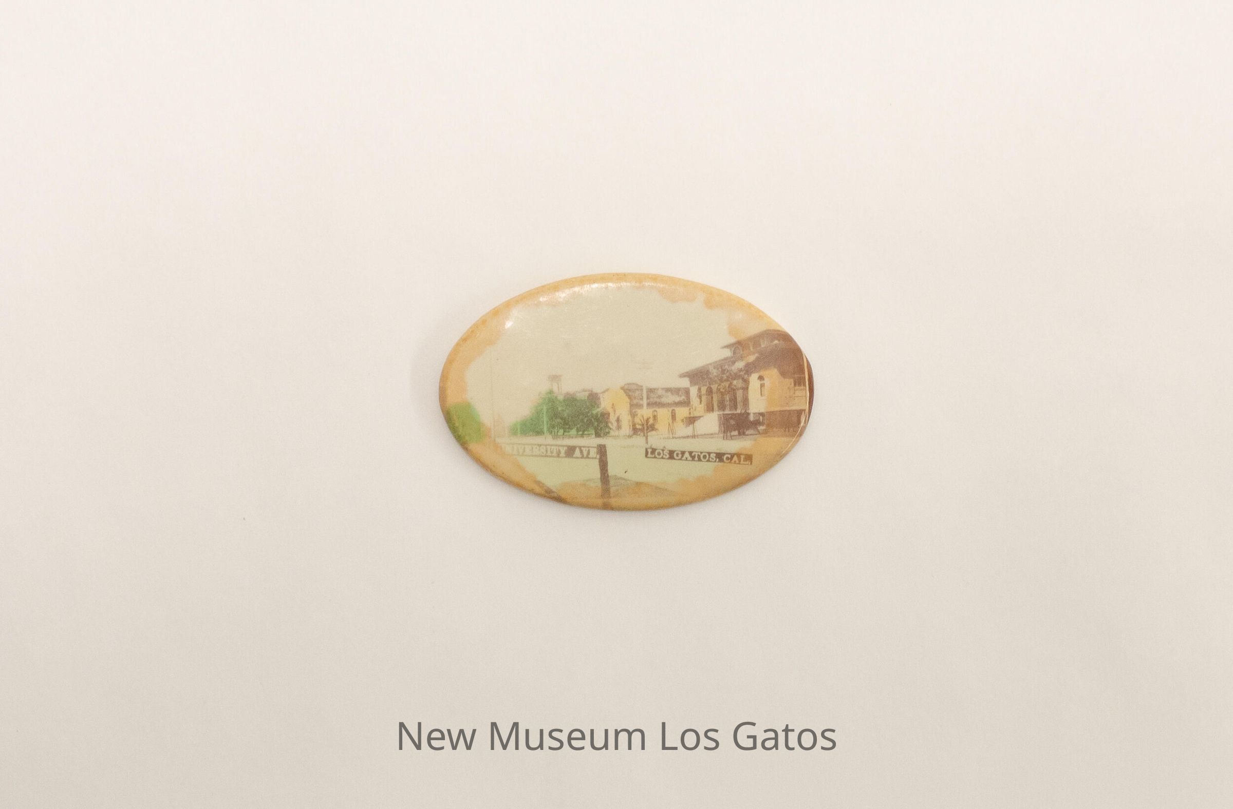 A small, oval compact mirror, with an illustrated scene of University Avenue in Los Gatos on the reverse side of the mirror.Collection