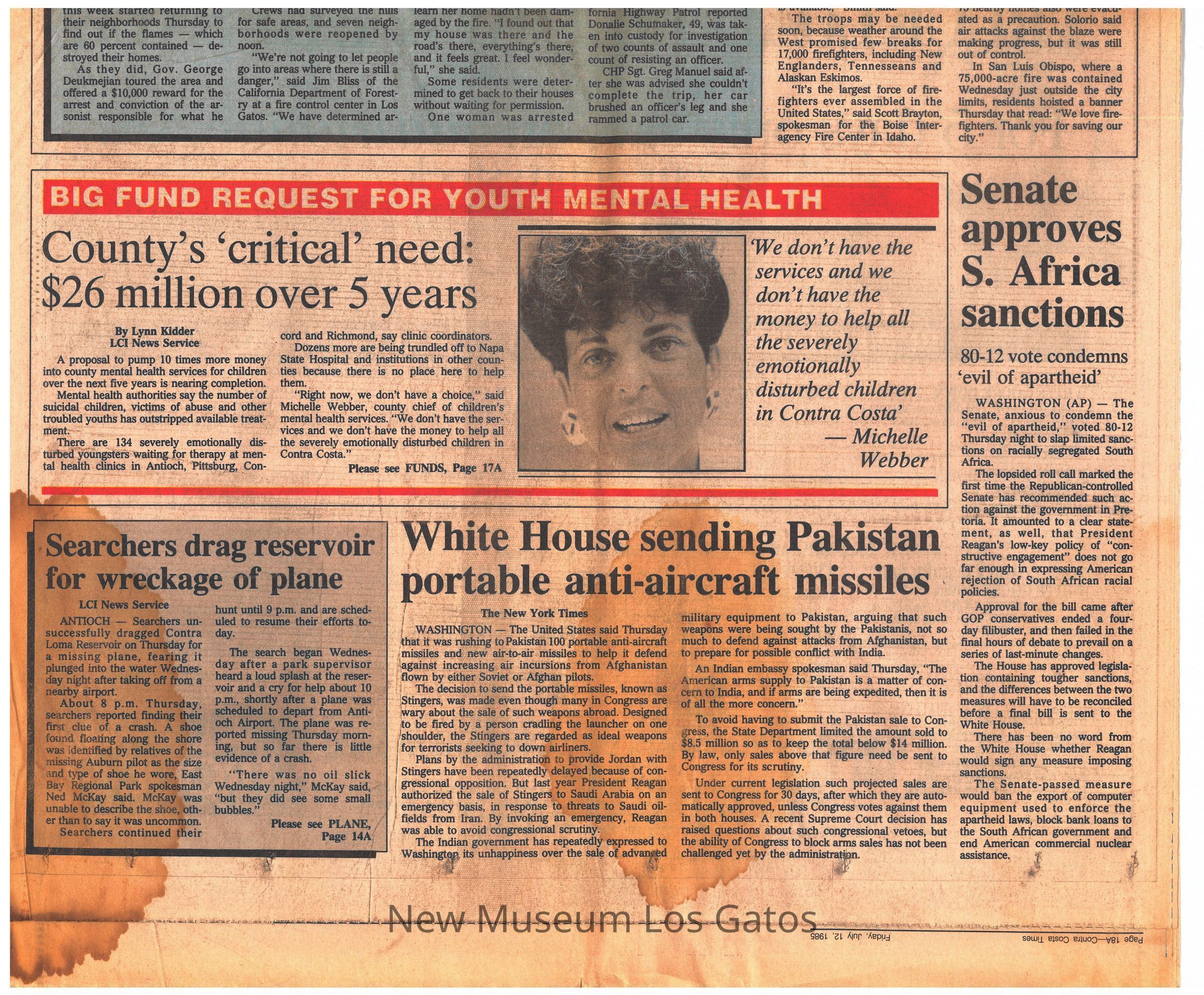 A partial newspaper with numerous articles and advertisements. The front page article is about the Los Gatos fire of 1985 near Lexington Reservoir, and the army's involvement in its control.Collection