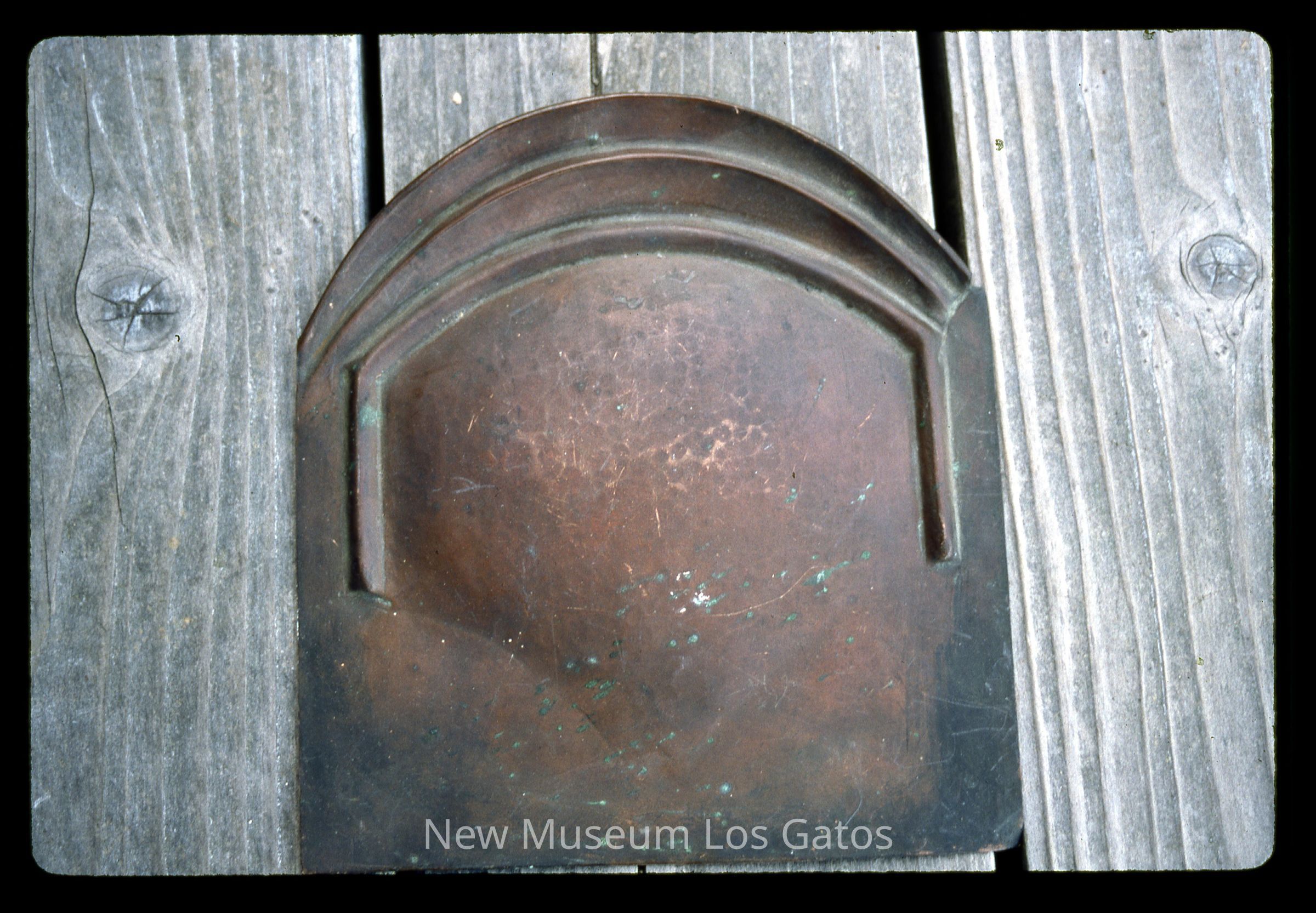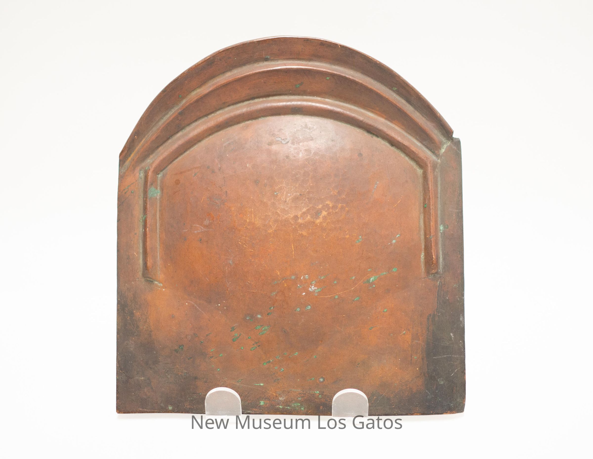 A mostly square thin copper piece with a rounded top. The rounded side angles up, with two grooves in the copper. The center of the piece is bumped out slightly.