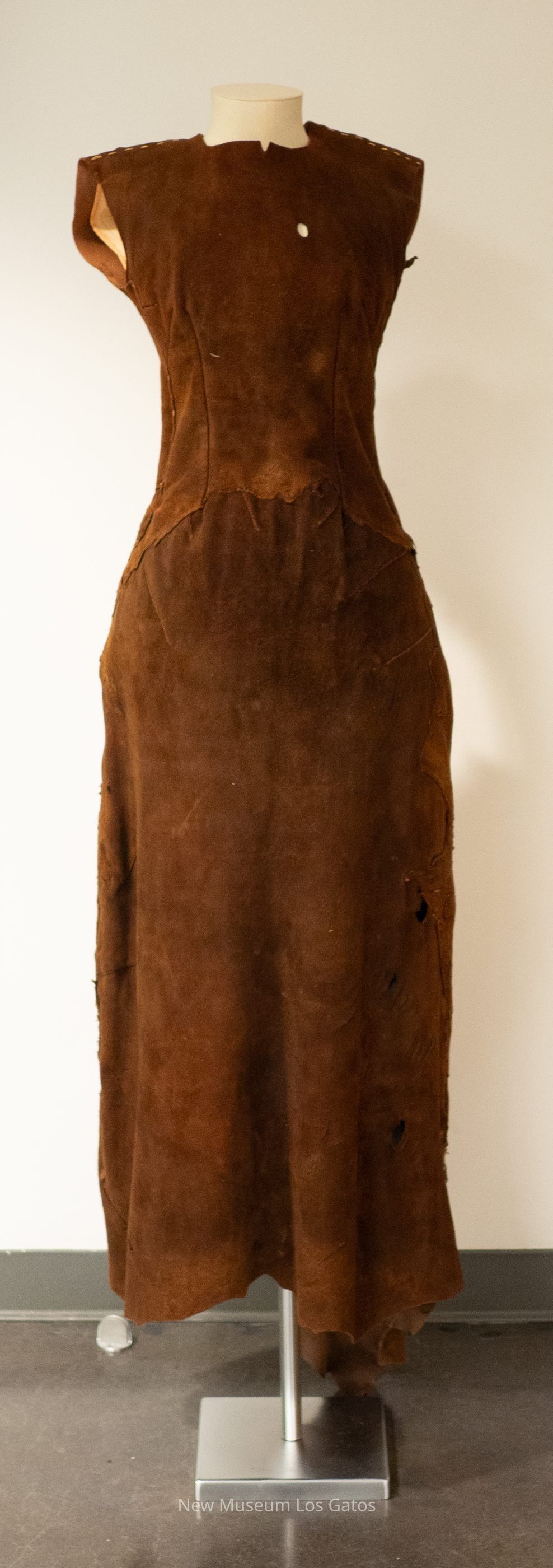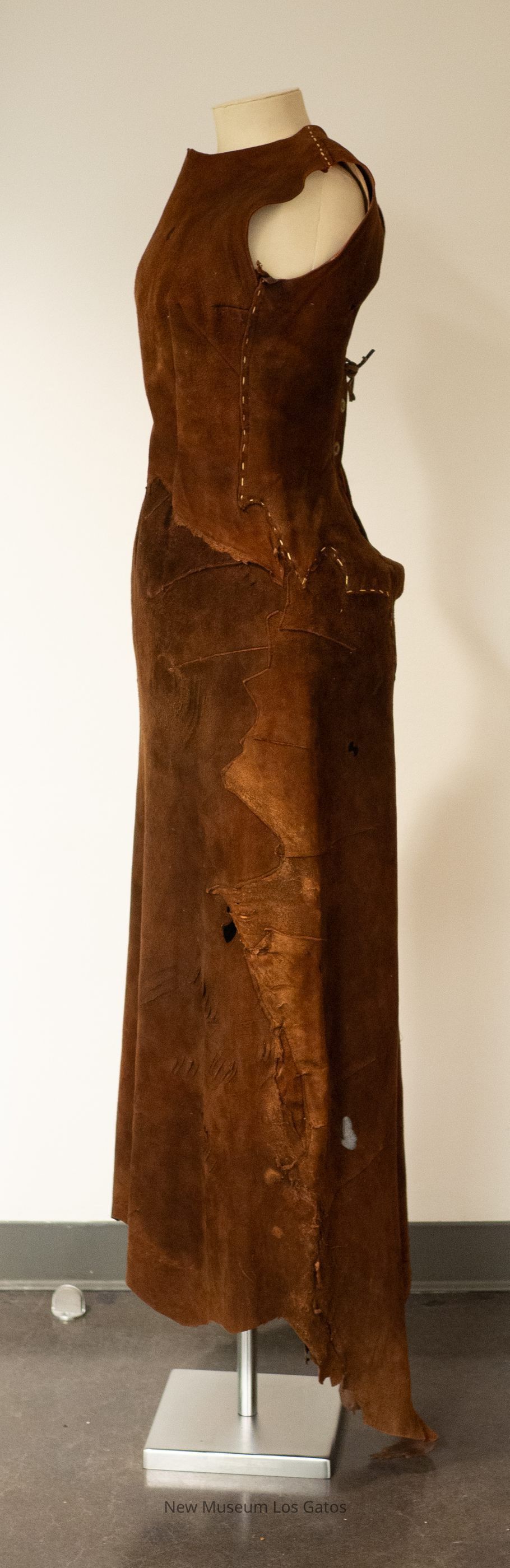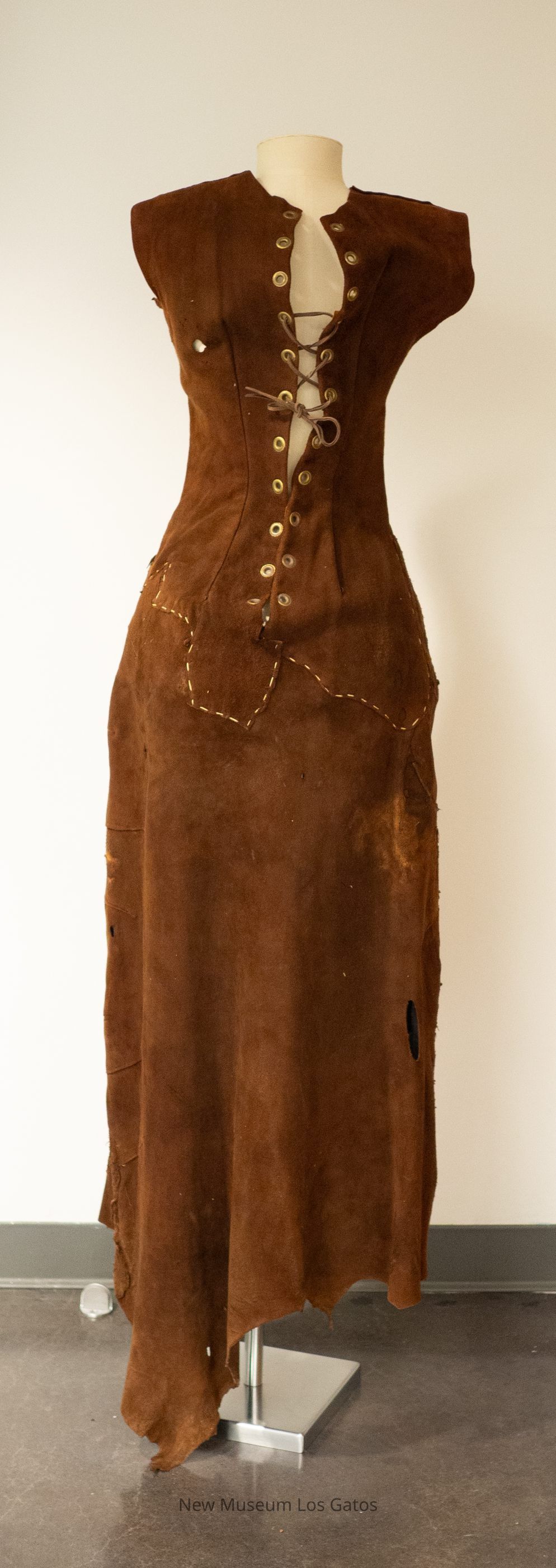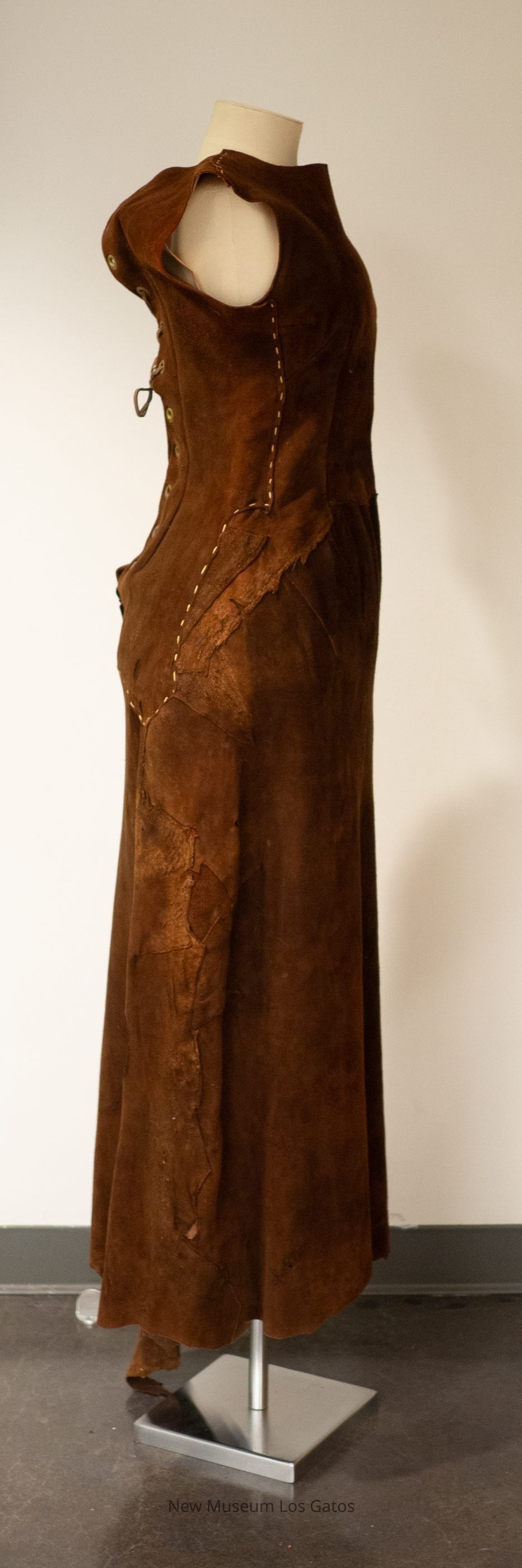 A sleeveless brown leather gown. The gown is designed to appear like it is from a primitive society, and has many obvious stitching marks and signs of distress throughout. The dress opens in the back, and has 11 brass grommets on either side of the opening, with a small leather strap tying the dress closed.Collection