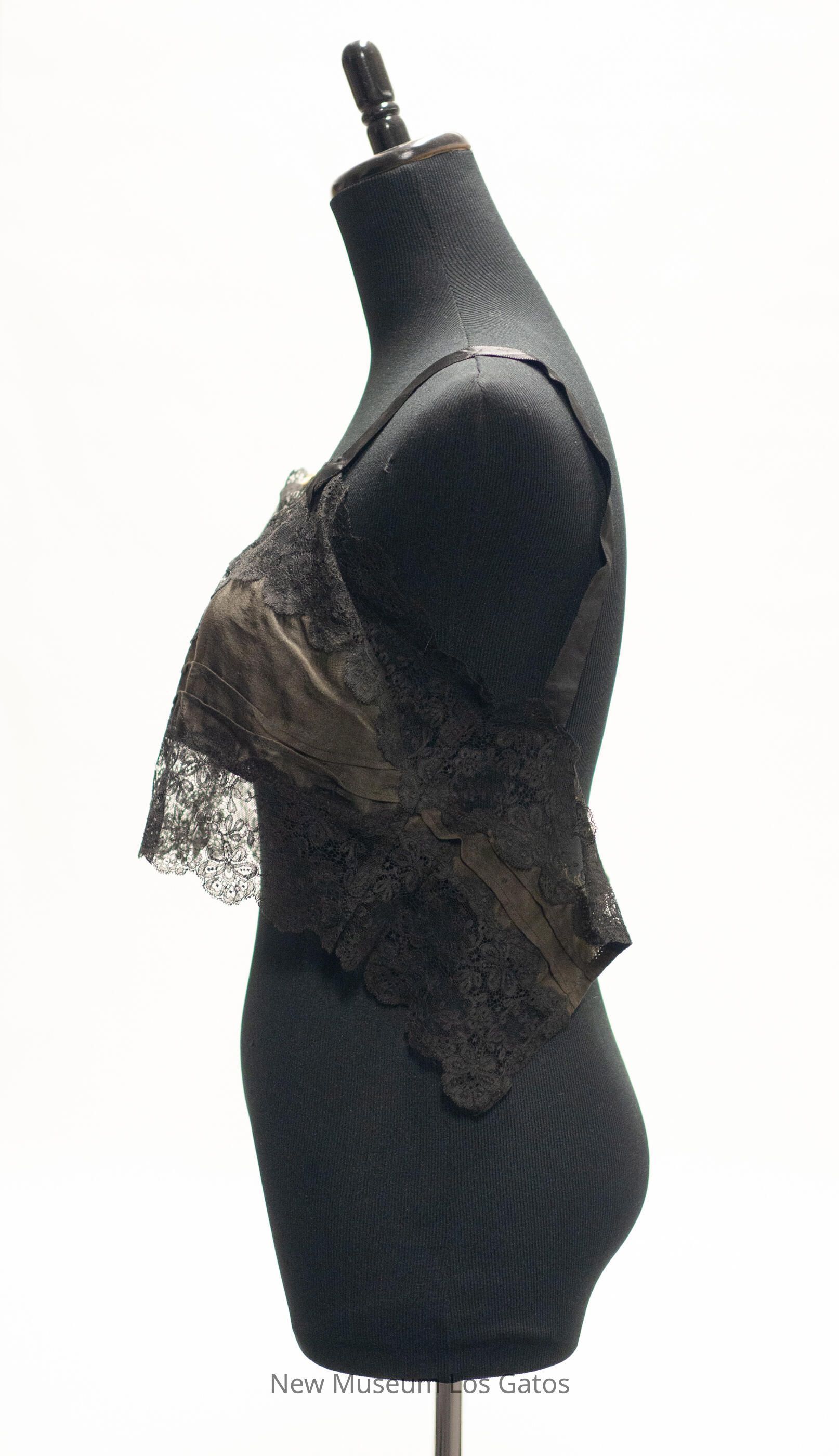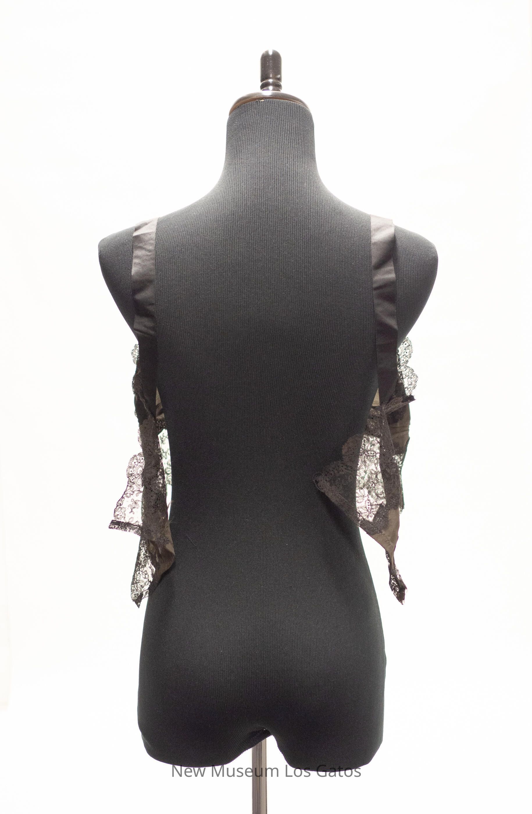 A black, silk corset top with black lace trim. The silk is in the center of the top, with floral black lace along the top and bottom of the silk. The straps are also black silk. There are three small, cream-colored decorative silk flowers in the center-top of the corset top.Collection