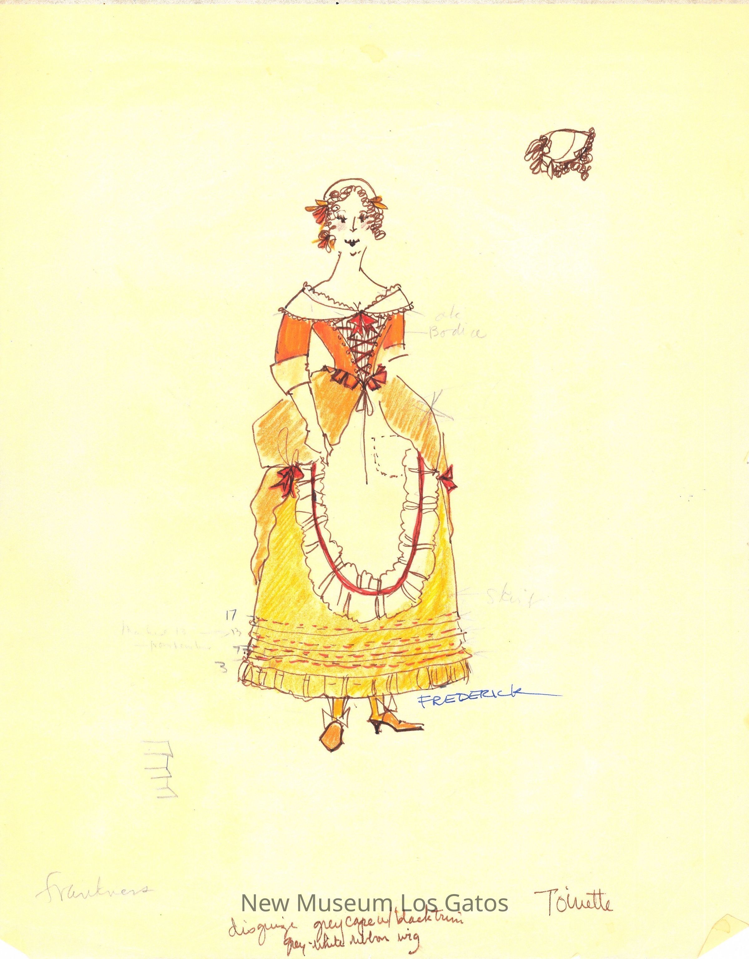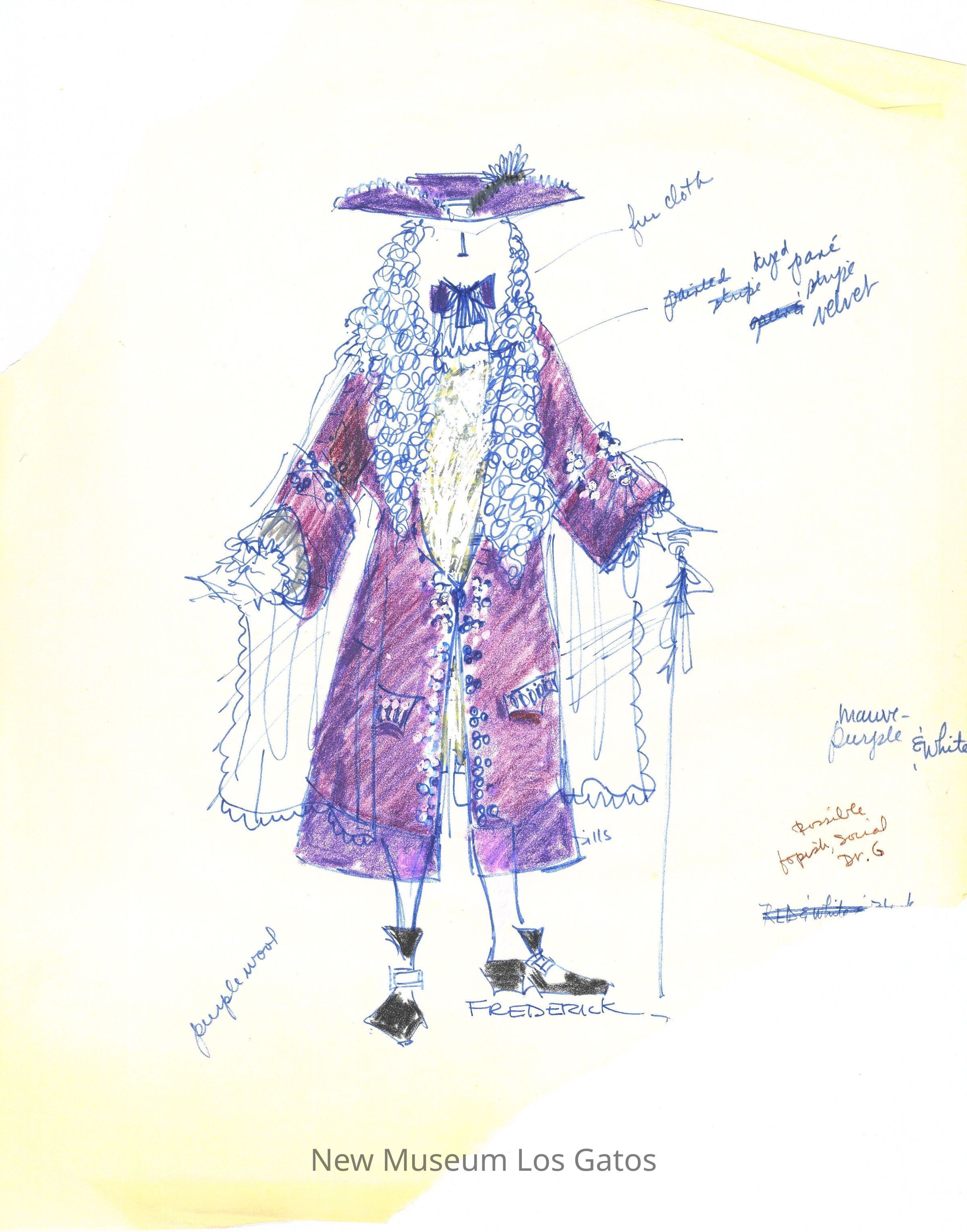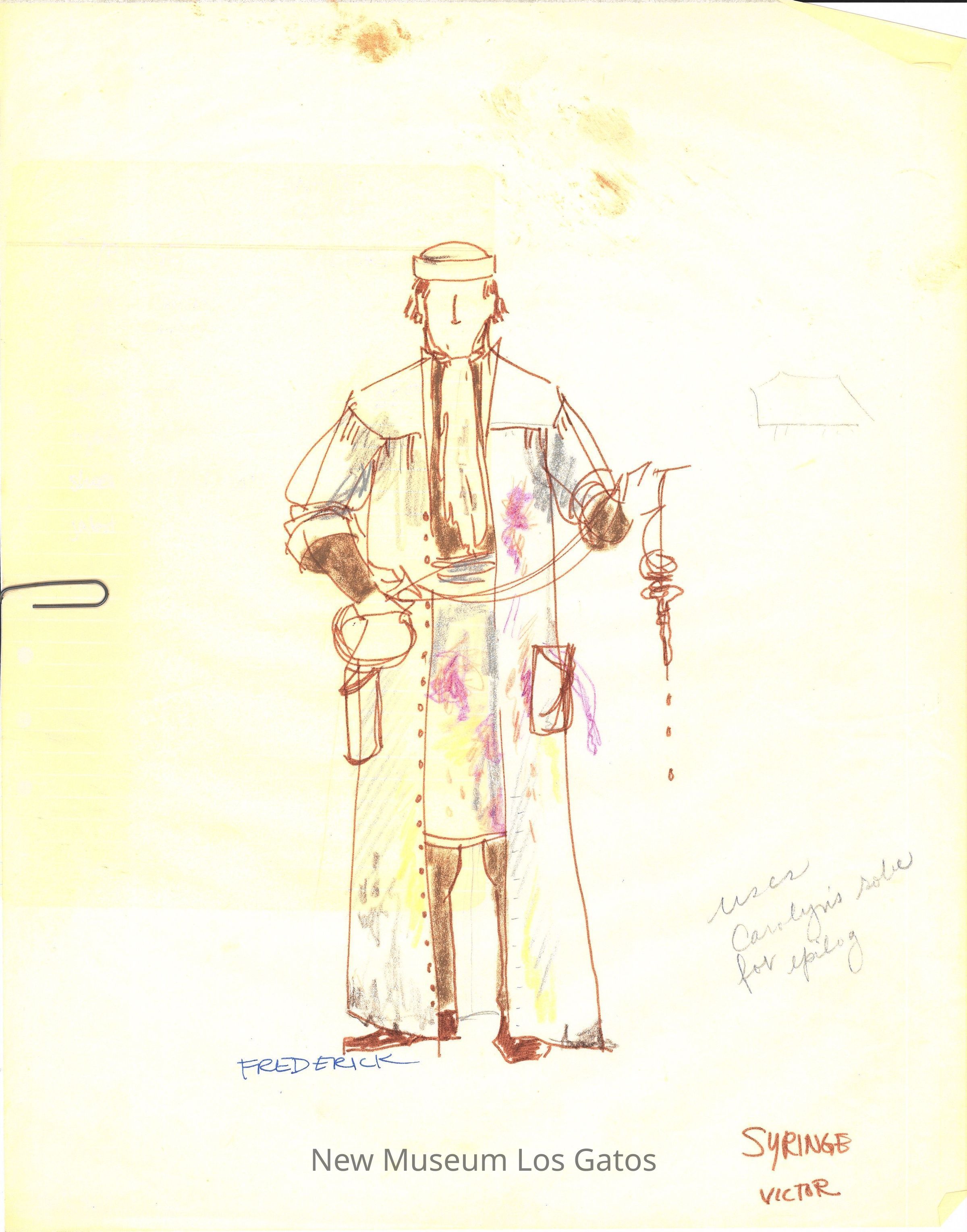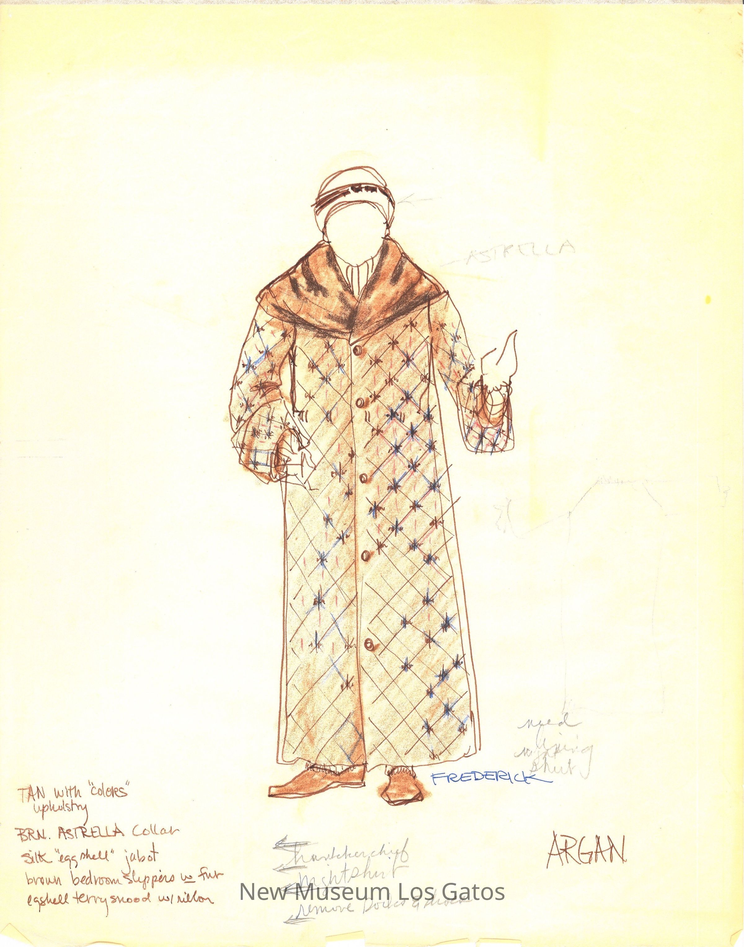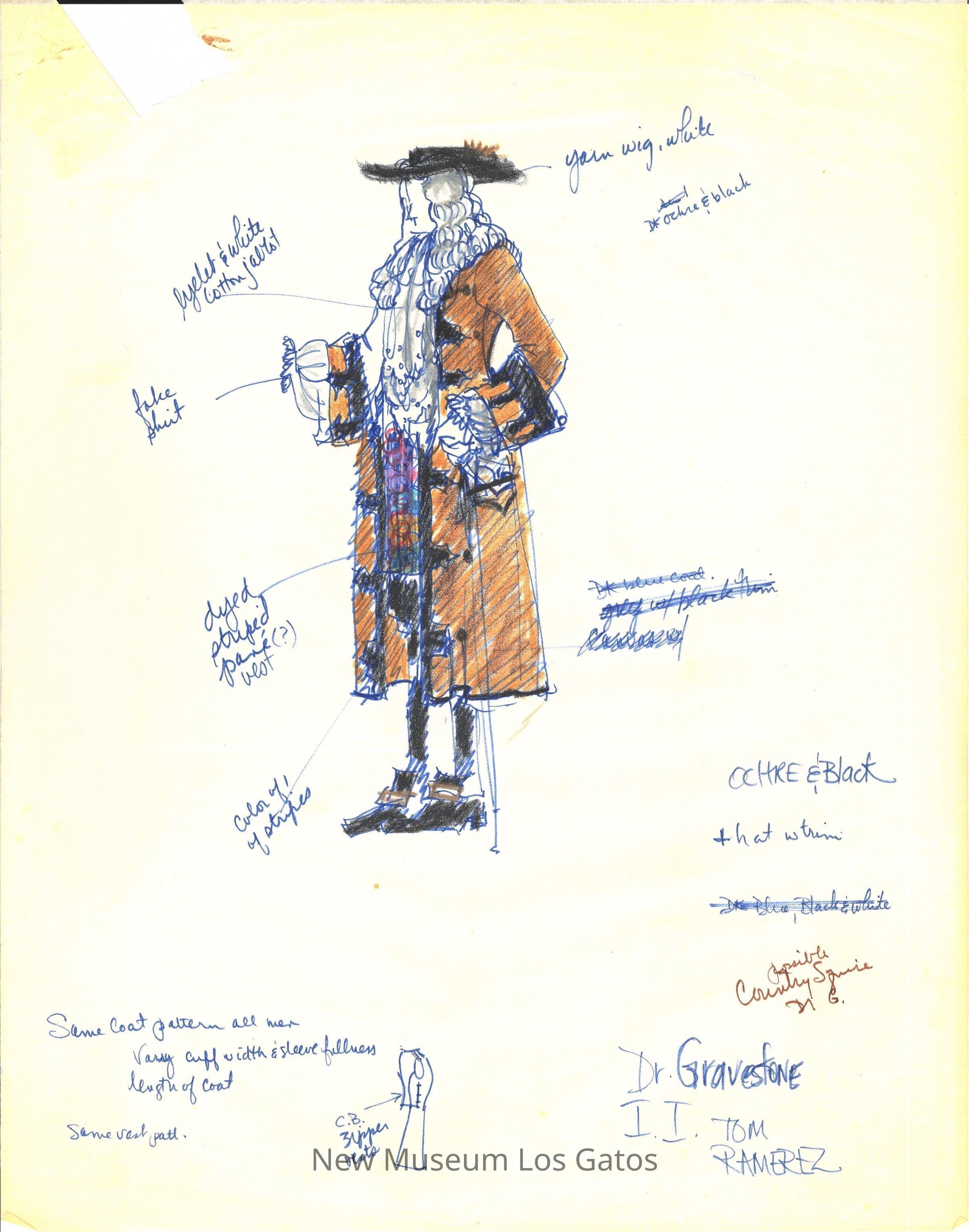 Eleven pages of various preliminary costume renderings with notes, measurements, and thoughts for the 1975-76 California Actors Theatre production of "The Imaginary Invalid." The drawings are on large, semi-translucent pieces of paper.Type of Drawing