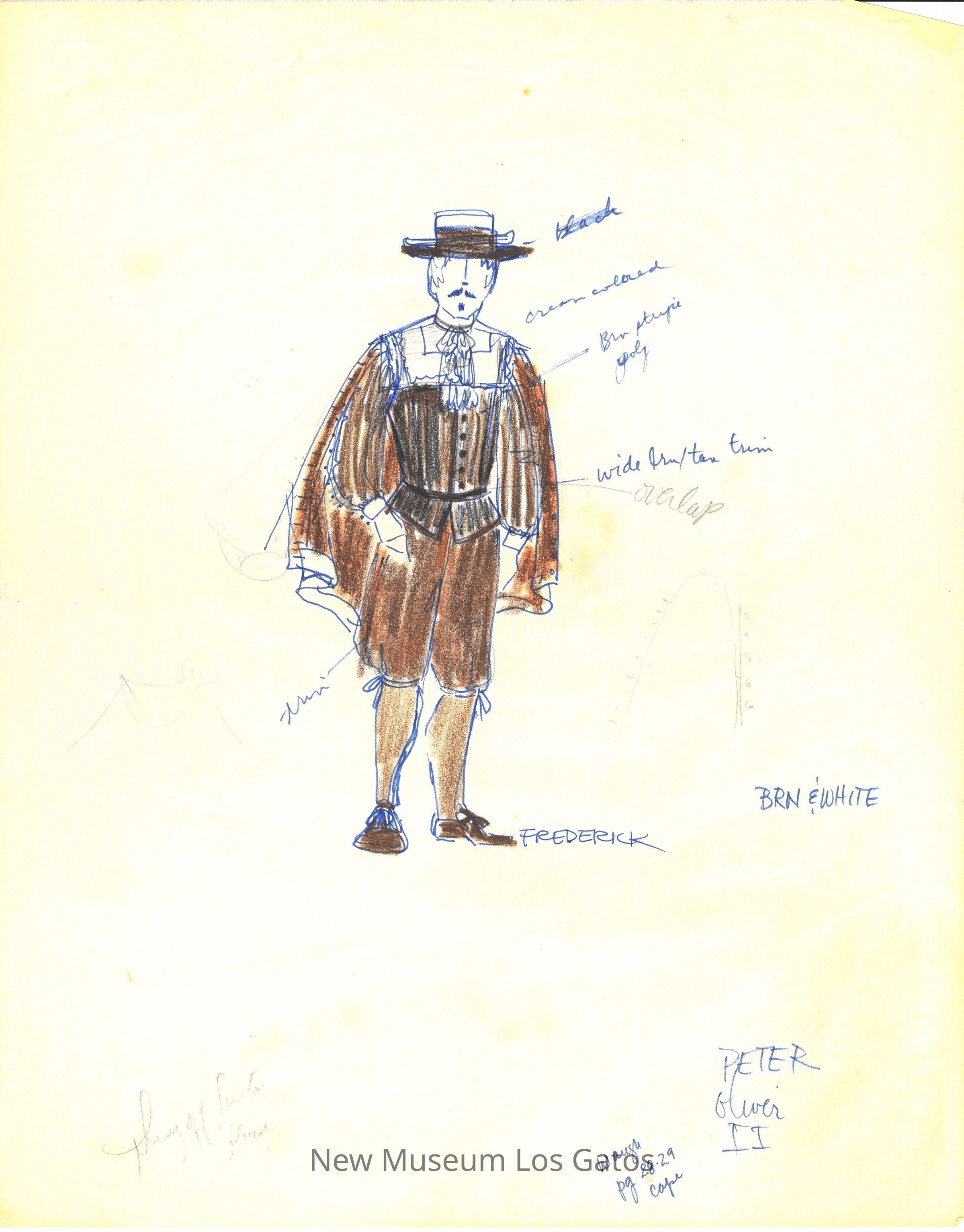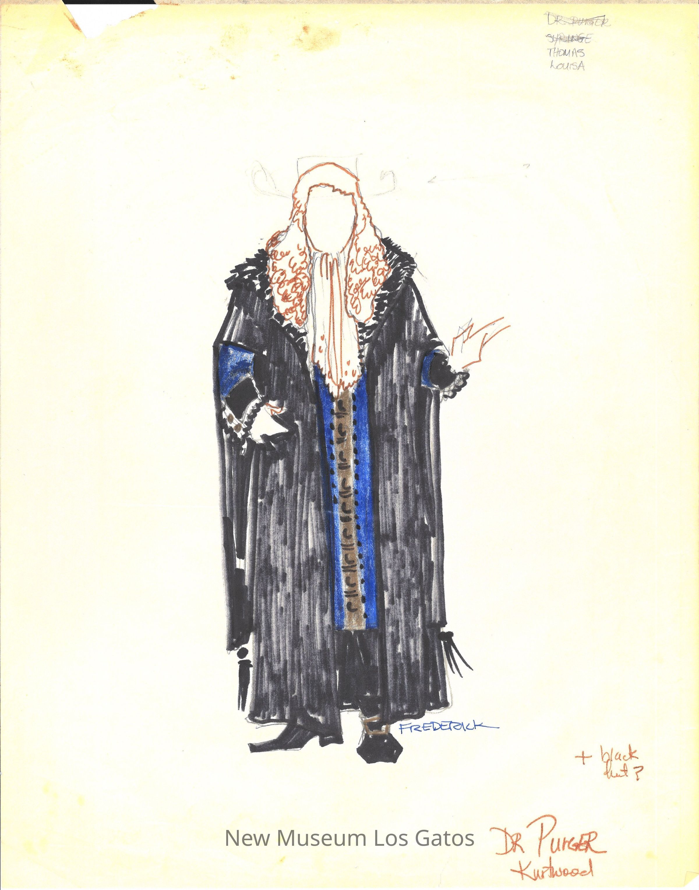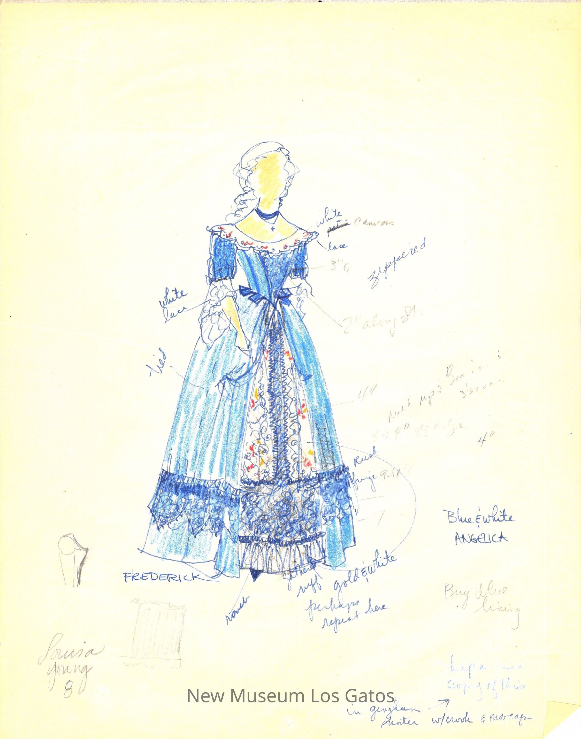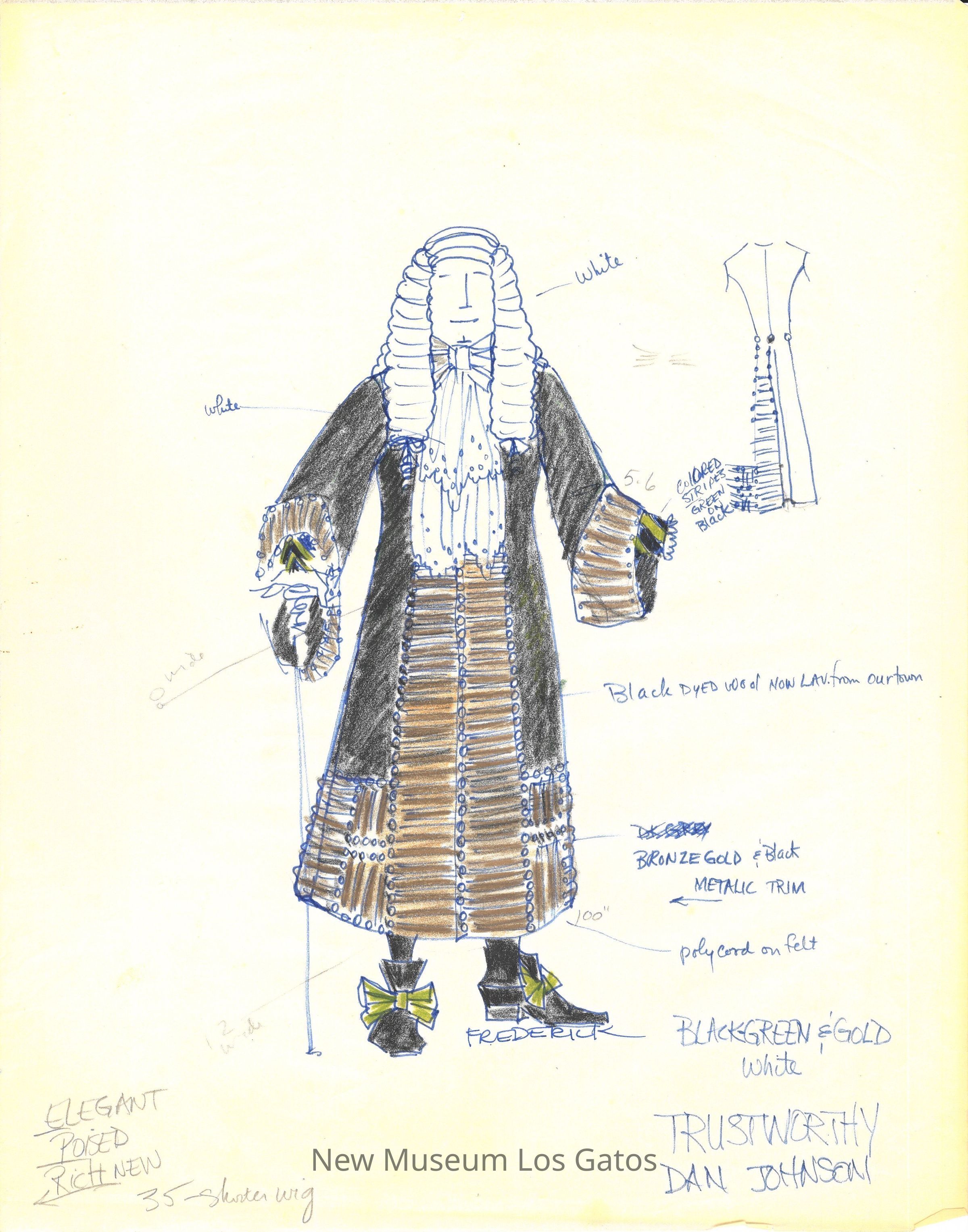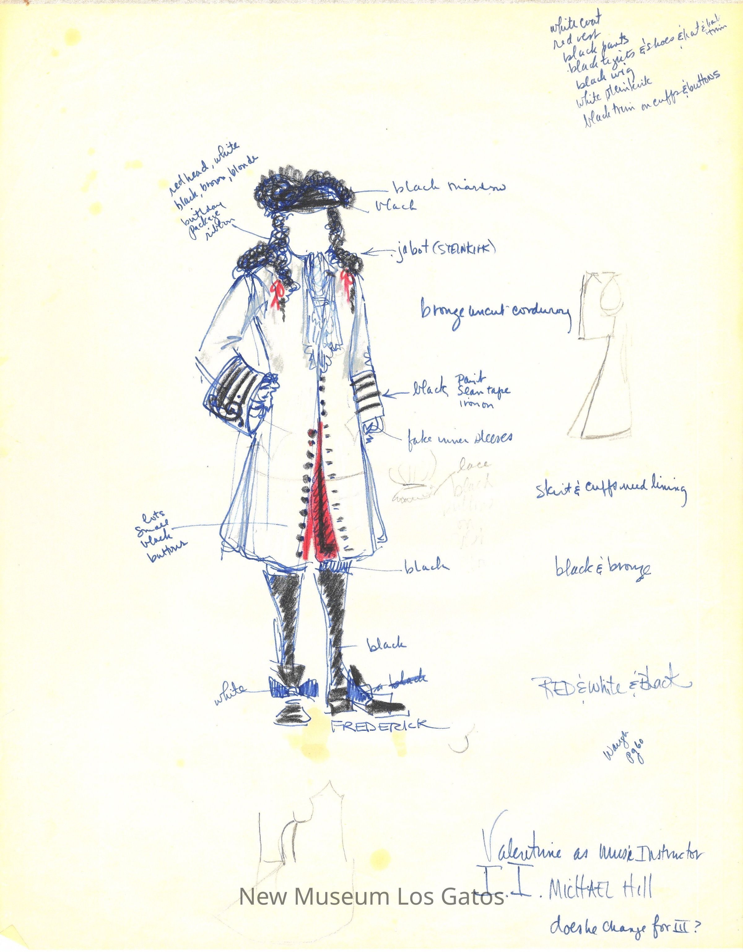 Eleven pages of various preliminary costume renderings with notes, measurements, and thoughts for the 1975-76 California Actors Theatre production of "The Imaginary Invalid." The drawings are on large, semi-translucent pieces of paper.Type of Drawing