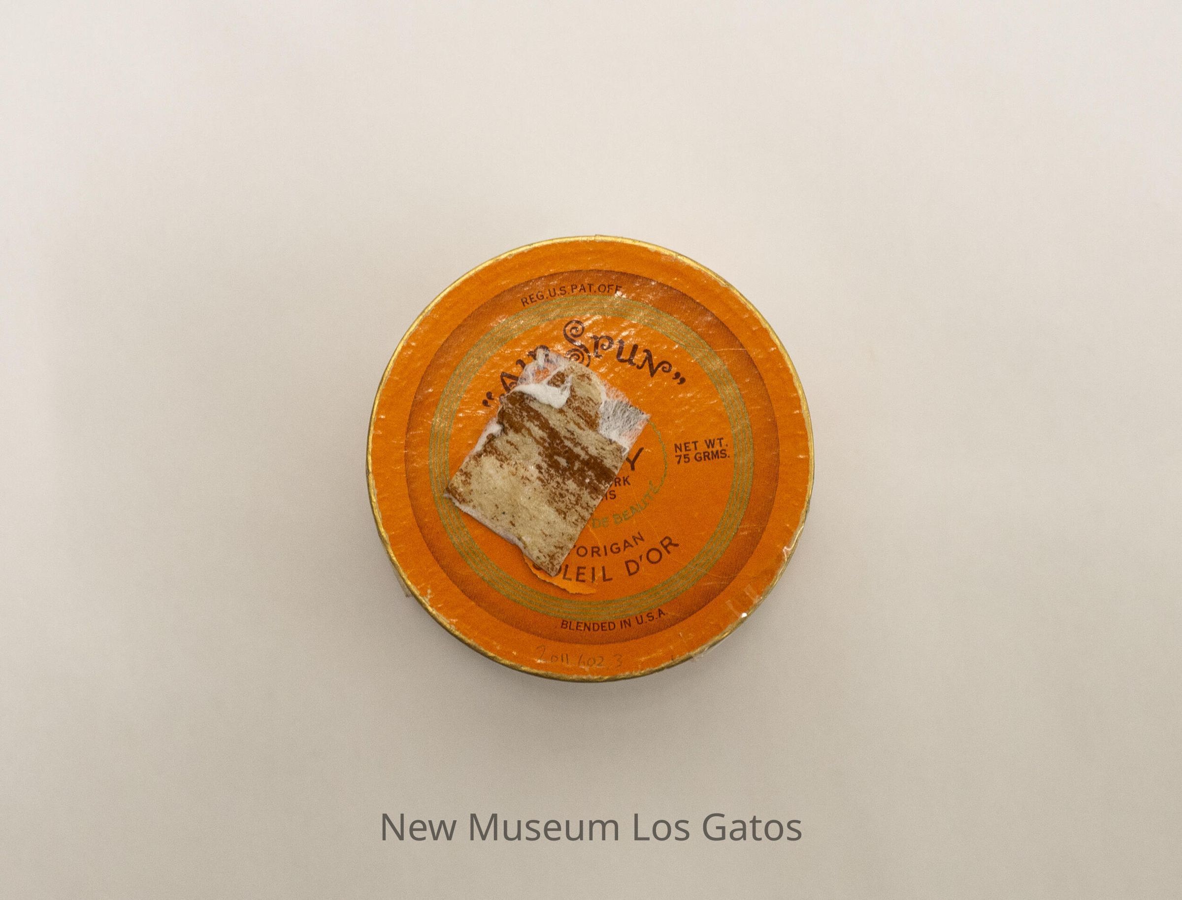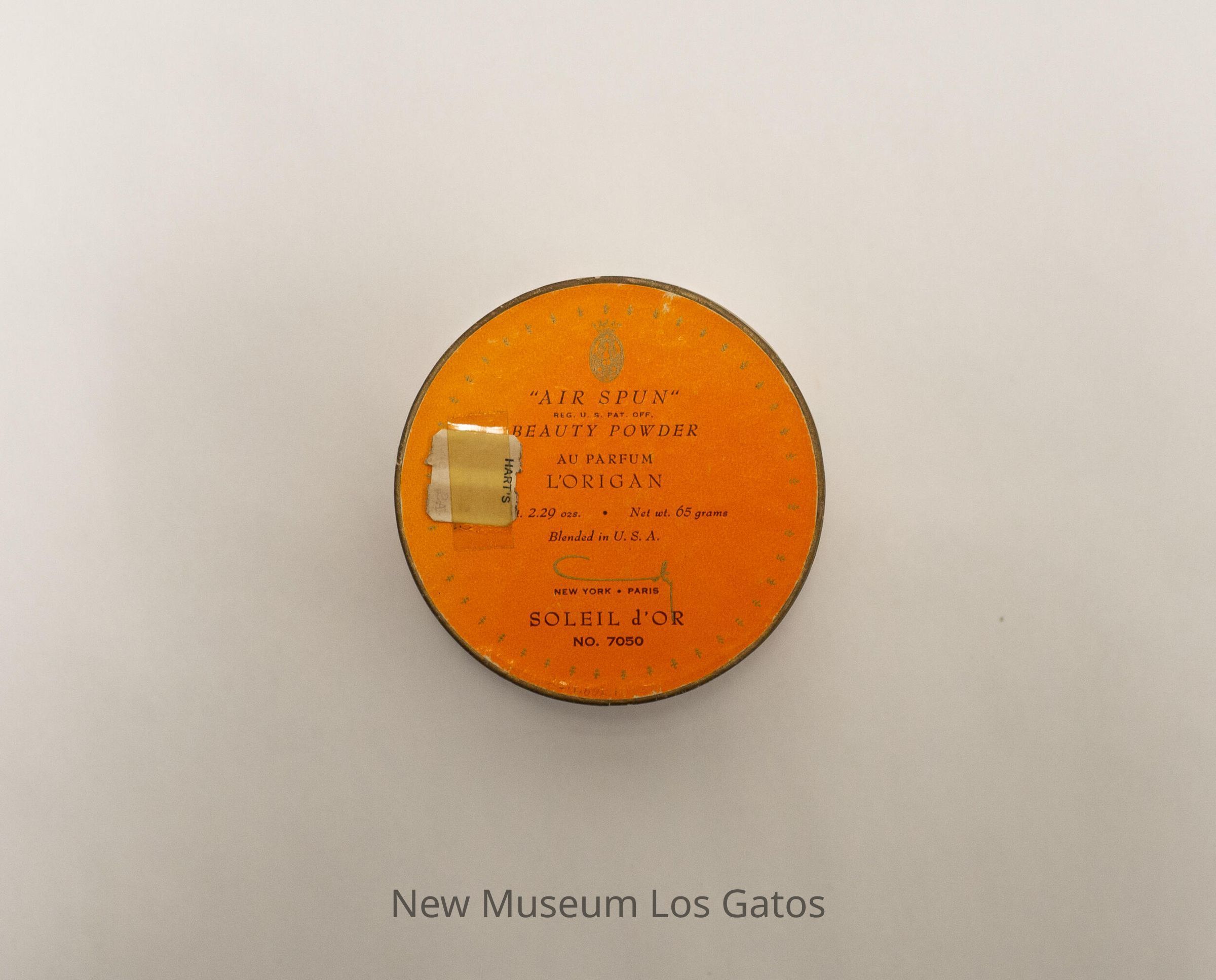 "AIR SPUN" / REG. U.S. PAT. OFF. / BEAUTY POWDER / AU PARFUM / L'ORIGAN / Net wt. 2.29 ozs. Net wt. 65 grams / Blended in U.S.A. / Coty NEW YORK PARIS / SOLEIL d'OR / NO. 7050Language