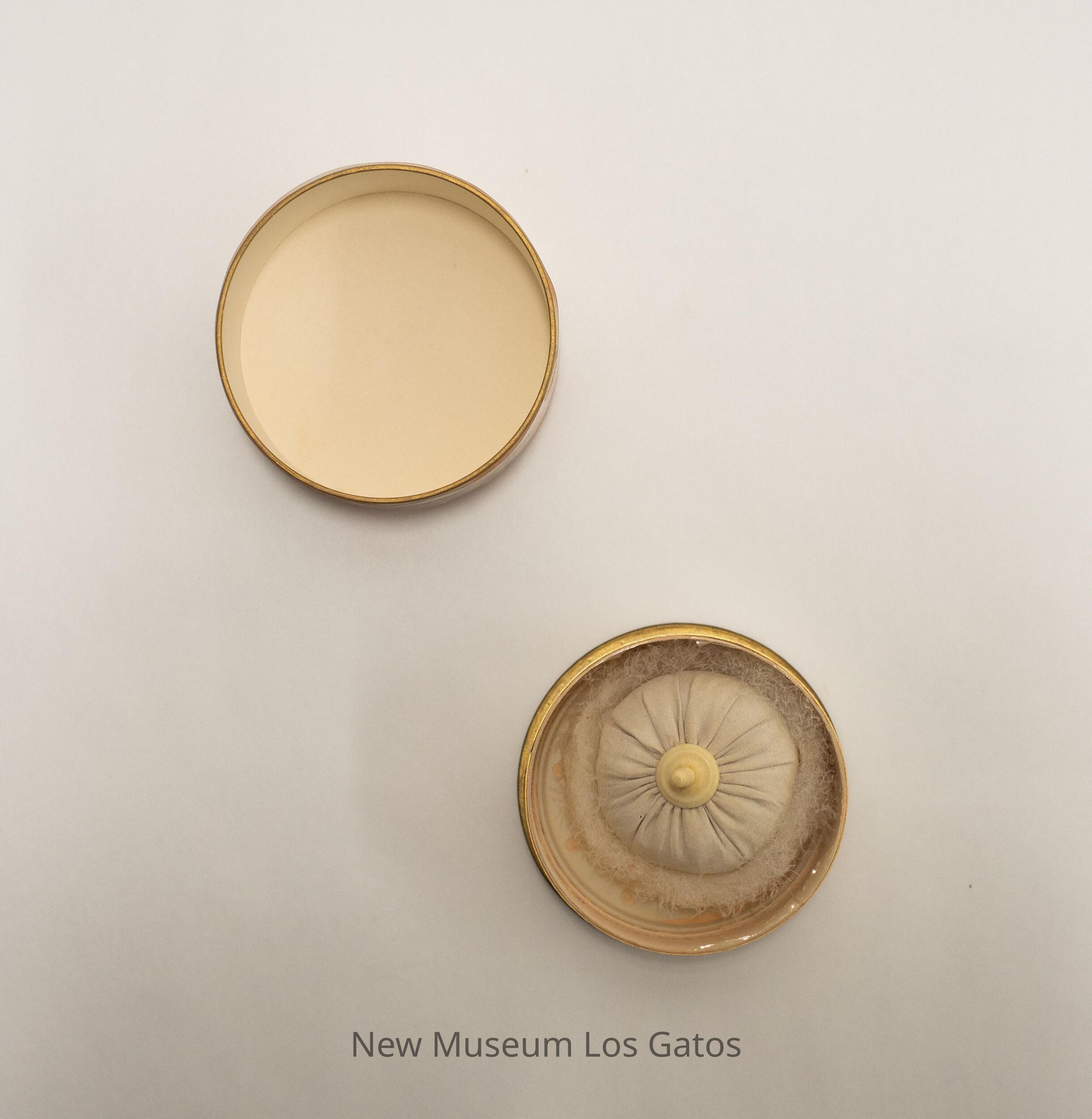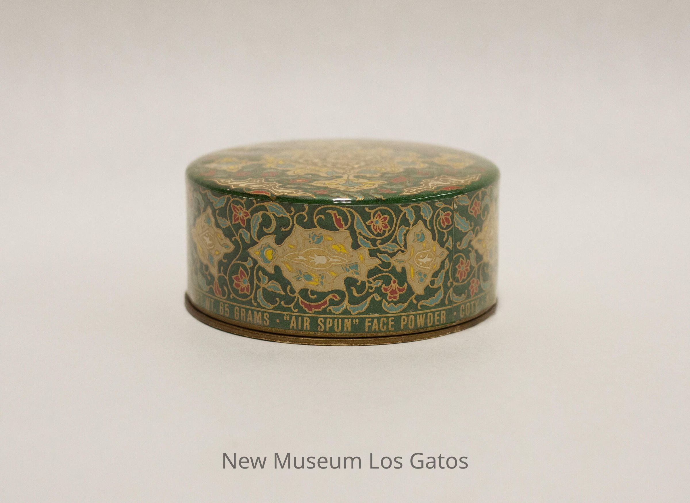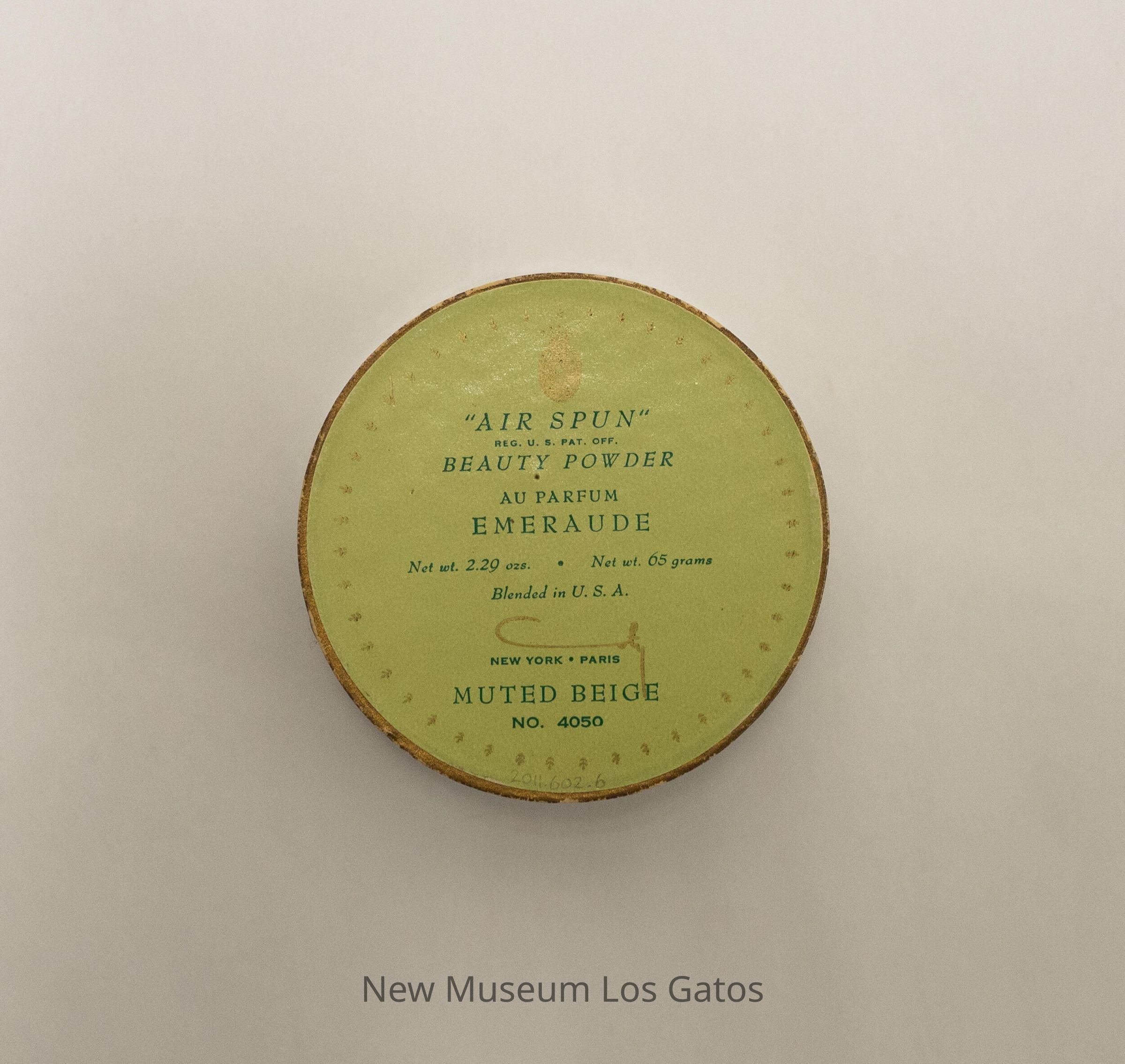 "AIR SPUN" / REG. U.S. PAT. OFF. / BEAUTY POWDER / AU PARFUM / EMERAUDE / Net wt. 2.29 ozs. / Net wt. 65 grams / Blended in U.S.A. / Coty NEW YORK PARIS / MUTED BEIGE / NO. 4050Language