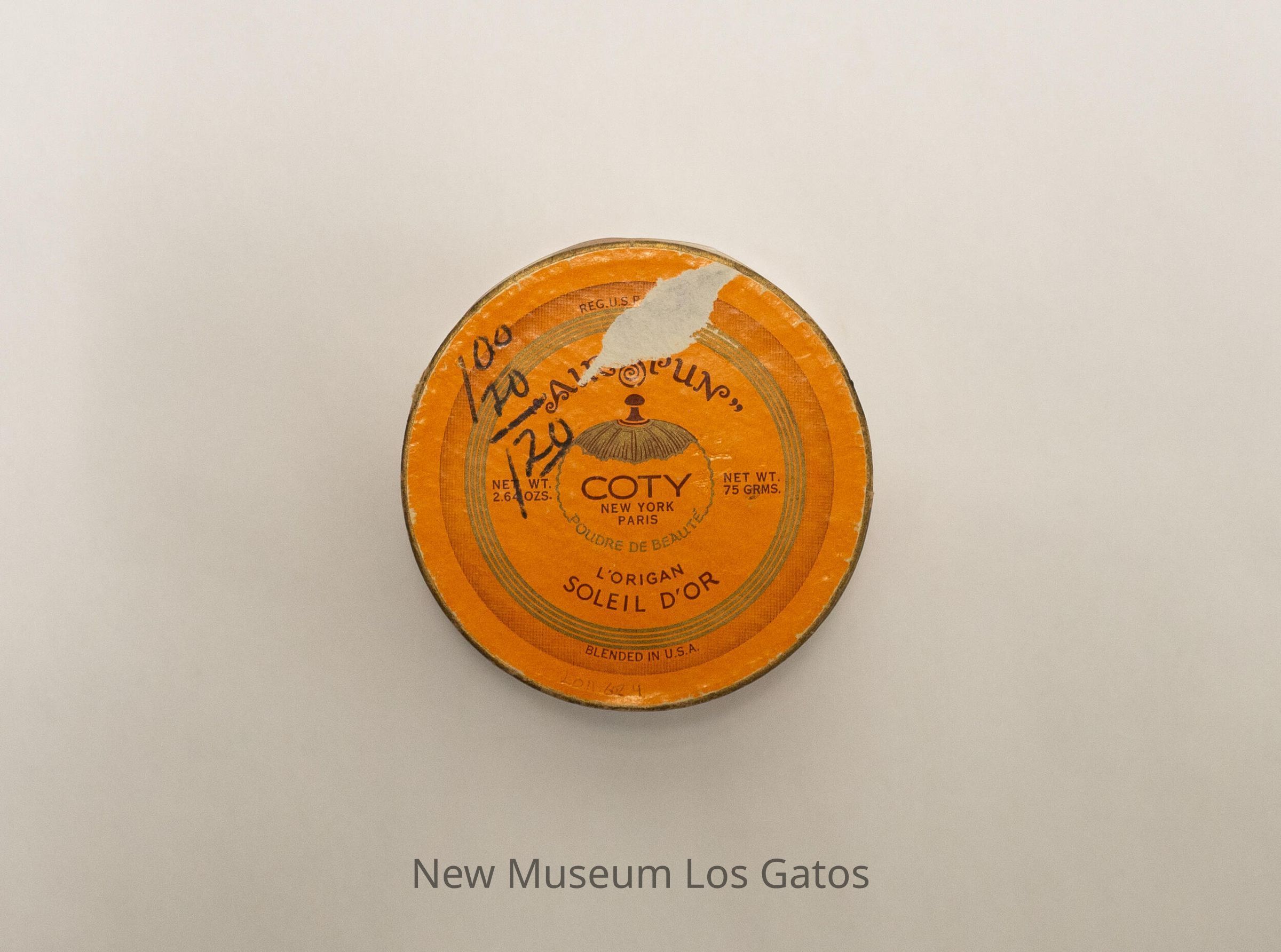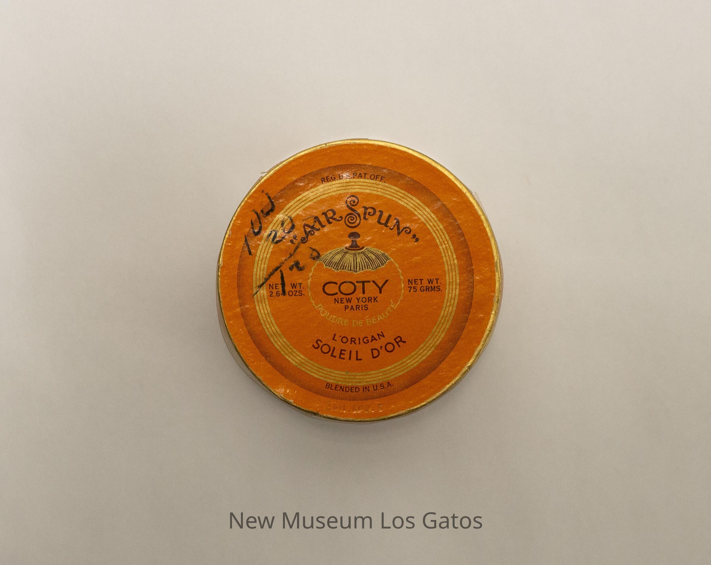 REG. U.S. PAT. OFF. / "AIR SPUN" / NET WT. 2.64 OZS. / COTY NEW YORK PARIS / POUDRE DE BEAUTÉ / NET WT. 75 GRMS. / L'ORIGAN / SOLEIL D'OR / BLENDED IN U.S.A.Language