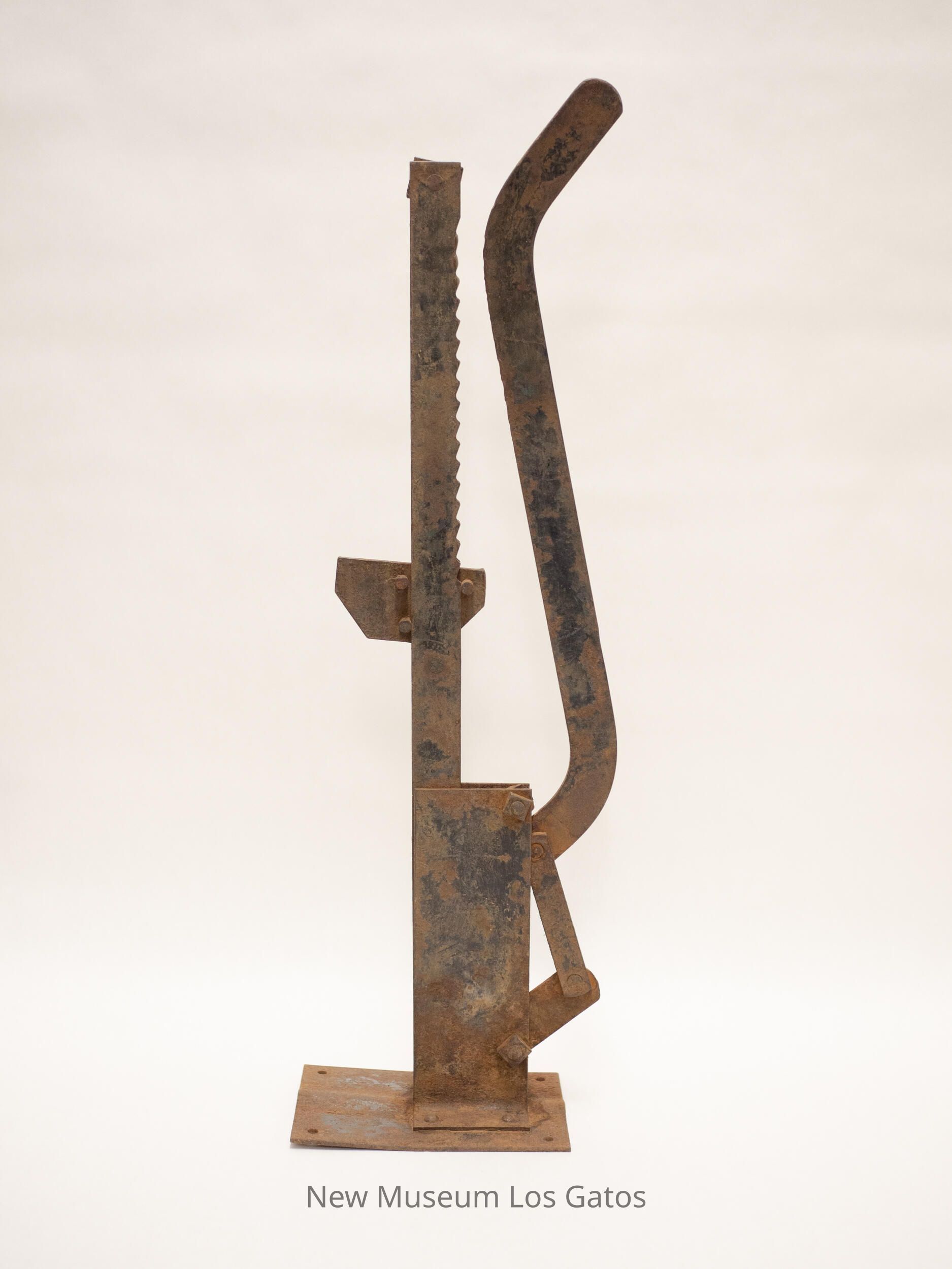 Covered wagon wheel jack, consists of a base, with a handle that pushes the ridged center rectangular piece up and down.Collection