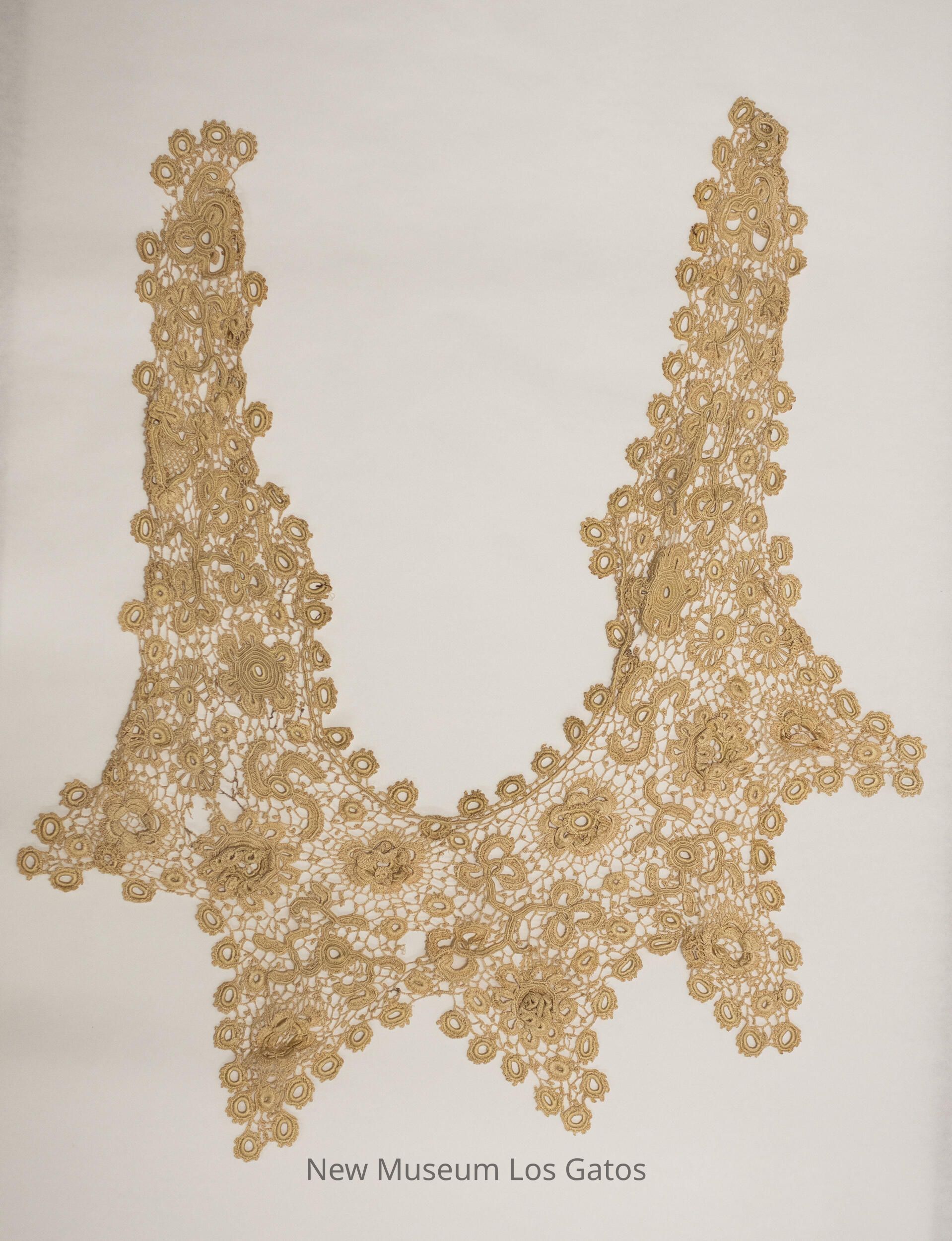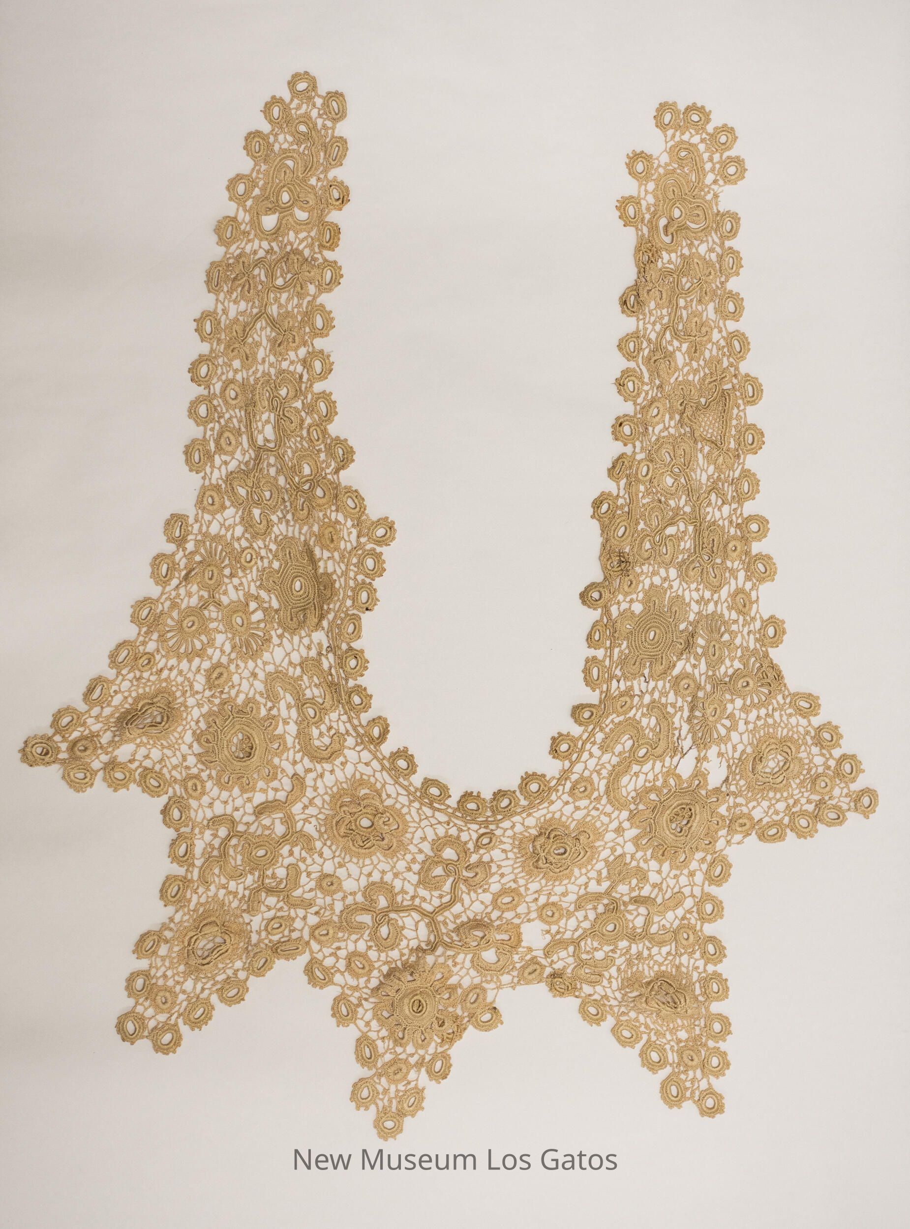 Large, crocheted collar with floral patterning and five points along the bottom.Collection