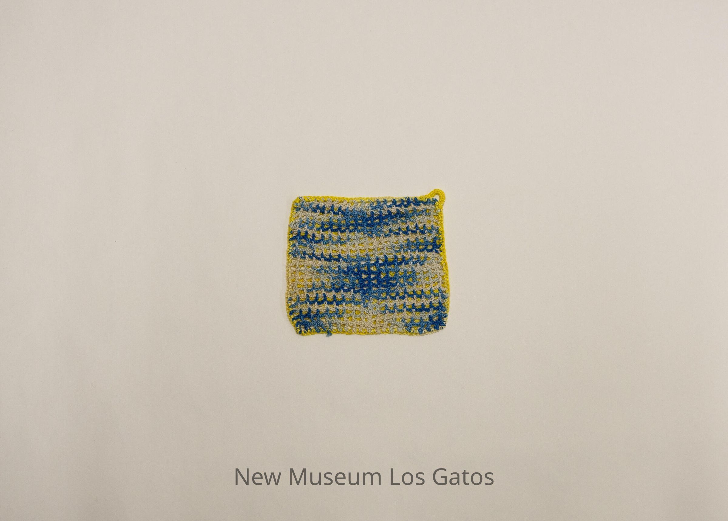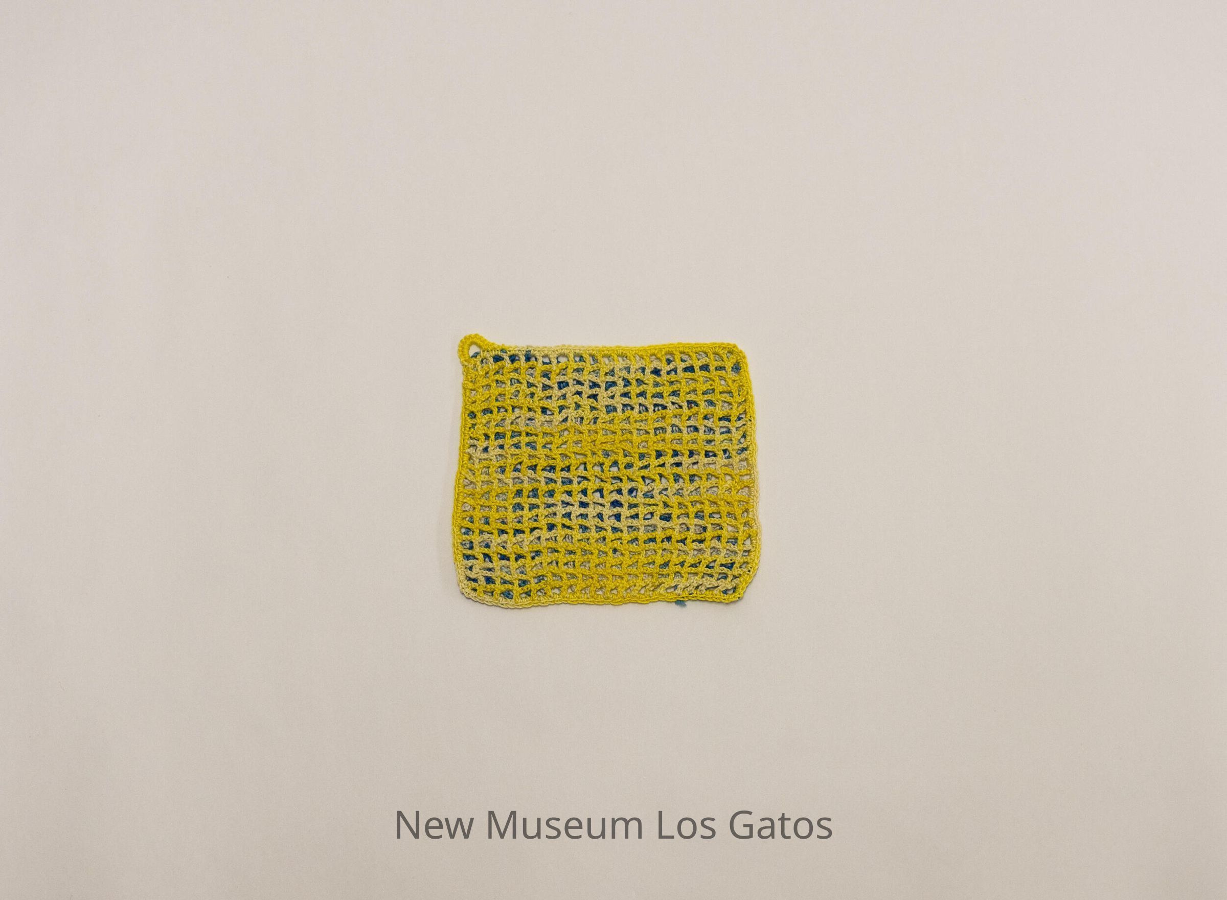 Square, crocheted pot holder with blue and white in the center, and yellow around the edge and on the back.Collection