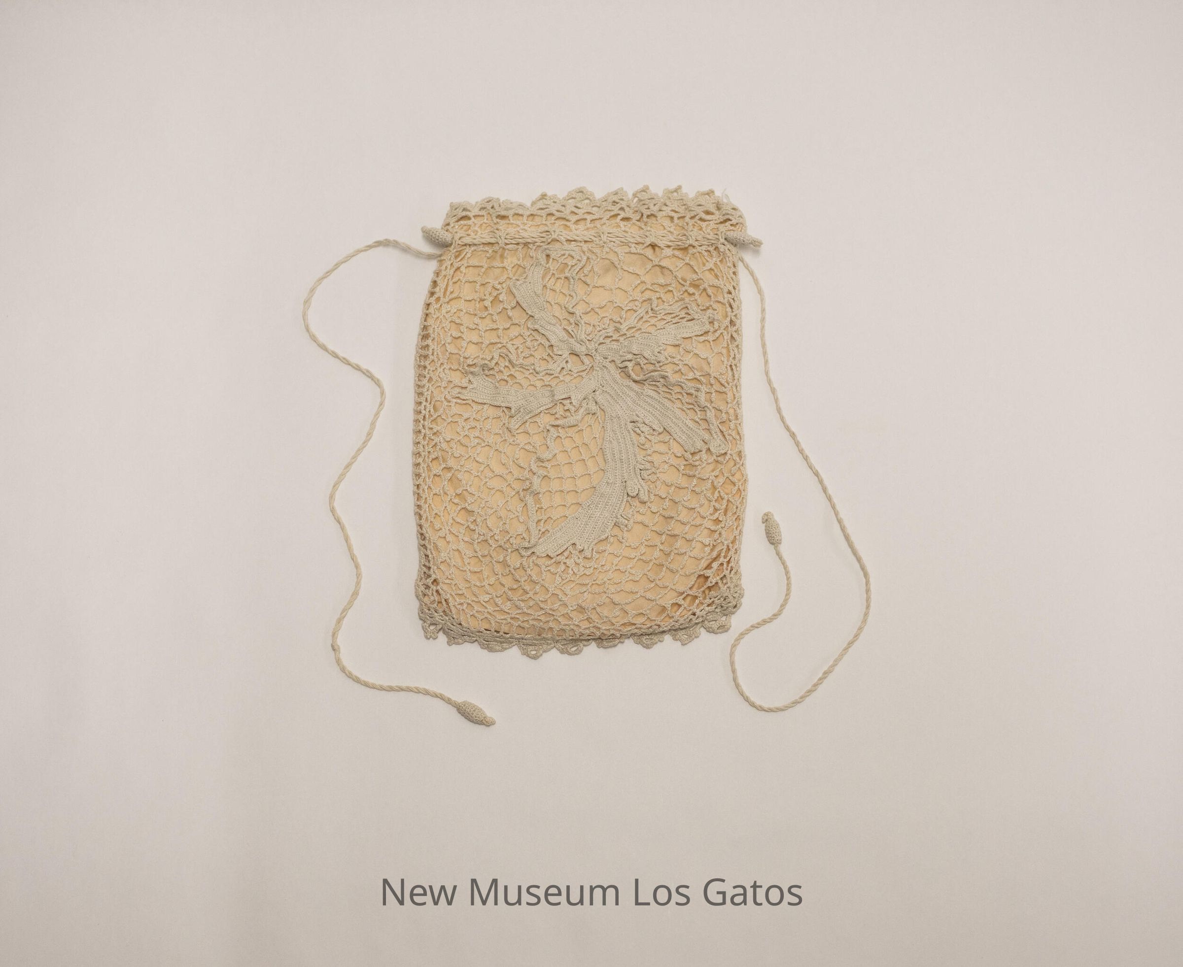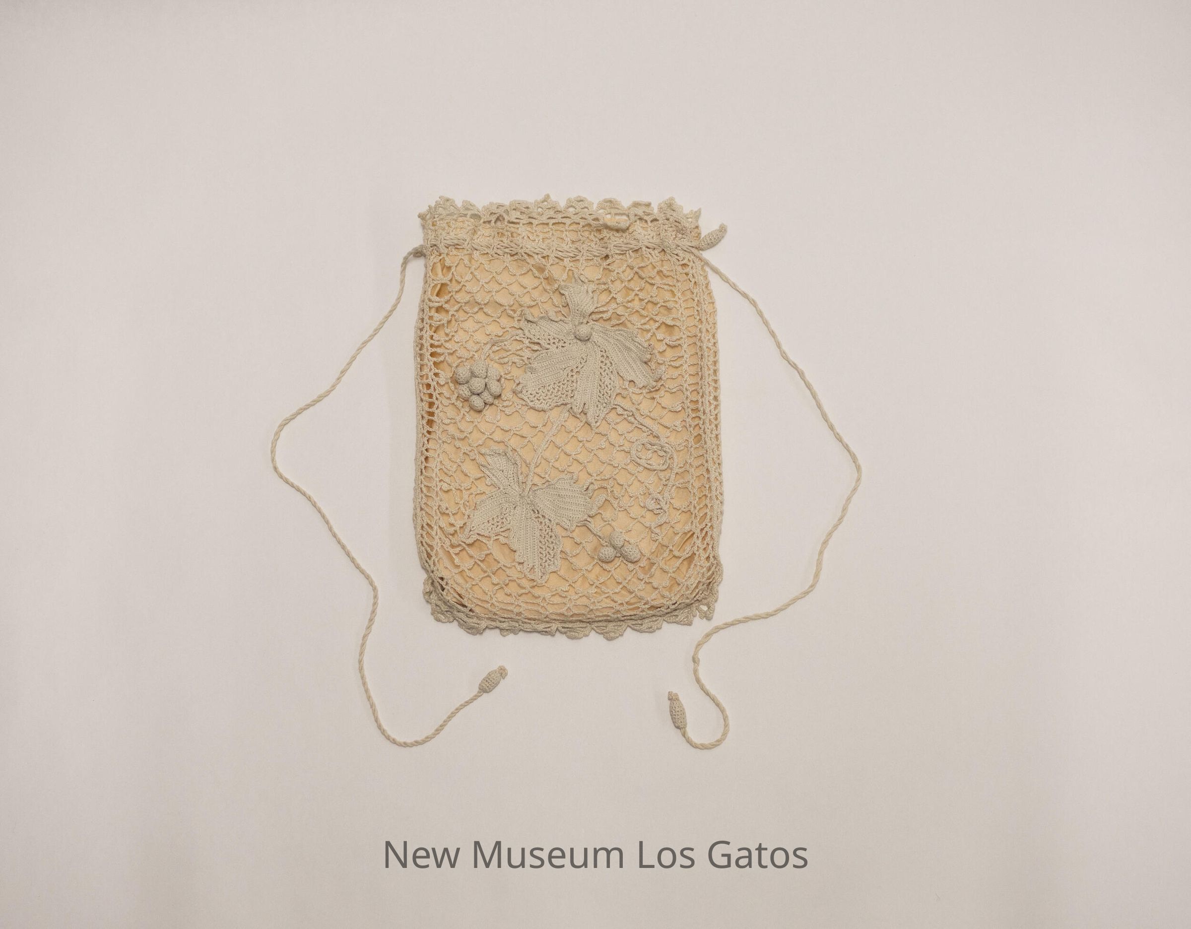 White crocheted drawstring purse, with cream colored lining. The front has a flower, leaf, and berries decoration.Collection