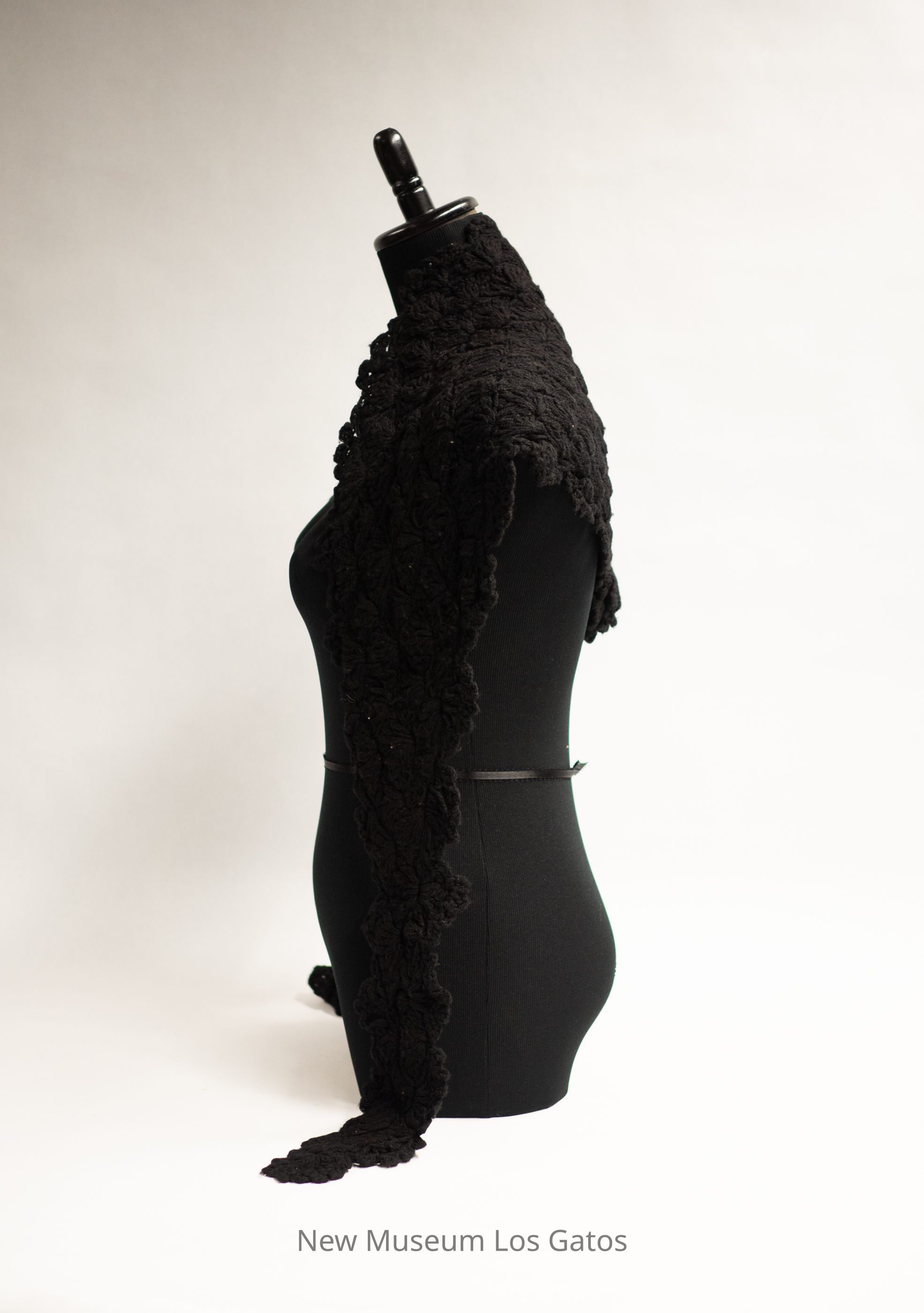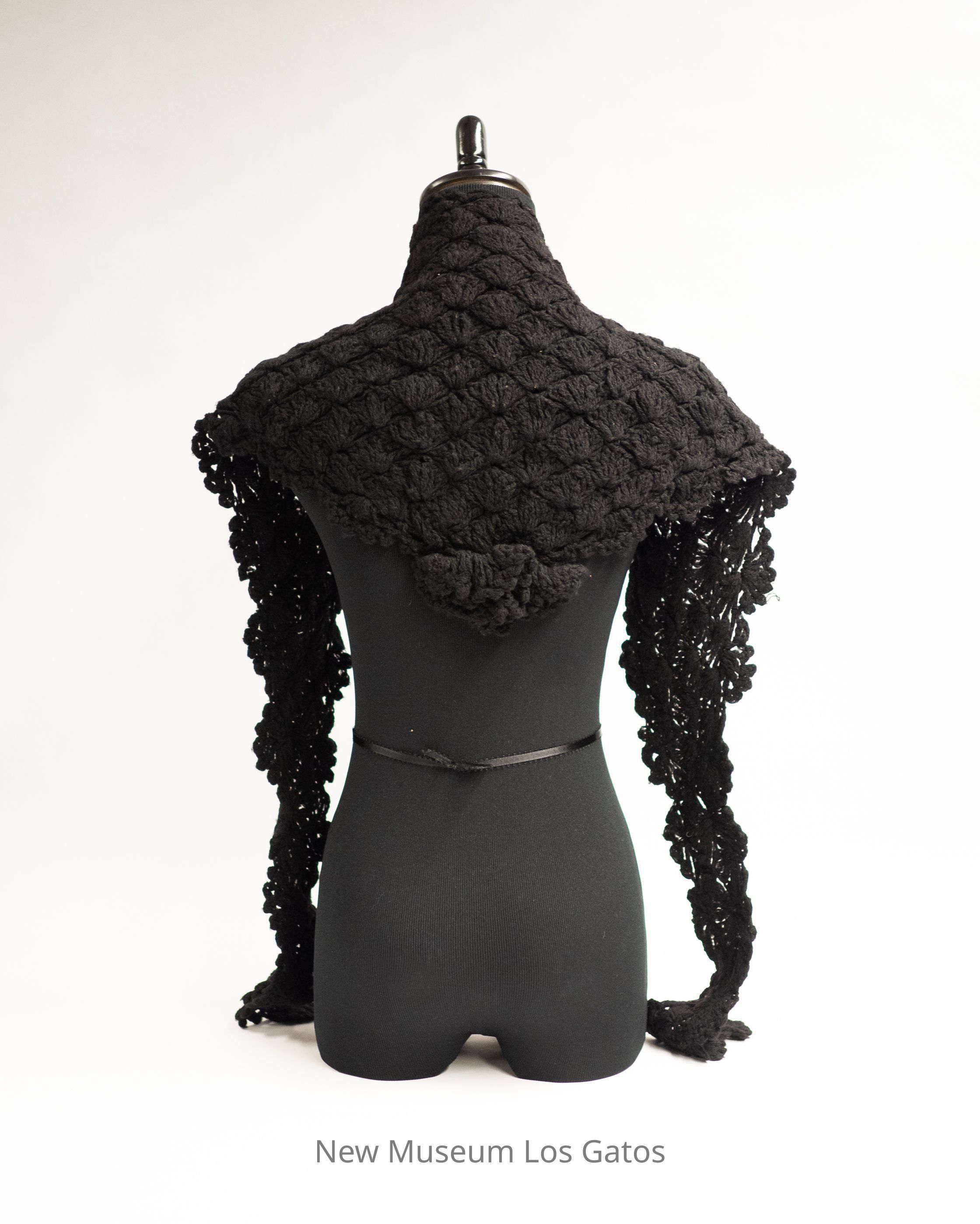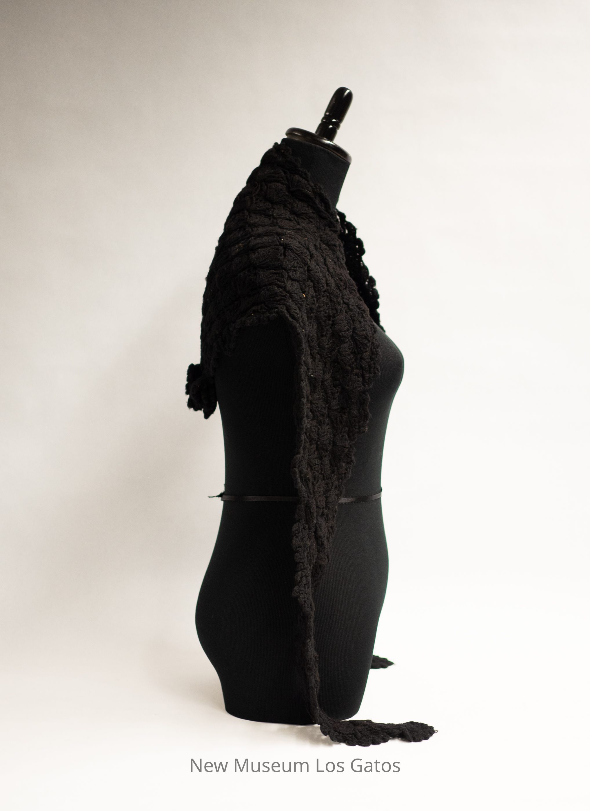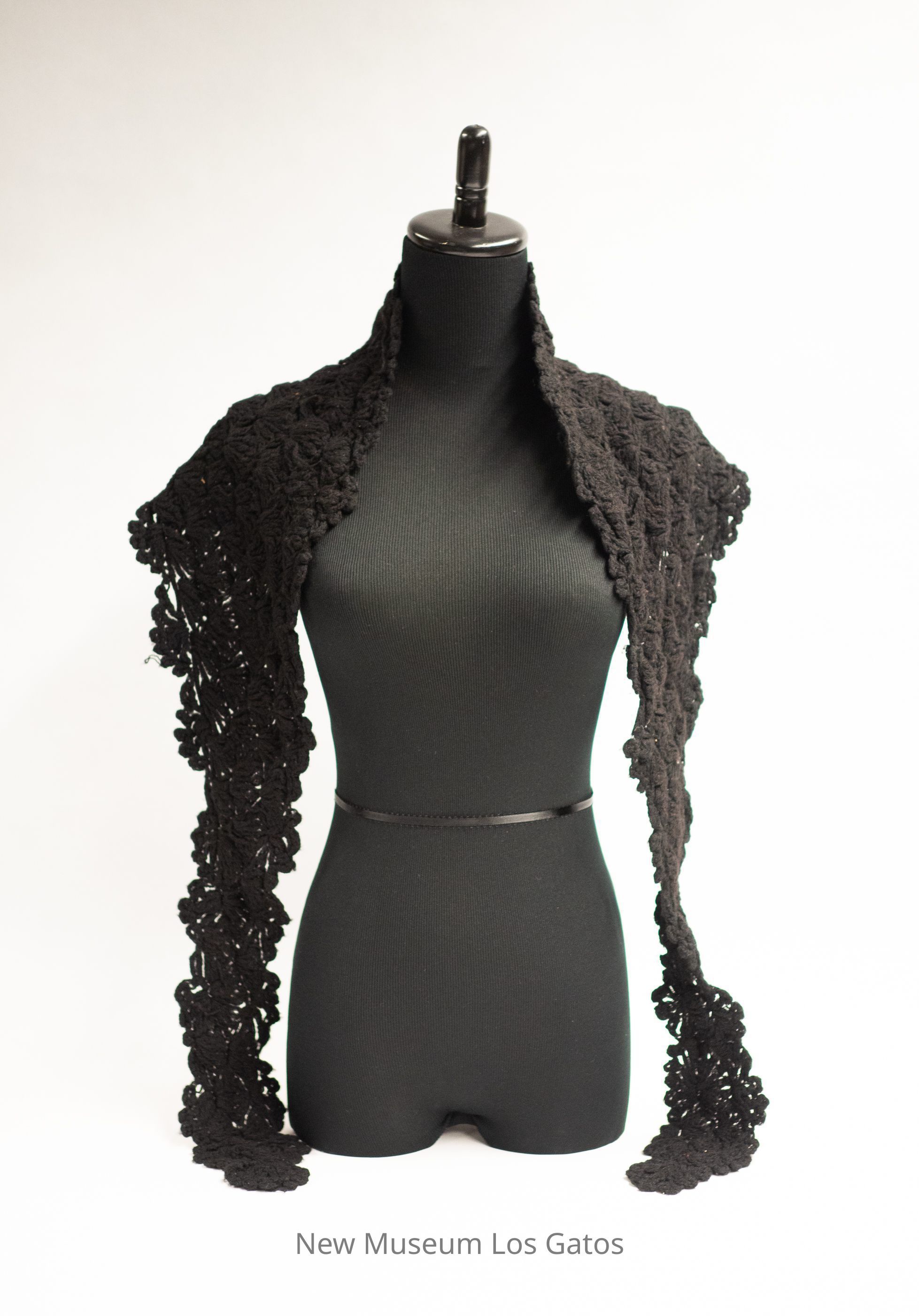 A black, crocheted lace shawl. The shawl is roughly triangular in shape, with long, skinny ends. There is some sort of decorative element, maybe a crocheted flower, at the tip of the triangle.Collection