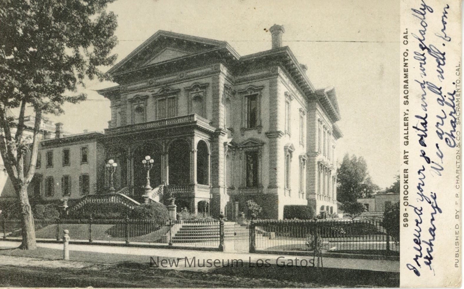 A postcard featuring a black and white photograph of the Crocker Art Gallery, which consists of a large, ornate building behind a small fence.Subject