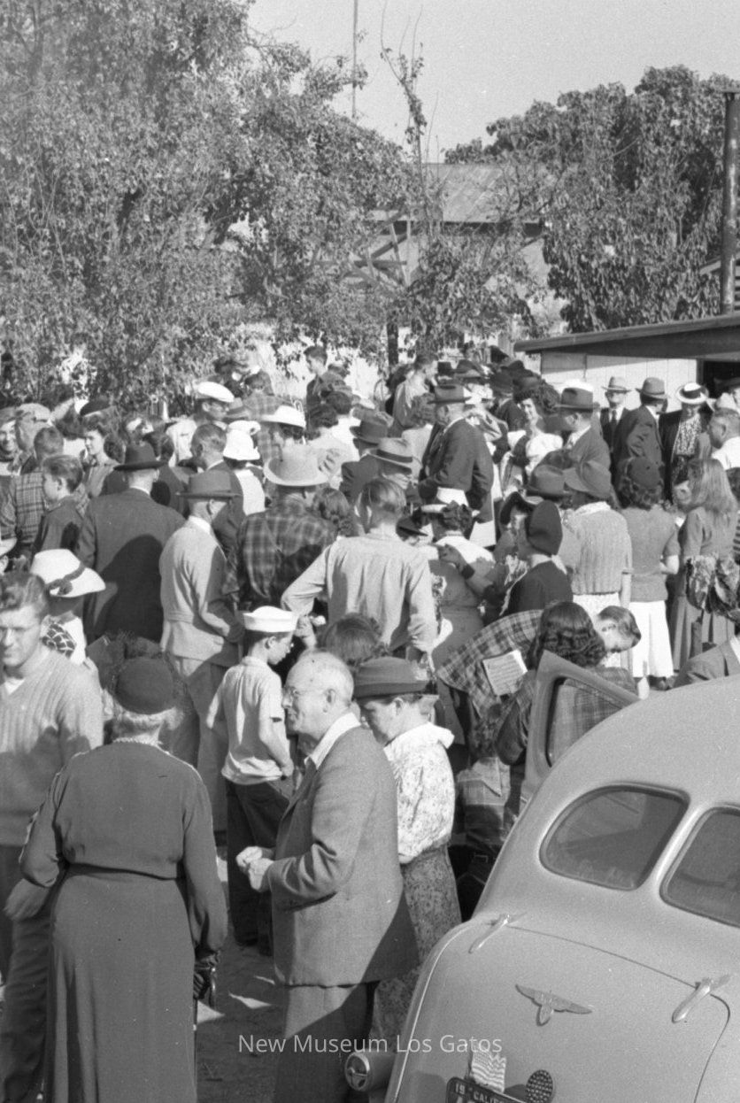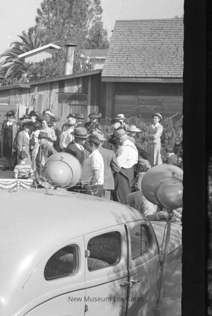 A black and white photograph negative, depicting the crowd at the golden spike ceremony for the Wildcat Railroad on October 16, 1943. The image has dozens of people standing around, with a car in the lower right foreground, and the train off to the left-center.