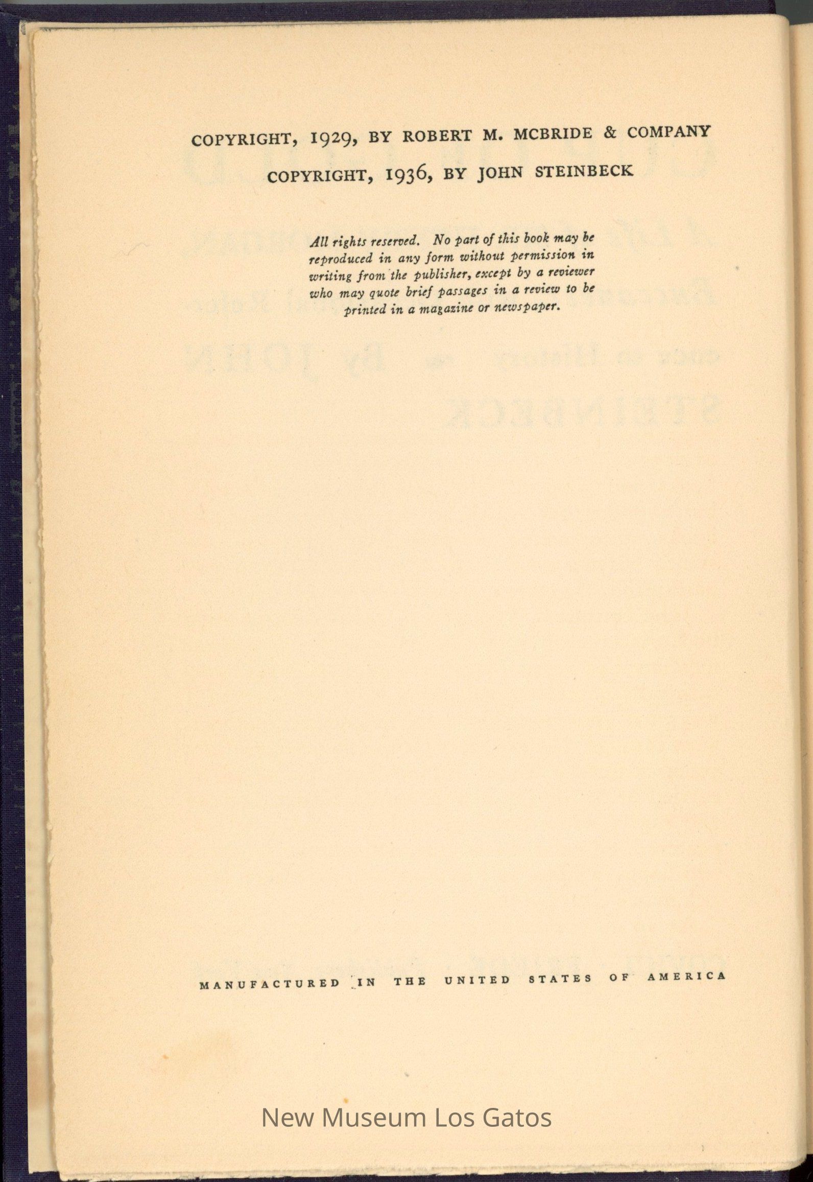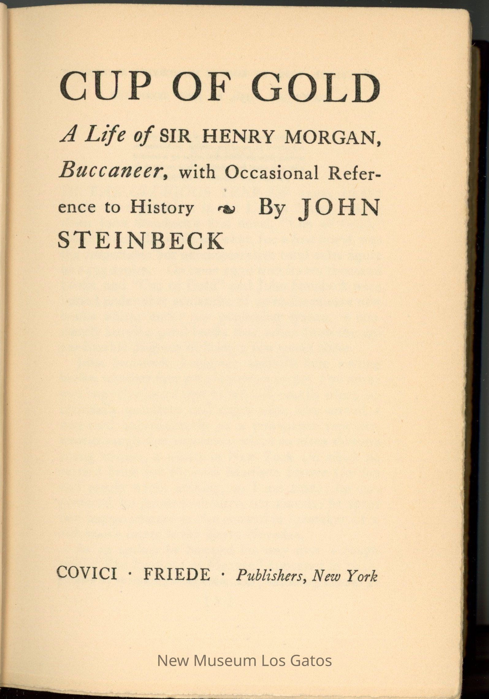 A navy, fabric-bound book with a ship and a map decorating the front cover. This work of historical fiction is John Steinbeck's first novel.Collection