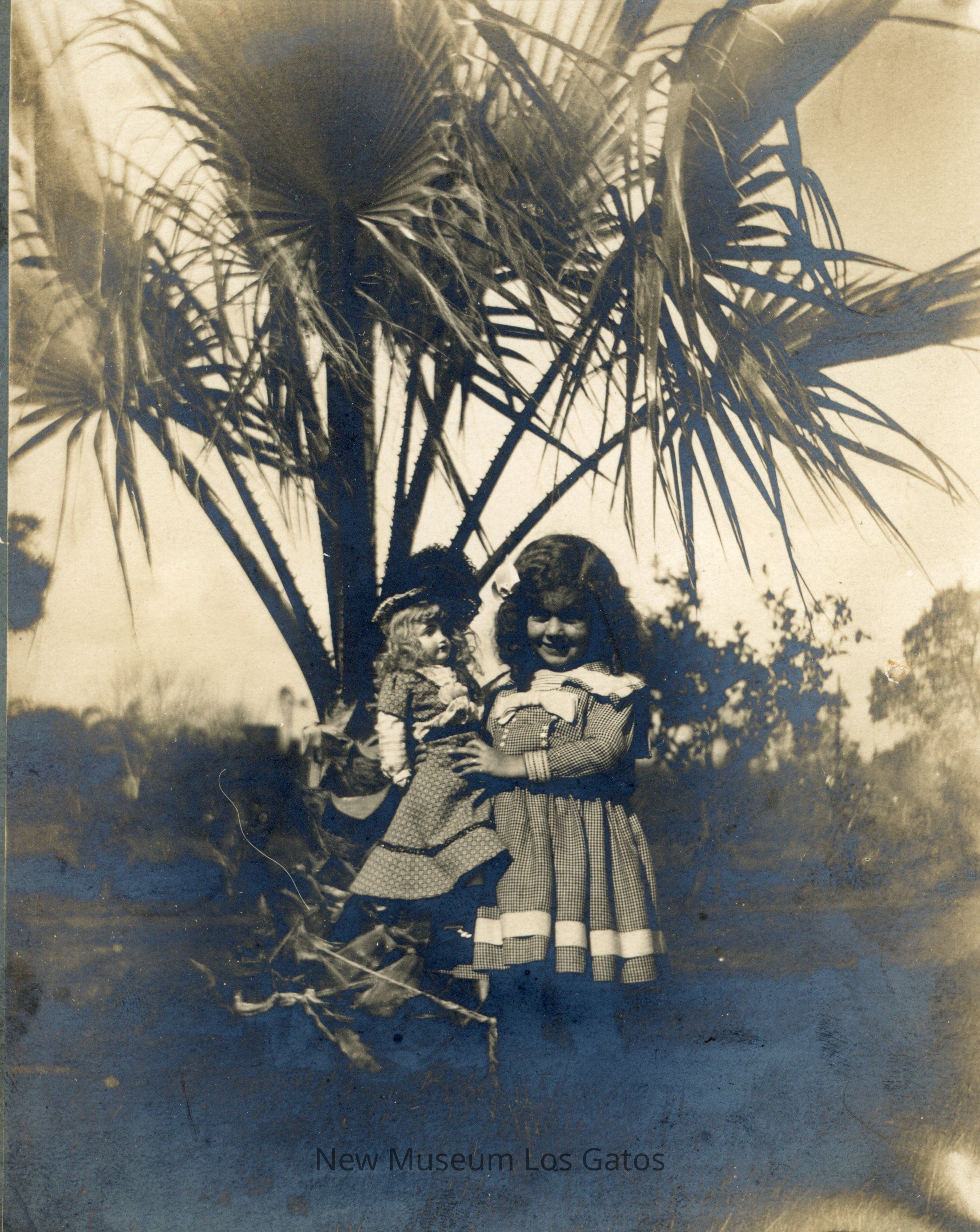 A black and white photograph of Marjorie Hanrahan, holding her doll. She is wearing a checkered dress, and is holding her doll, who is wearing a similar dress, and hat. There is a small palm tree behind Marjorie.Photograph Details