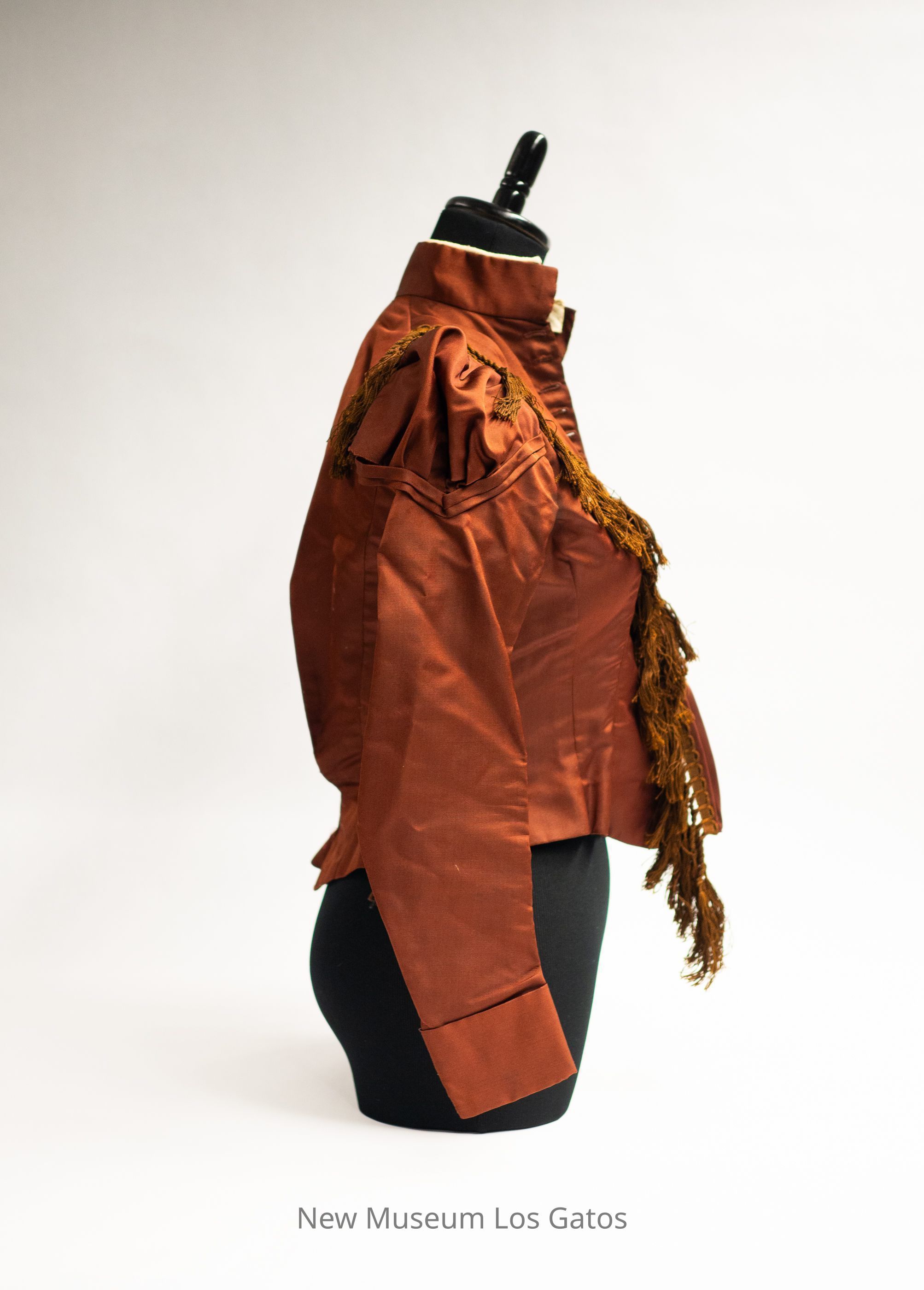 A long-sleeved, wine-colored silk dress bodice with tasseled fringe detailing. The shoulders are puffed, and there is brown fringe along both sides of the front. The back of the bodice is open in the center, where an undershirt would most likely be visible. The bodice opens in the front, and closes with a mix of 15 hook-and-eye clasps and eight large silver buttons with rhinestone and red detailing. There is an interior waistband, to provide structure to the bodice.Collection