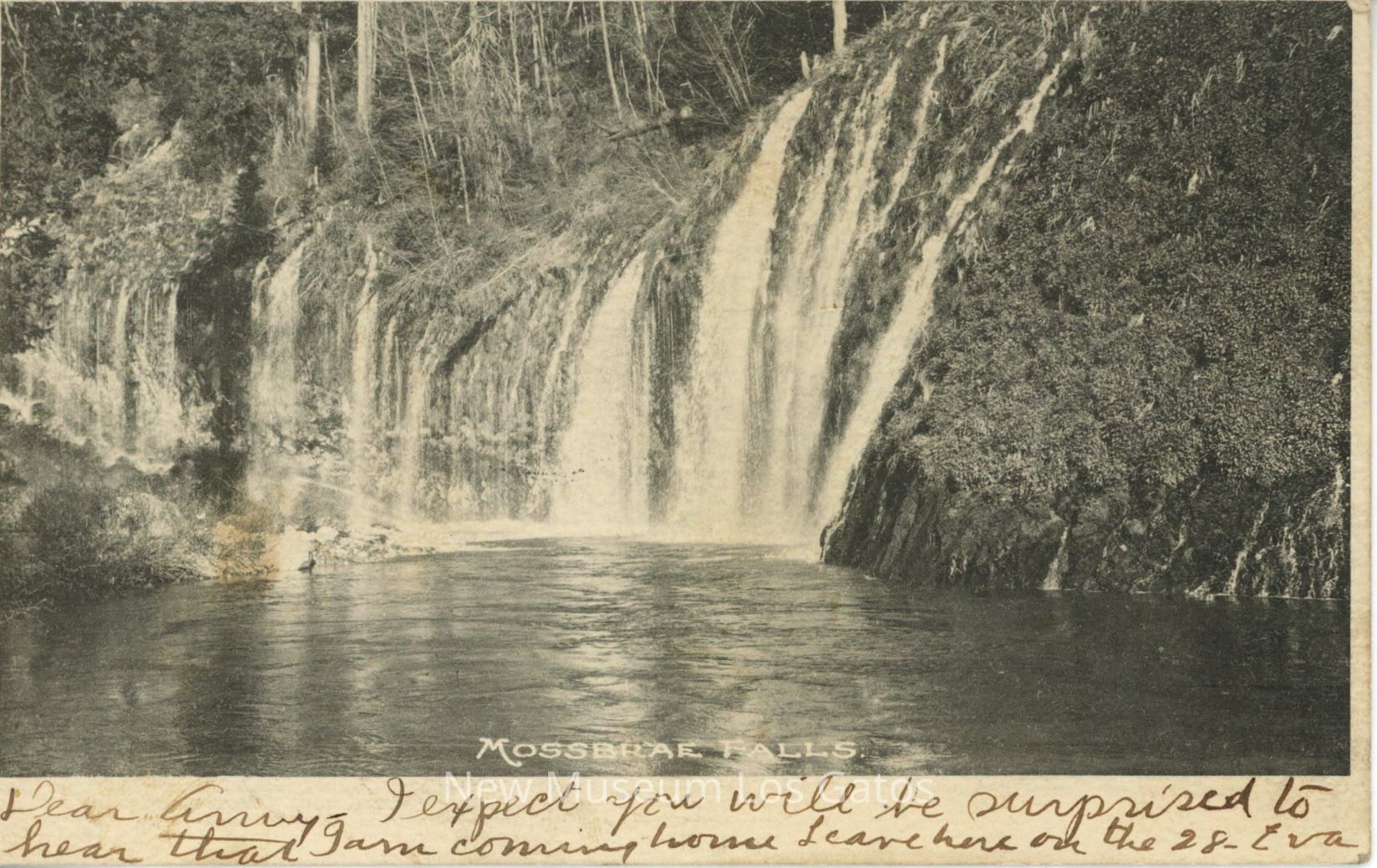 A postcard featuring a black and white photograph of Mossbrae Falls.Subject