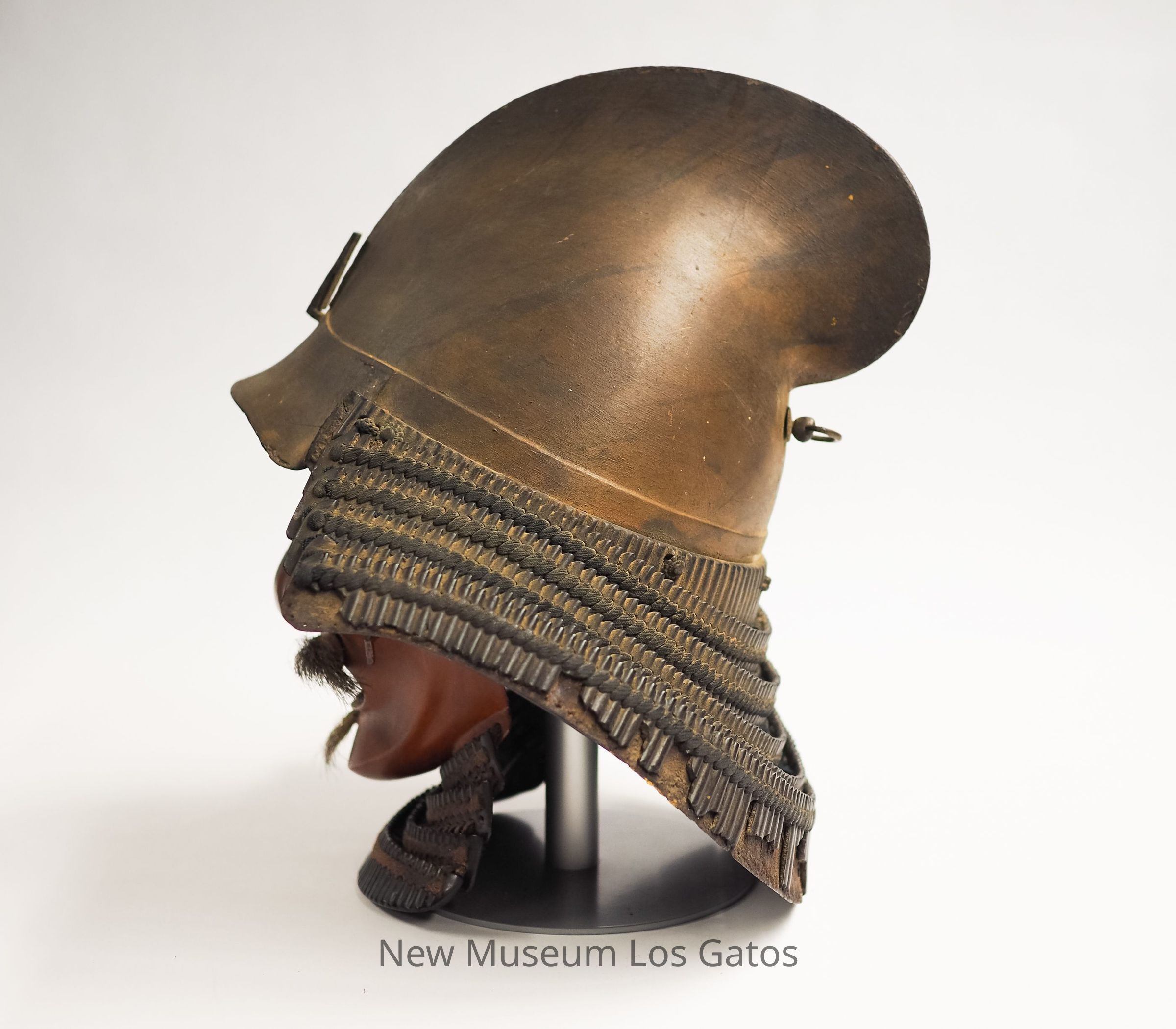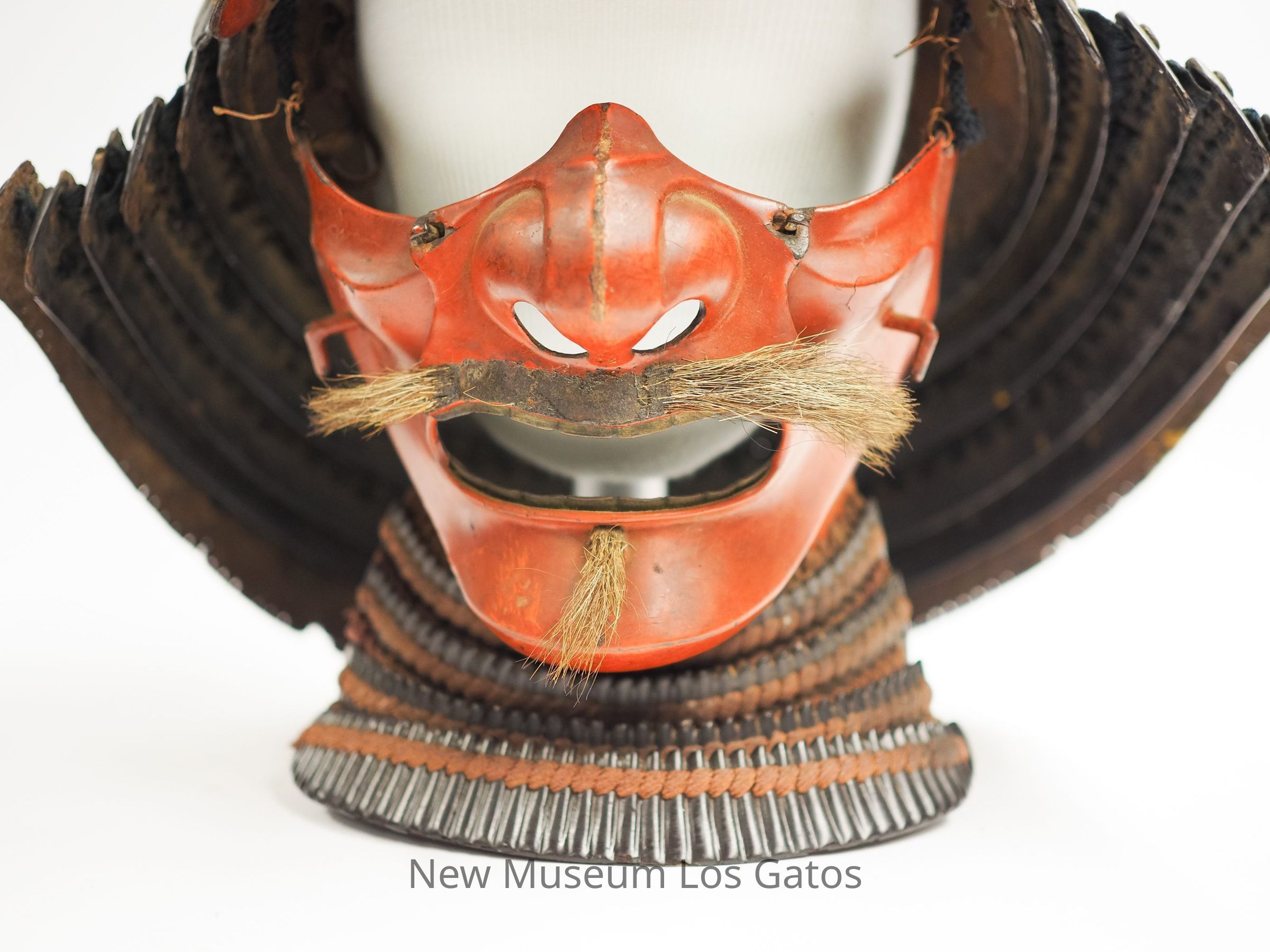 A samurai battle helmet, known as a kabuto. The iron helmet is domed and curved, and has a plain hook on the front, where a crest (usually an animal) would go. Attached around the back of the helmet is a neck guard, consisting of six tiers of metal with braided fabric. Attached to the front of the helmet is a metal face guard, or menpo, shaped like the face of a man, that has been painted red and has faux mustache and goatee hair. Attached below the face is an additional neck guard, that features four tiers of metal and braided fabric.Collection
