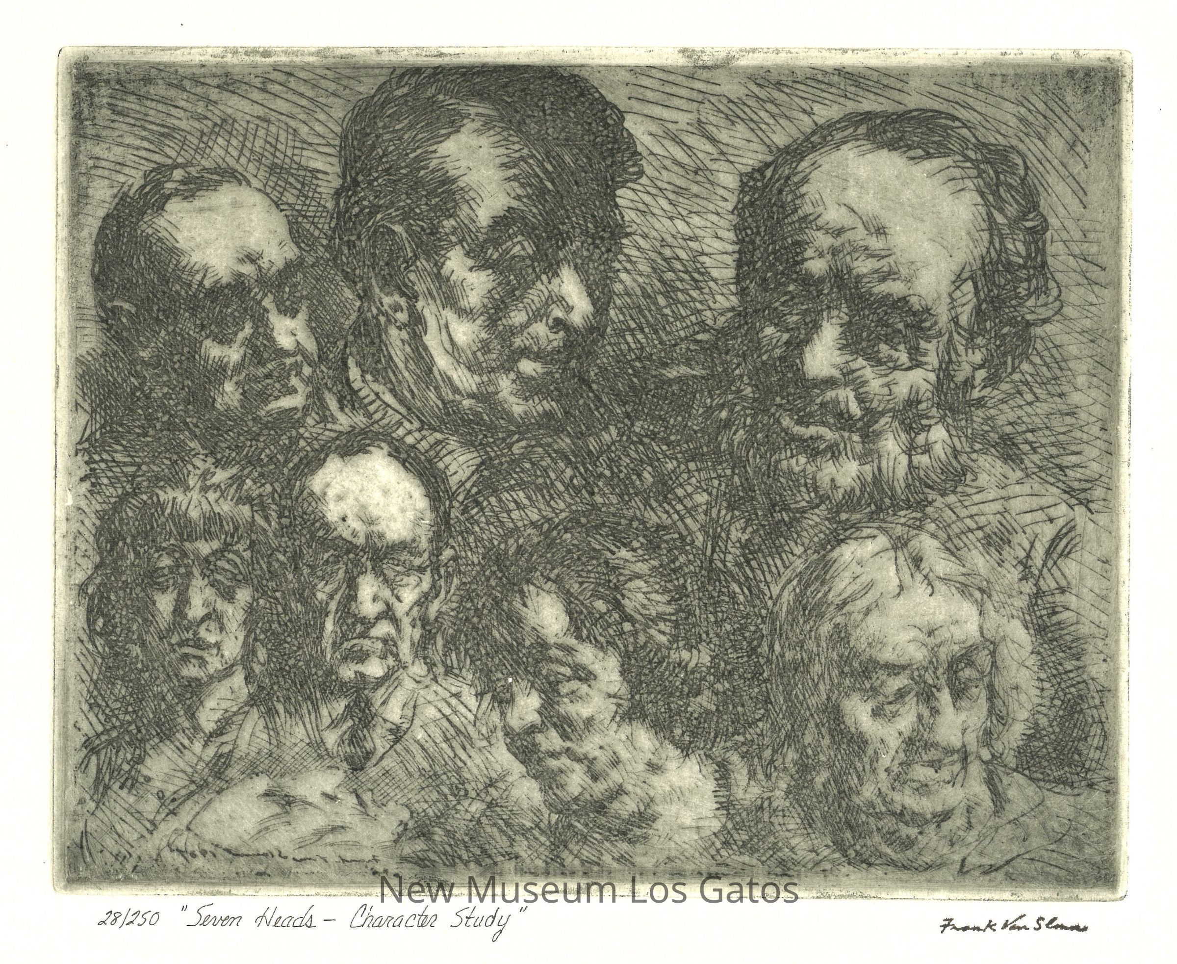 A monochrome print of seven portrait studies. The print is hinge mounted onto a mat board.