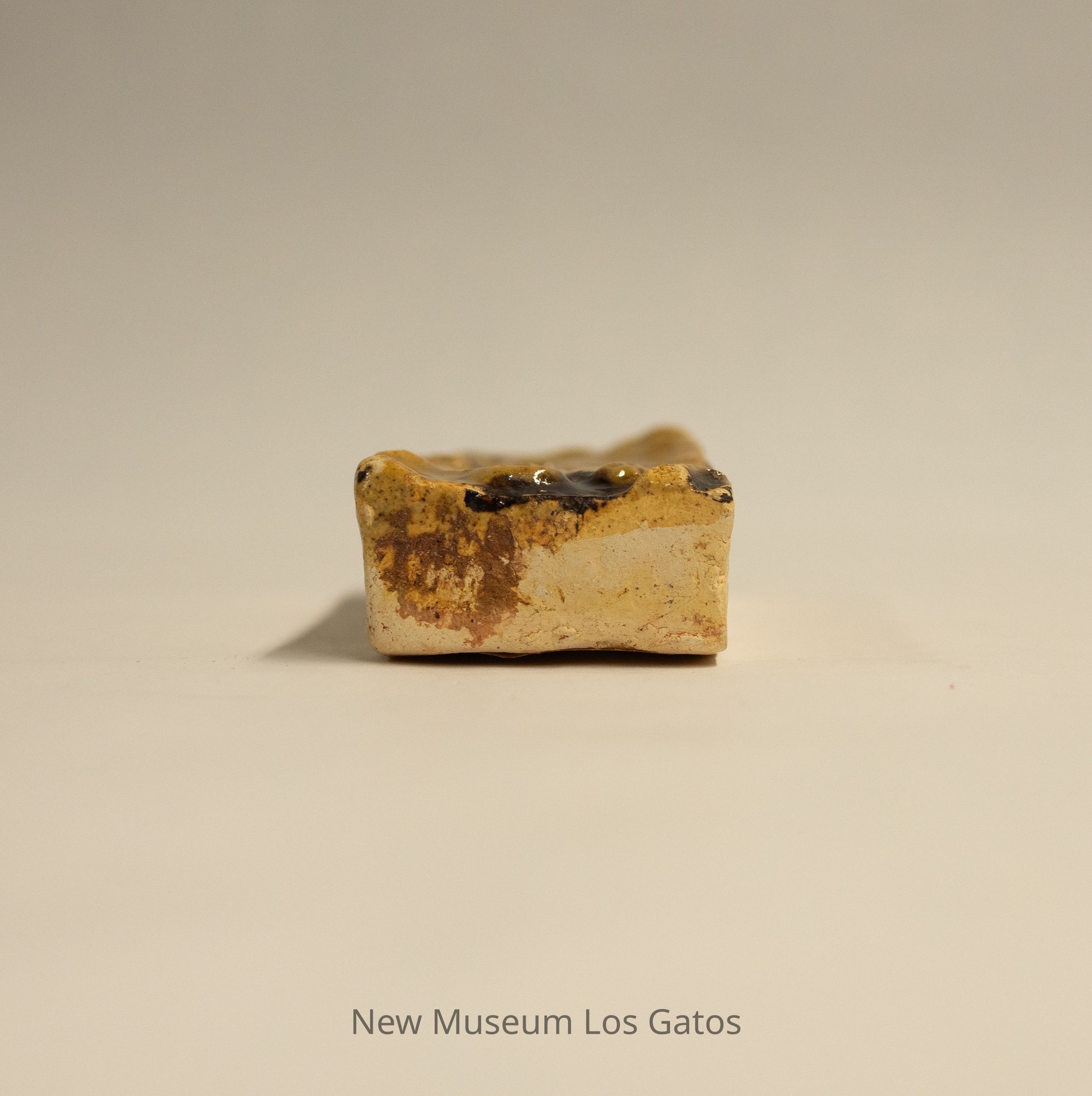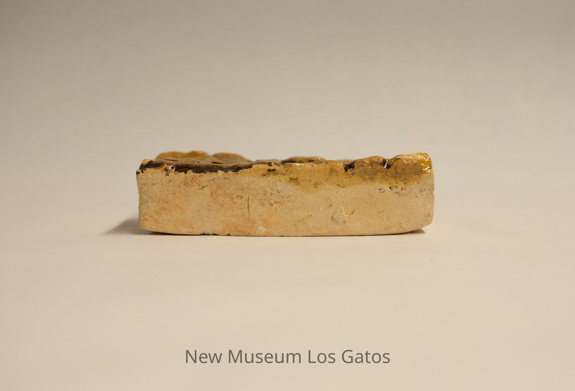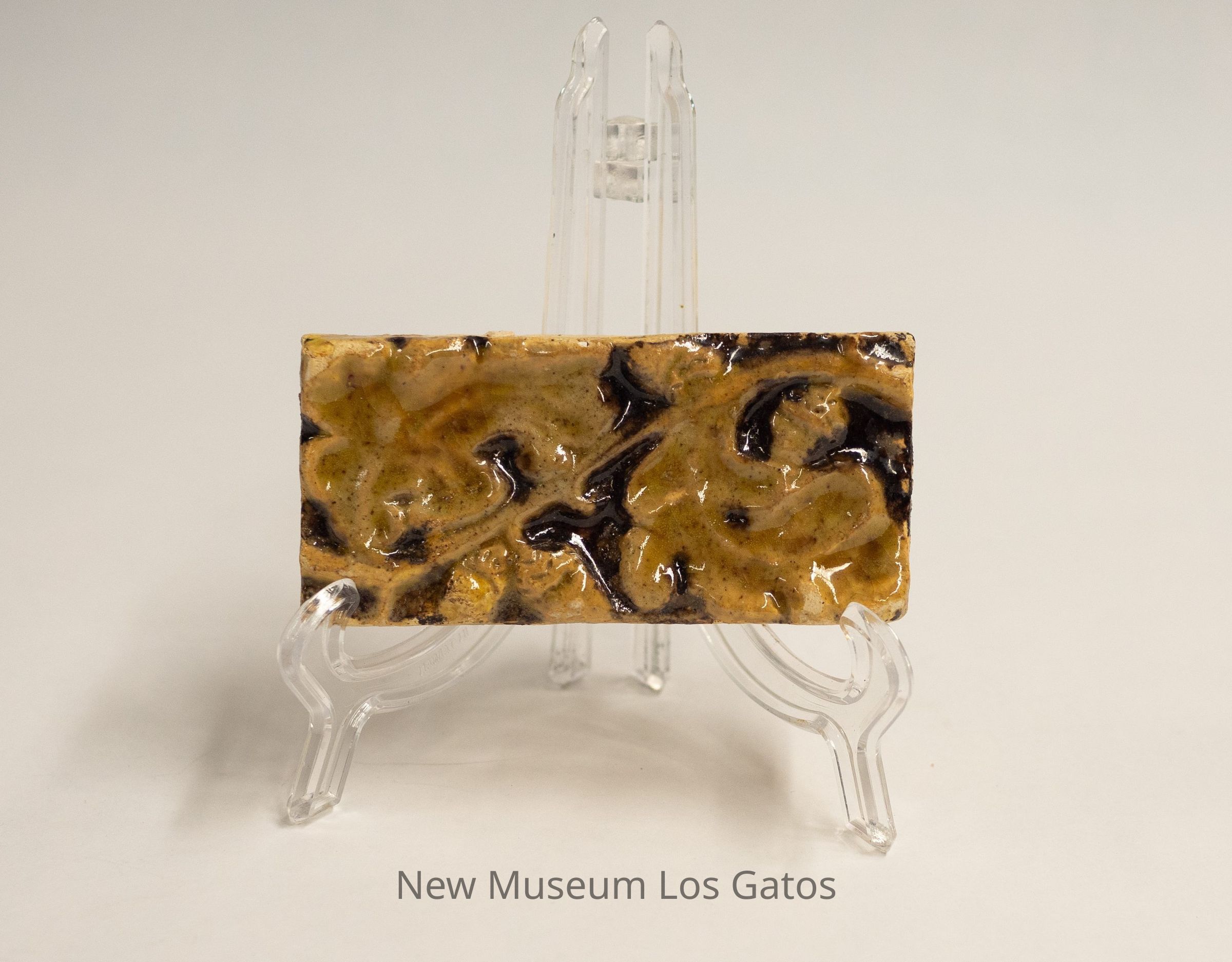 This tile came into my possession with raw glaze, that is, the tile had glaze applied but then was left unfinished ― without being given a (second) glaze (or glost) firing. Only the clay had gone through the fire. In 2005, as an experiment, I had the academic potter here at U. of Illinois, Don Pilcher, fire it and what you see are the results.
