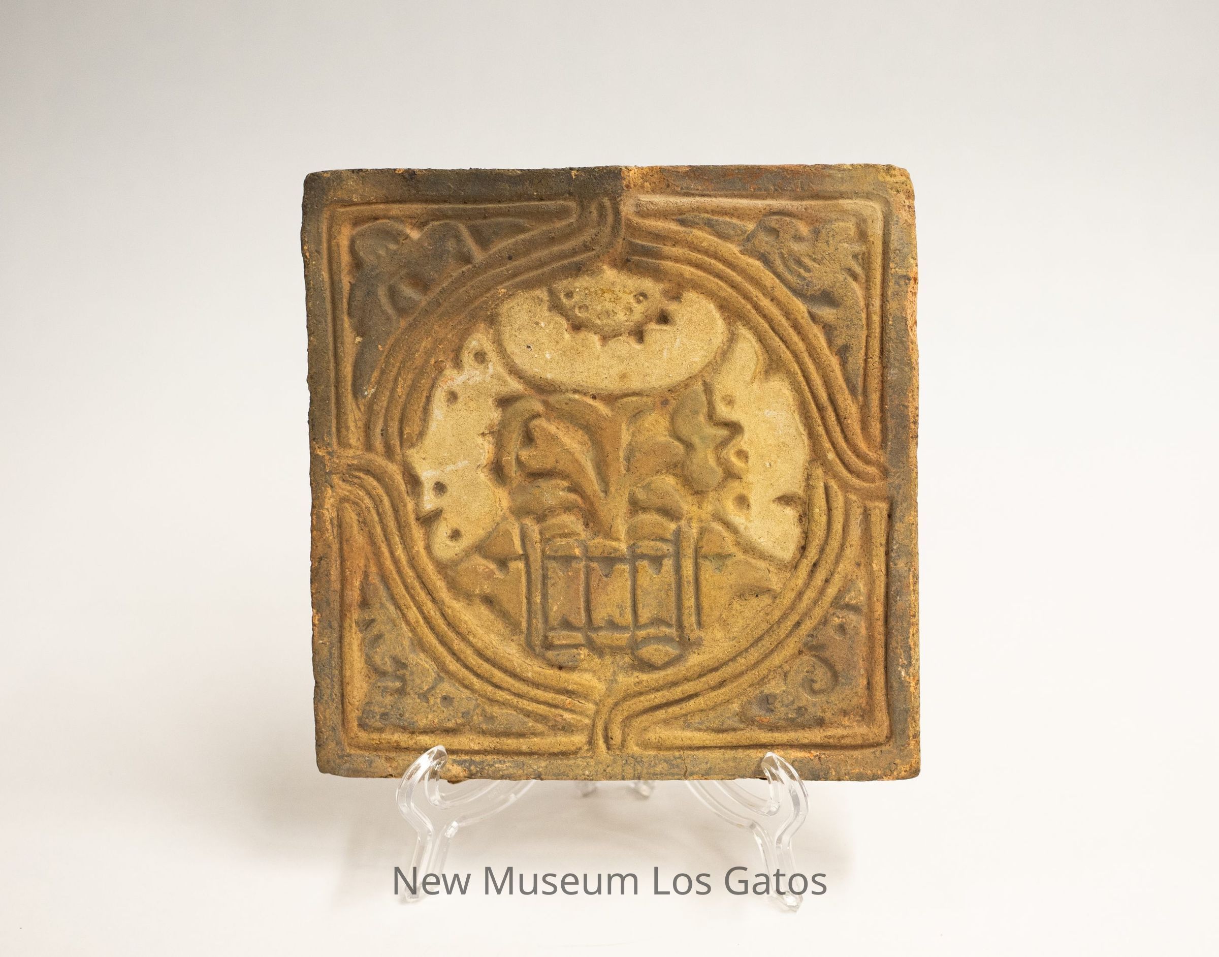 Tile was made by an unknown student of the Cathedral Oaks school, under the direction of Albert Solon, under the design influence of Frank Ingerson and Pedro Lemmos. Design is a knock-off of a 1910 Batchelder design.