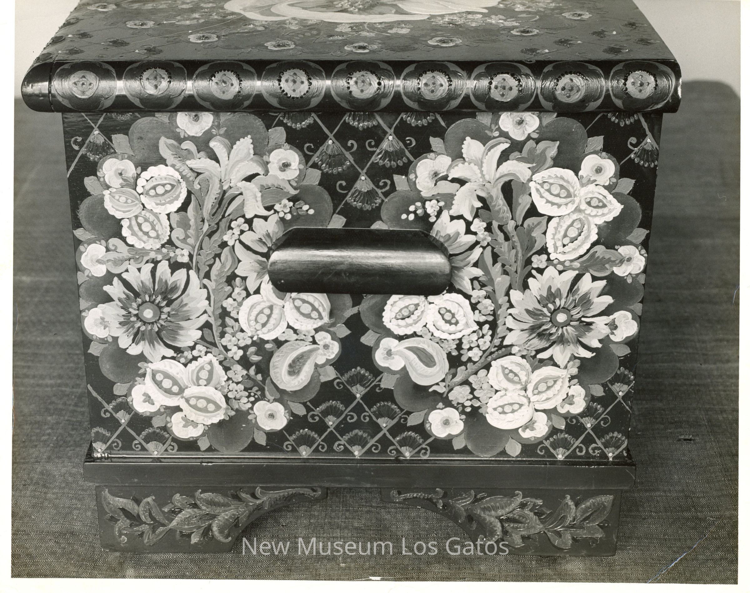 A black and white photograph of a decorative box. The box has painted flowers and diamond shape pattern with a handle in the center.
