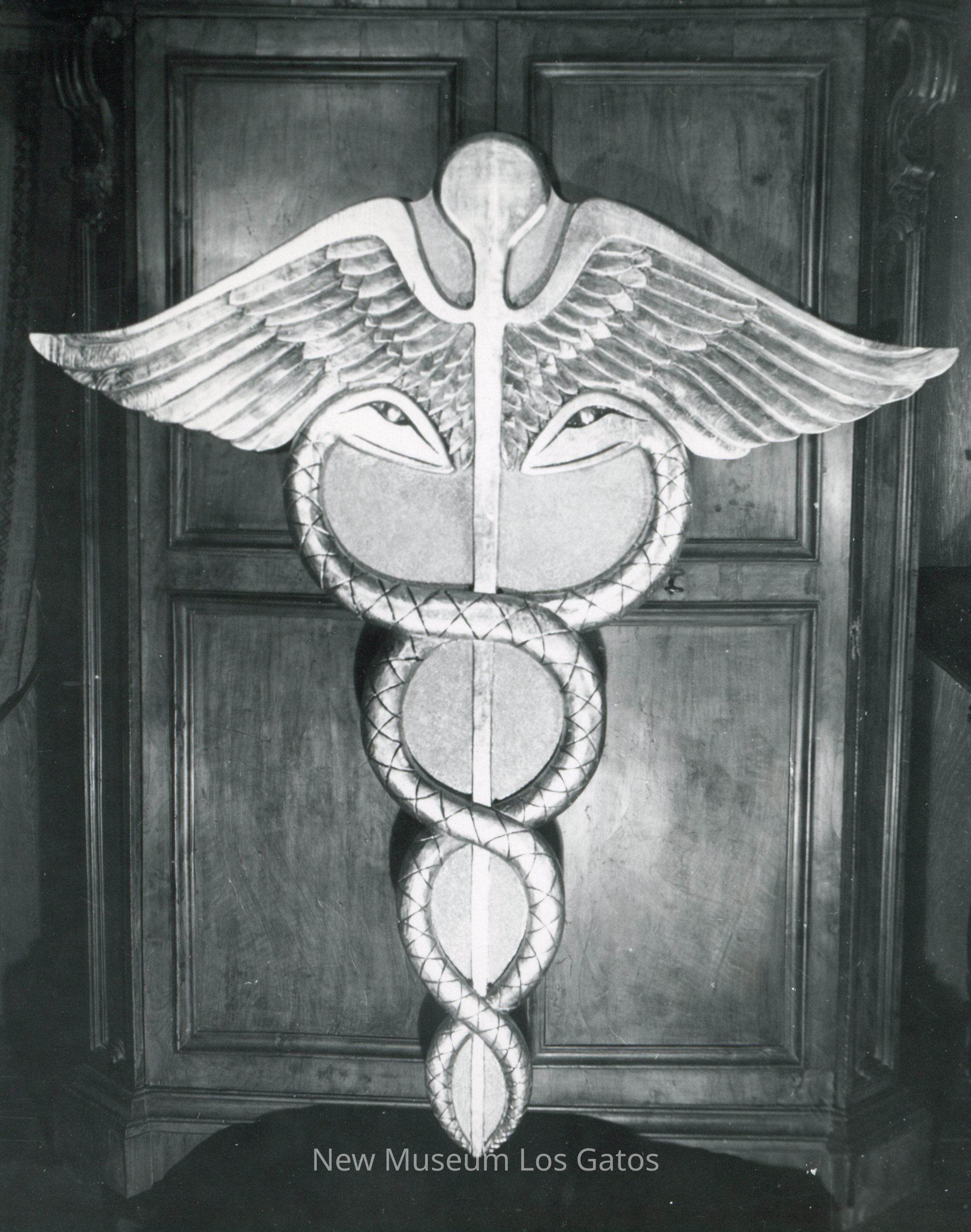 A black and white photograph of a decorative, wooden caduceus sculpture. The sculpture was installed on the Ness medical office building on the corner of Main St. and High School Court in Los Gatos.