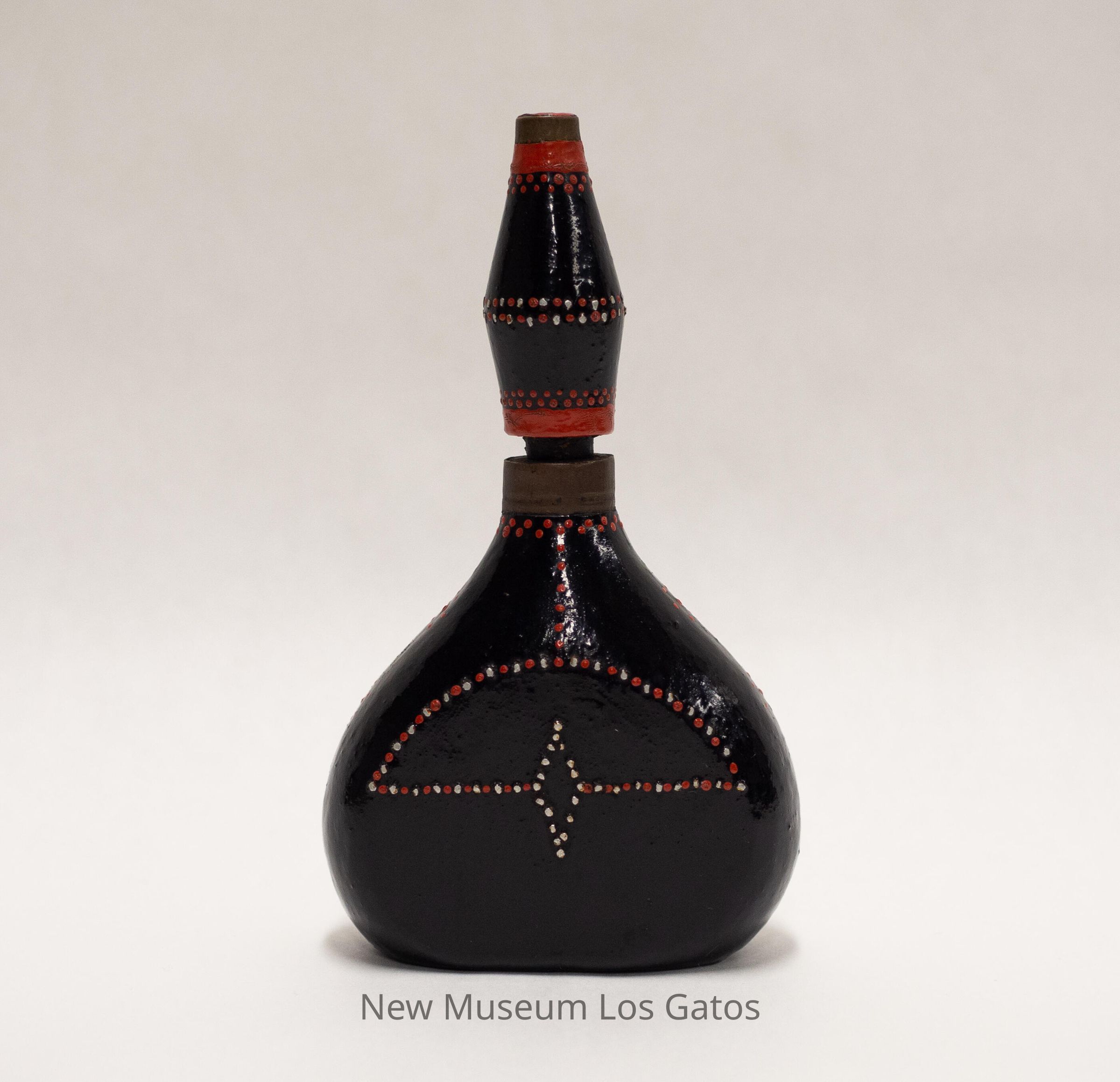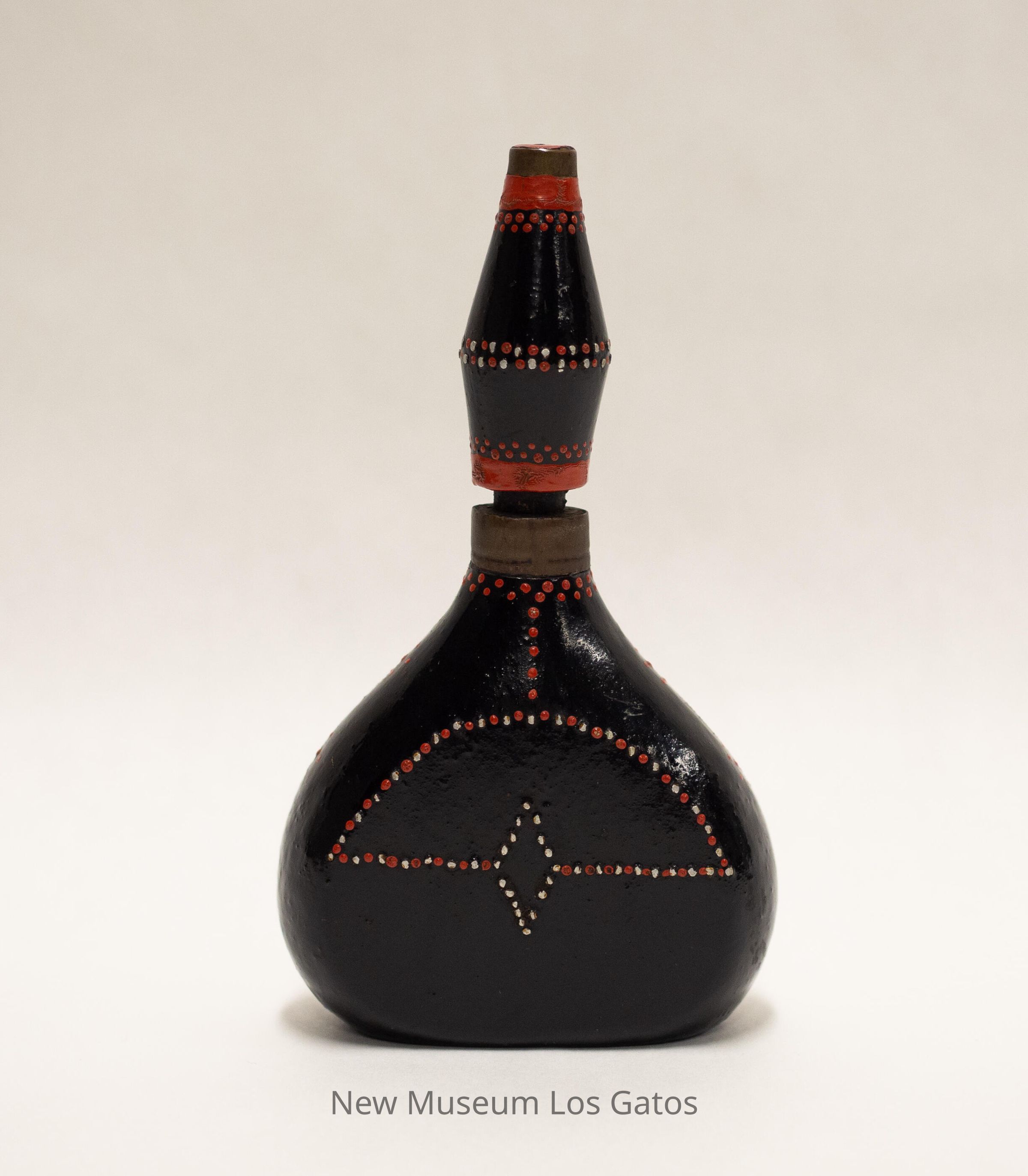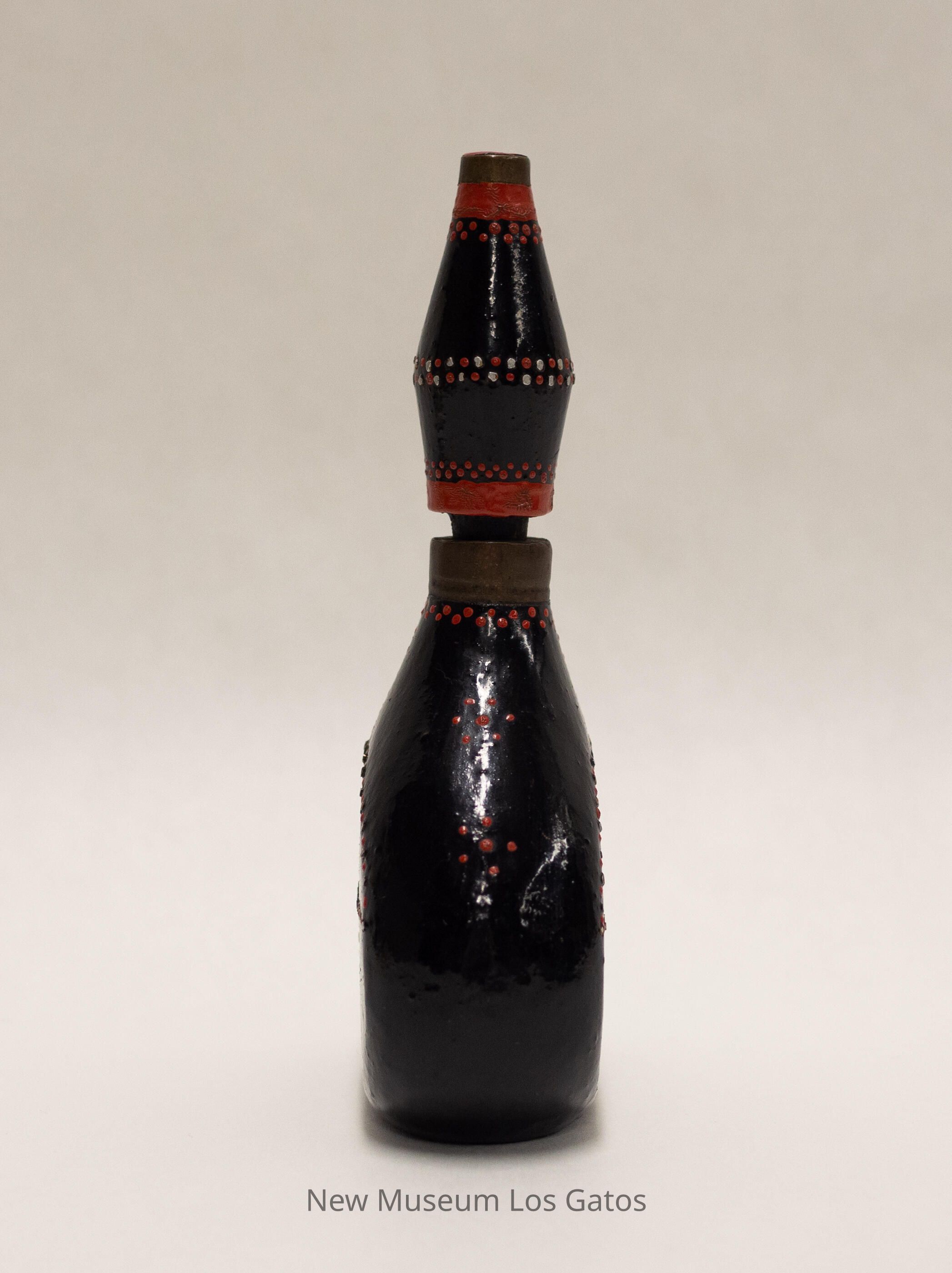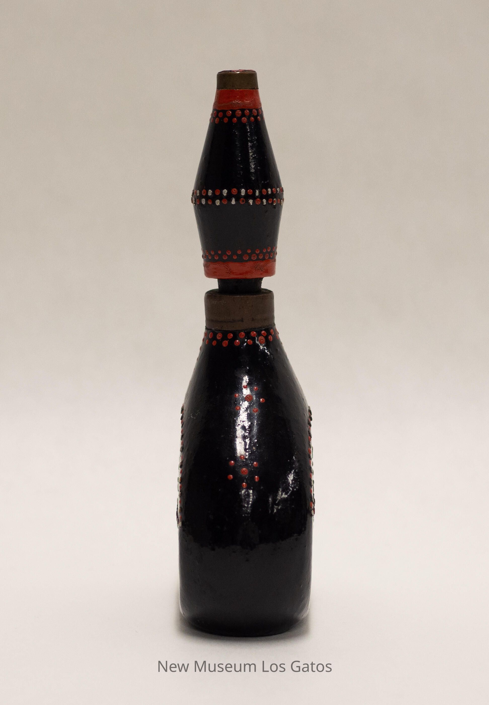 A hollow wooden flask with a removable stopper. The flask is vaguely teardrop-shaped, and the stopper is an elongated cylinder that is wider in the middle and narrow towards the ends. Both the flask and stopper have been painted black, with decorative patterns of white and red dots throughout.Collection