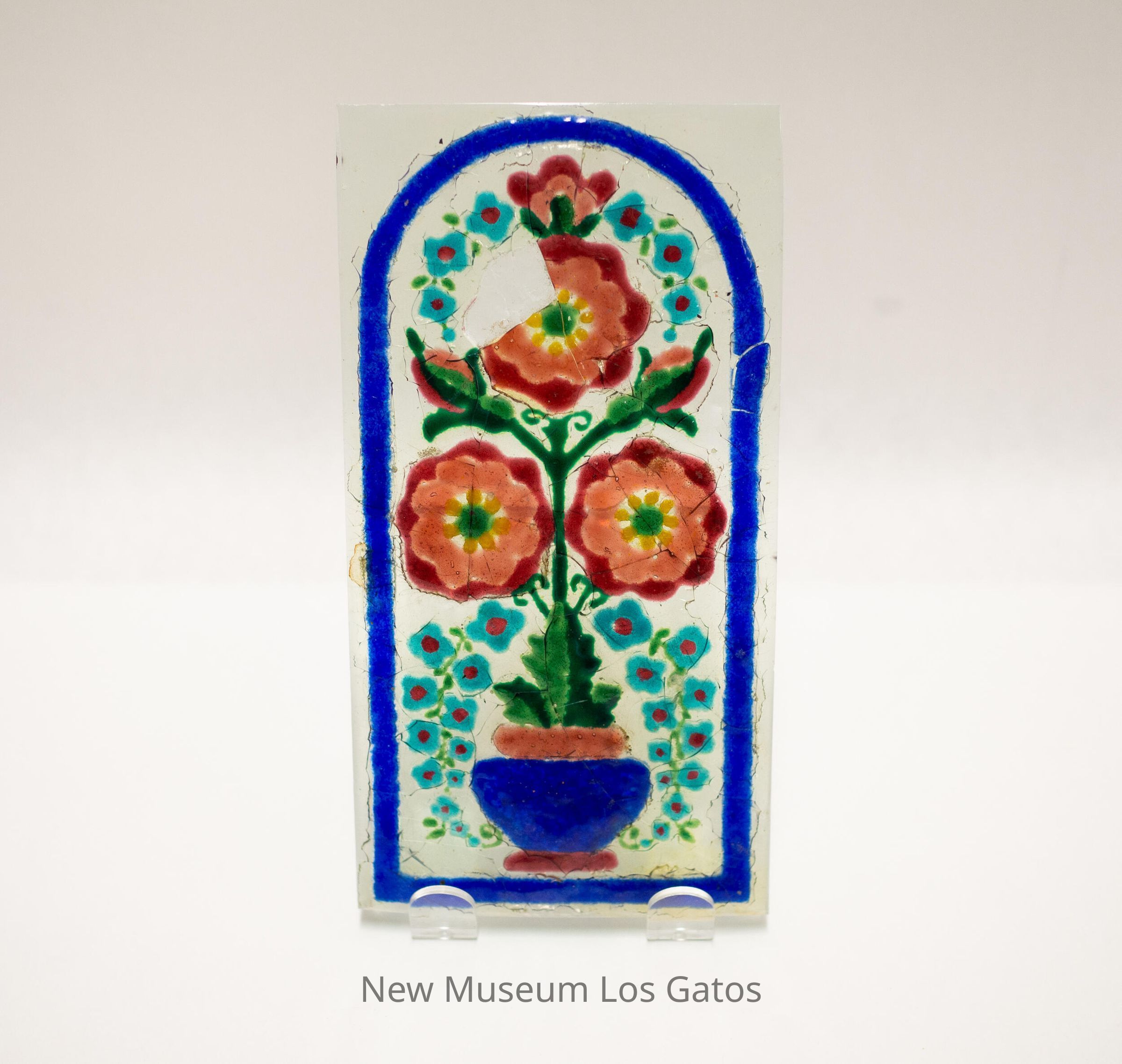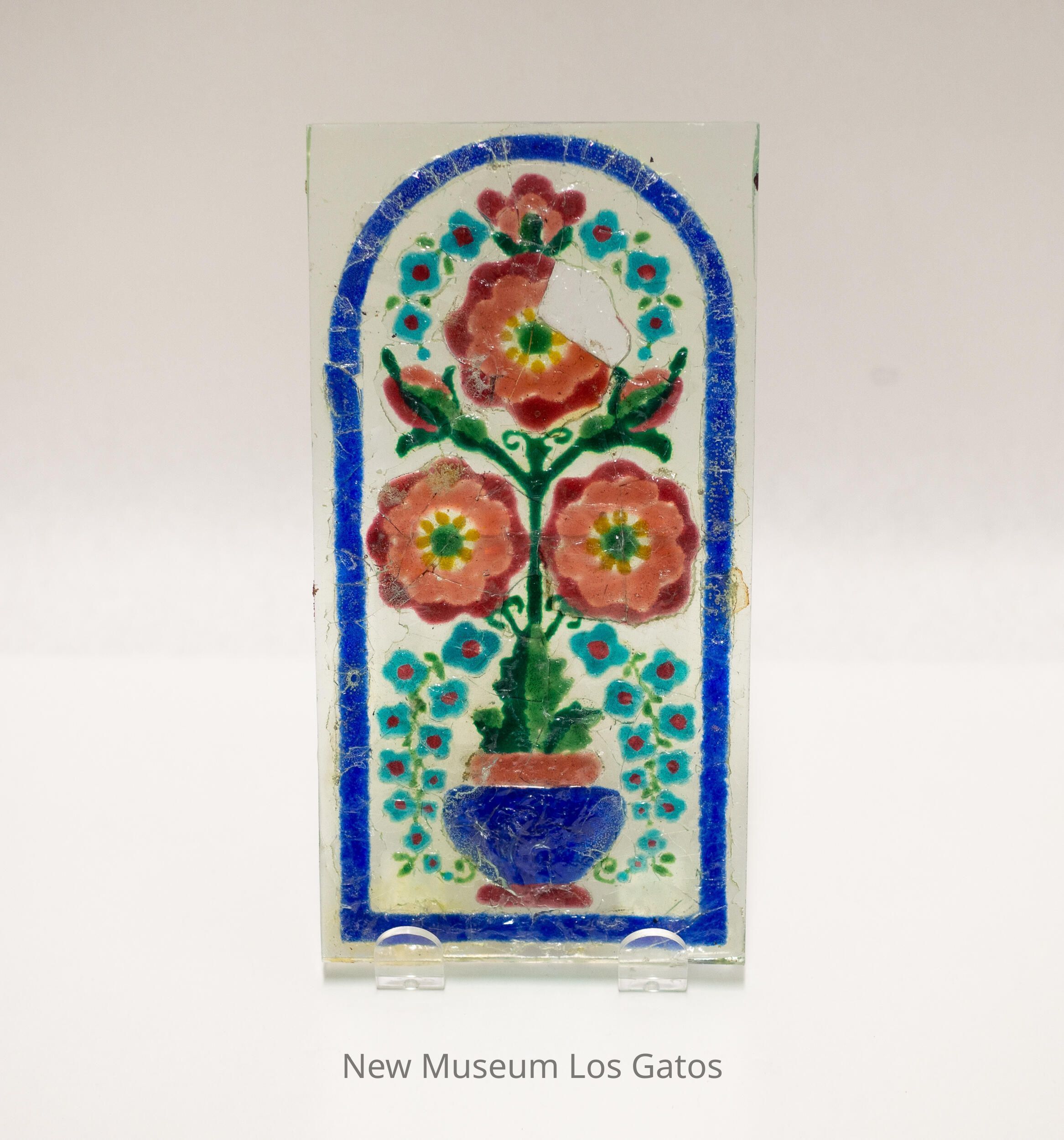 A rectangular piece of fused glass, depicting a flower scene. The background glass is clear, and at the center is a blue and red pot with two-toned red flowers and green leaves. Around the potted flower are numerous small teal and red flowers. Surrounding all of the flowers is a blue closed arch.